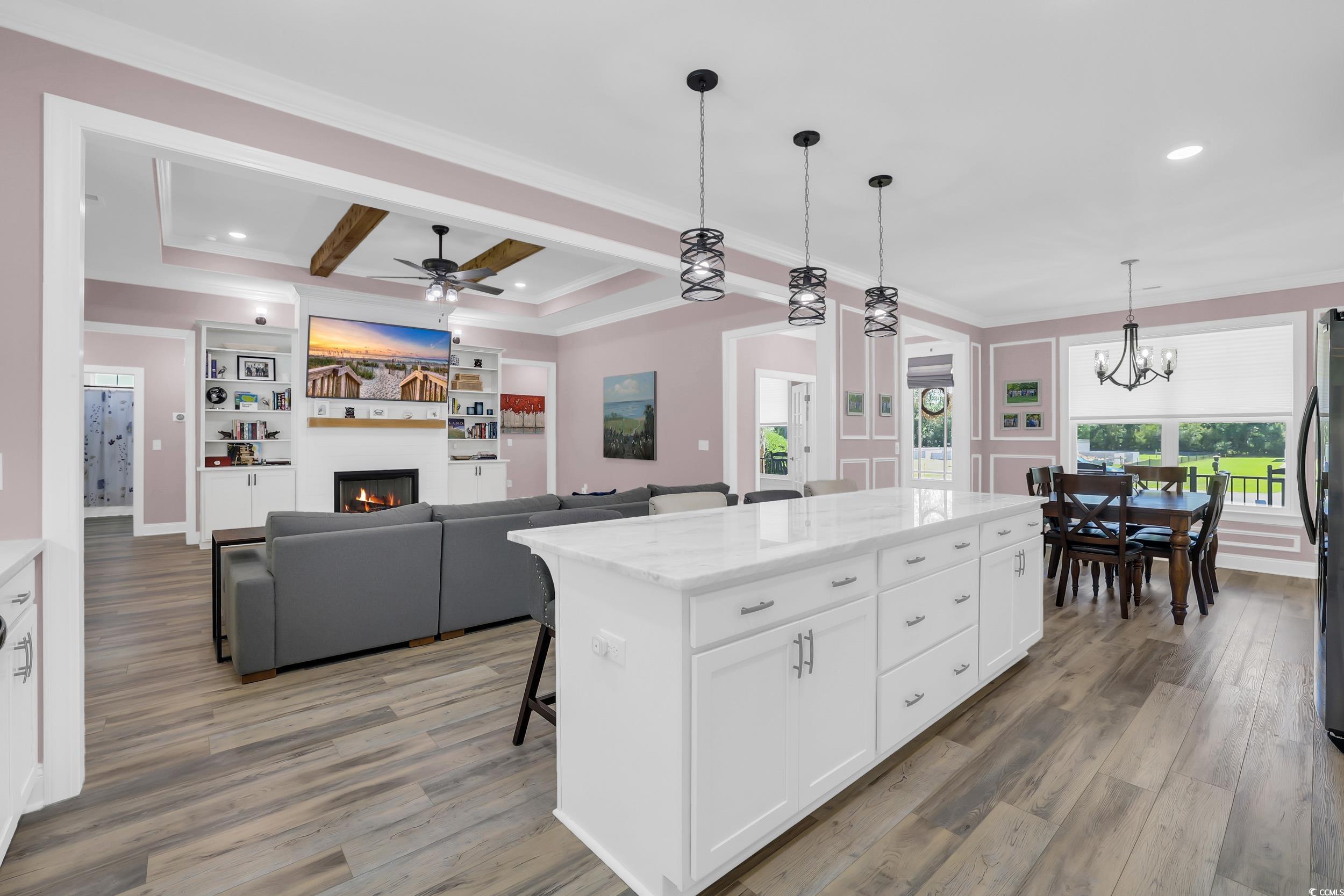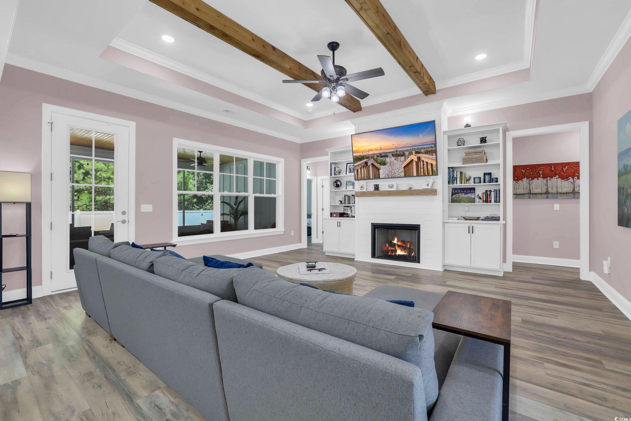 LivingRoom: BeamedCeilings, TrayCeilings, CeilingFans, Fireplace