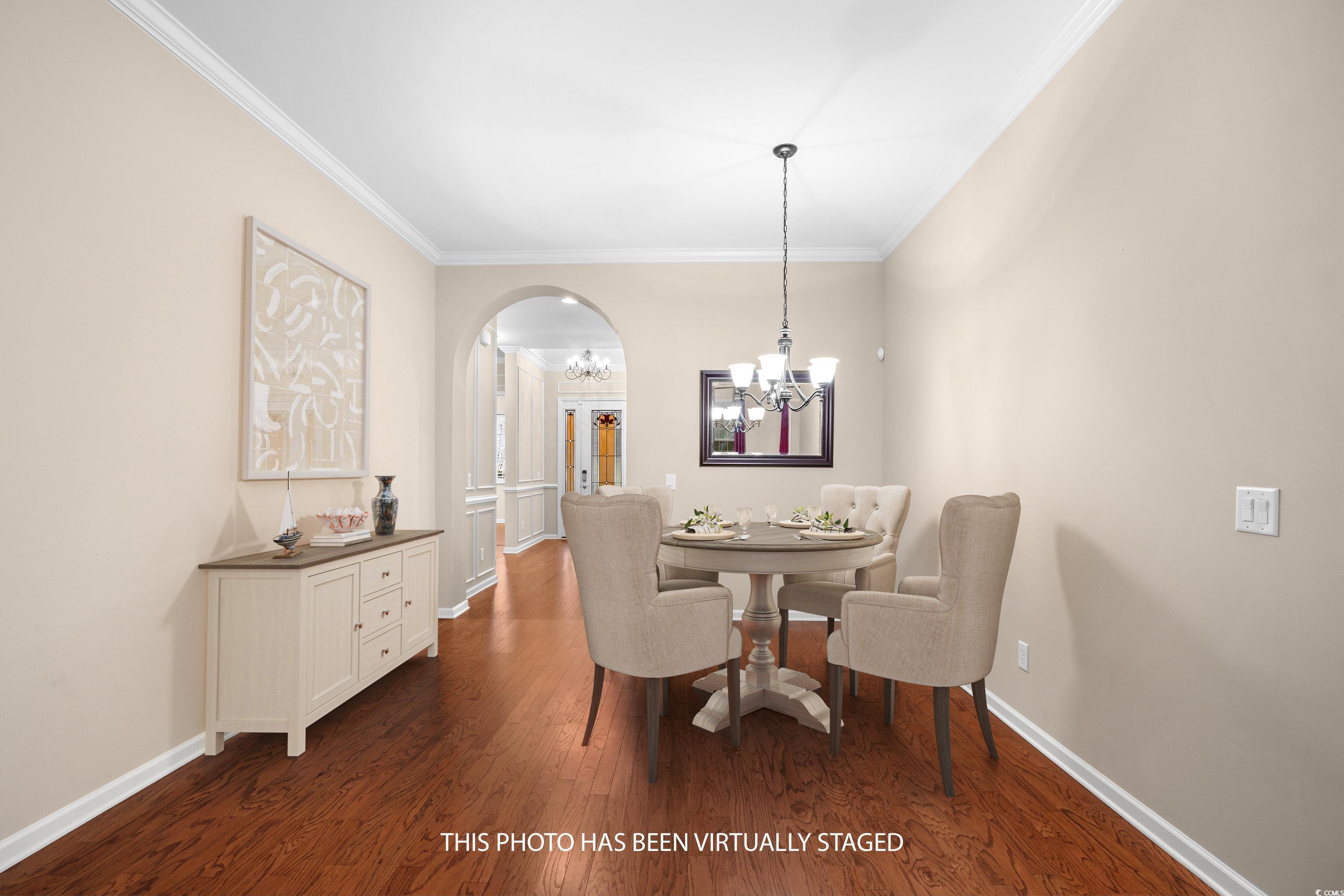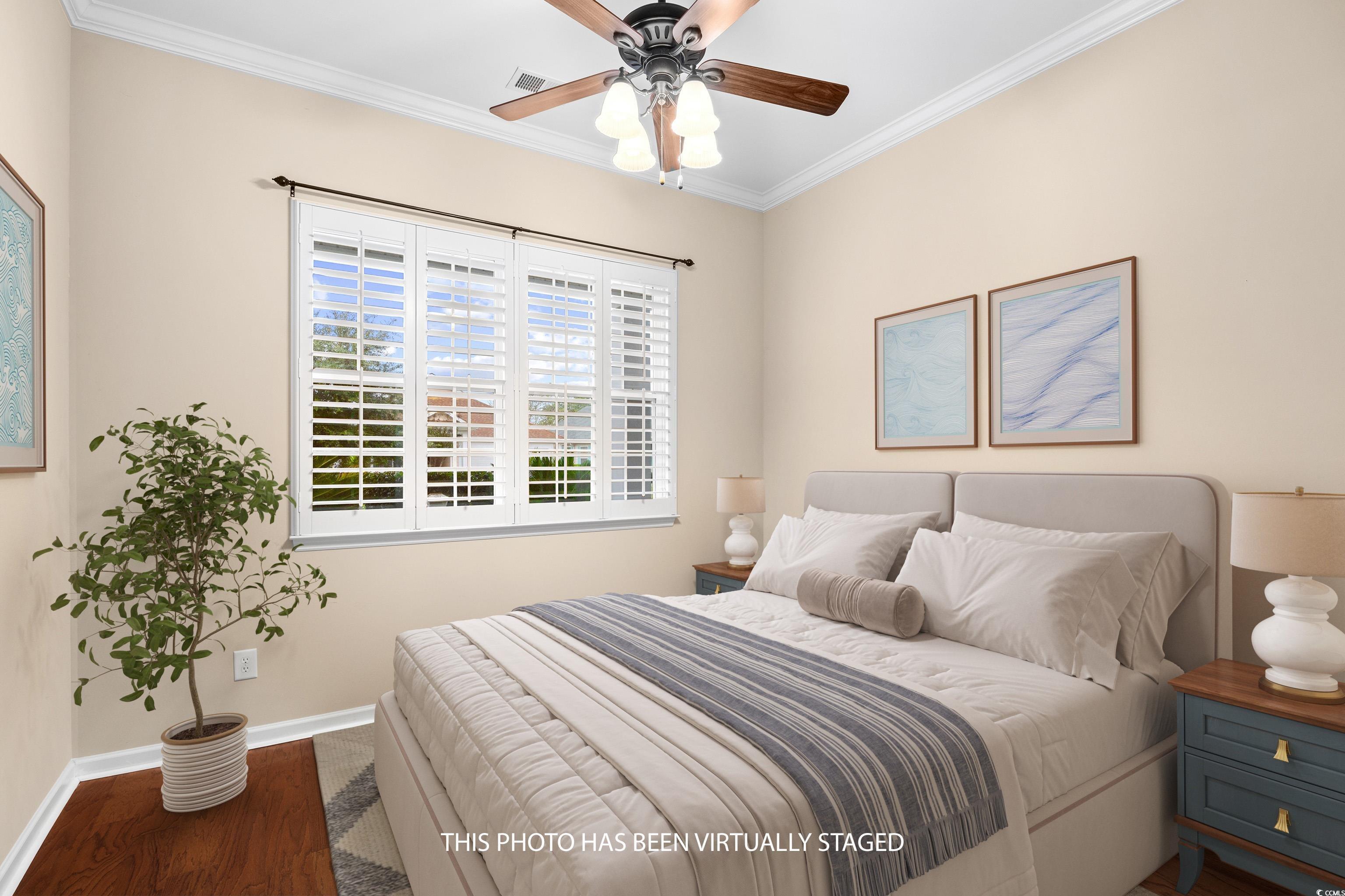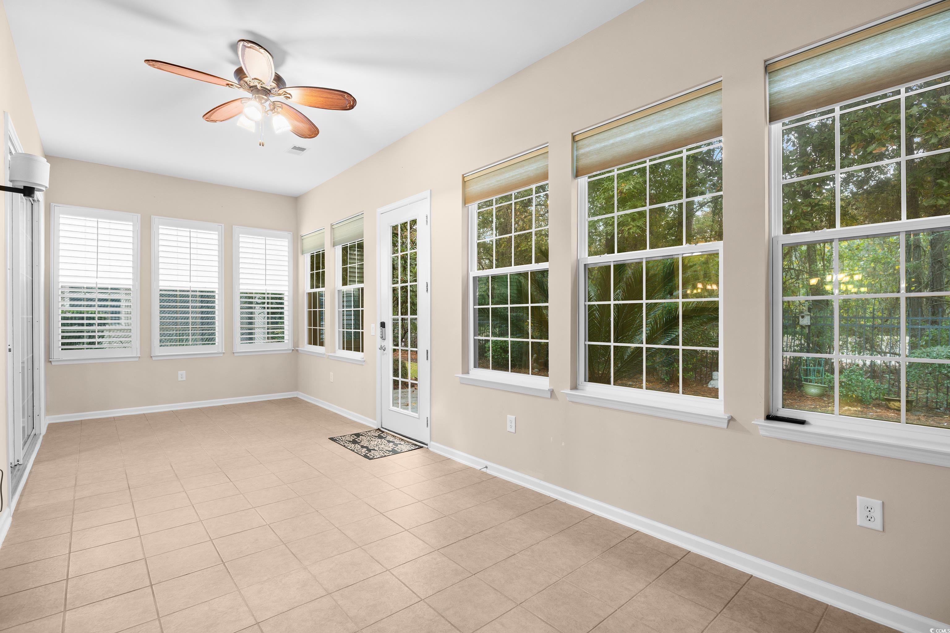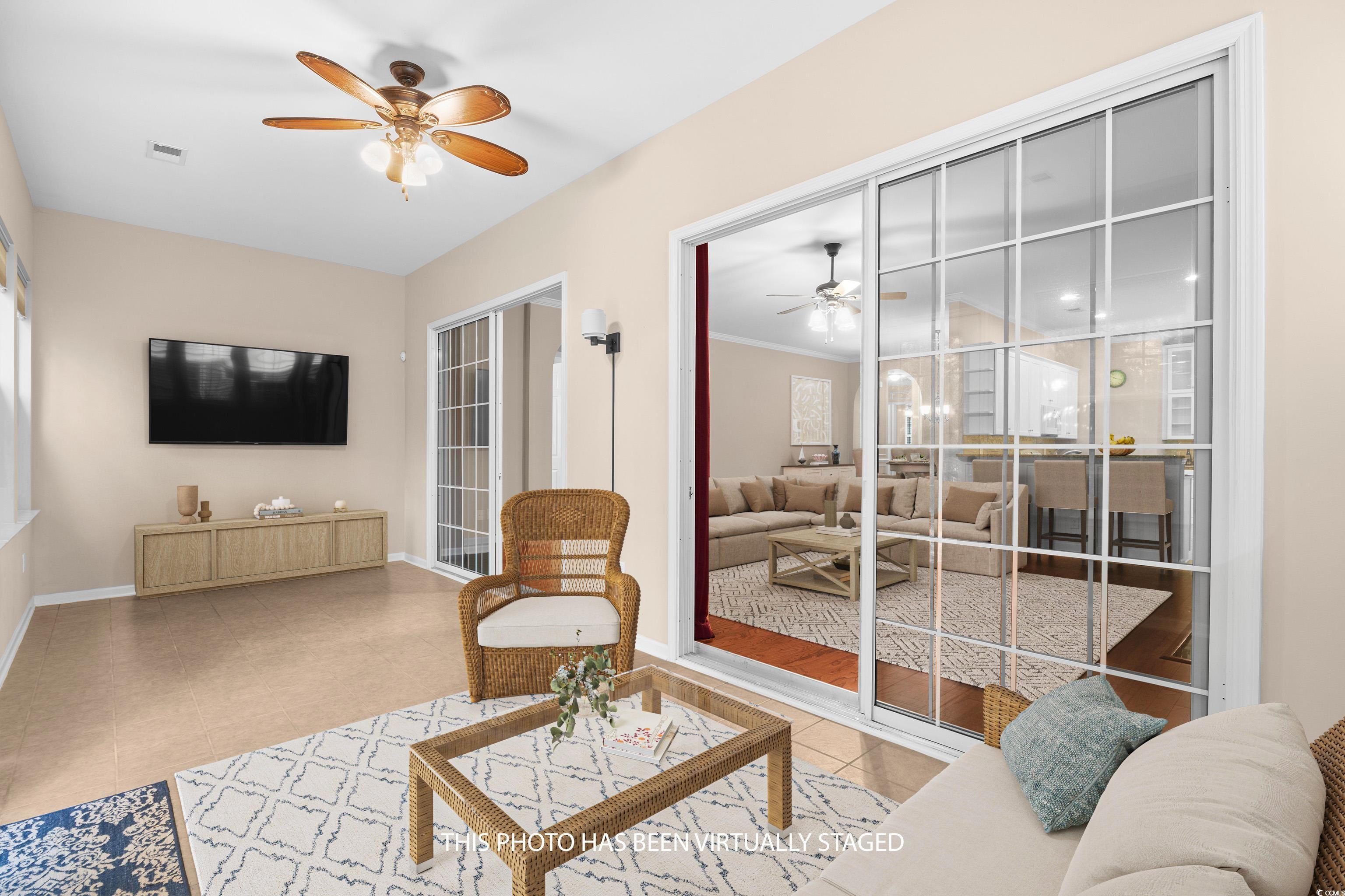 New price, and the HOA's monthly fee is paid through the end of the year. That means no payments for YOU until January 2026!! The Homestead floor plan is built with a Carolina Room, which is heated and cooled with the same system as the main home. The home was built in 2011 and sits on a parklike property with a partial view of the 3rd hole at Blackmoor Golf Course. For those who are avid golfers, what a treat this would be! This single-family residence is in Seasons at Prince Creek West (Active Adult 55+), has three bedrooms, two bathrooms, and a finished two-car garage with a mini split to cool the garage. The covered front porch and walkway to the front door have been professionally painted and are a nice place to enjoy your morning coffee or afternoon libations. When you enter the home, you will immediately see the beautiful trim work and box moldings that define the hallway and foyer. The mirror and two sconces are additional beautiful features in the hallway, along with the wrought iron chandelier and crown molding in the tray ceiling. This is a great area to showcase your artwork or pictures. The Kitchen was designed with Granite countertops, white cabinets, roll-out lower shelving in the cabinets, tile backsplash, and an additional wall of upper glass-front cabinets with lower cabinets and drawers. The stainless-steel French Door refrigerator and dishwasher, along with the white stove and microwave, complement the kitchen. The Family Room has two sliding glass doors that open into the Carolina Room, and a gas fireplace and wood mantle surround. The flat screen TV will come with the home. Adjacent to the Family Room is the Dining Room, which is accessible to the Kitchen. The open concept floor plan is perfect for entertaining. Access to the backyard is through the Carolina Room. Outside is a patio and a retractable remote-controlled awning, for the days you prefer shade. The picturesque view has lush greenery and a newly sodded rear yard. The primary suite, with a bay window, offers two large walk-in closets, an en-suite bathroom with a tiled shower, soaking tub, linen closet, vanity, and dual sinks. Two additional bedrooms, one currently being used as a Den with French Doors, are at the front of the home. They share the second bathroom with a tub/shower, a linen closet, and a single vanity. Some other special features to mention are crown molding in most areas, custom window treatments, Plantation Shutters, a gas-tankless water heater, a mini split air conditioner in the finished garage, a portable generator, hurricane window coverings, a whole house surge protector, a Sunsetter retractable awning, and the front load washer and gas dryer will convey. Engineered wood plank flooring is throughout the home, and tile is in the Kitchen, bathrooms, Carolina Room, and laundry room. The home is very well-maintained. The monthly HOA fee includes the following: internet, weekly trash pick-up, lawn service, irrigation, a fitness center, an indoor and outdoor pool, a Jacuzzi, a BBQ area, a shuffleboard and bocce ball area, a gated community, and a Grand Clubhouse with an onsite Lifestyle Director. The clubhouse can be a great place to relax or gather with friends at community events. With a short golf cart or drive, you can access The Park, which features two additional outdoor pools, pickleball courts, bocce ball courts, basketball courts, tennis courts, and walking trails. The community does not allow any fencing in the yard, but they will allow WIFI dog fences, as there is no underground wiring necessary. It is pet and golf cart friendly and features sidewalks throughout the community. All square footage is to be confirmed by the buyers and their agent. Some pictures have been VIRTUALLY STAGED.