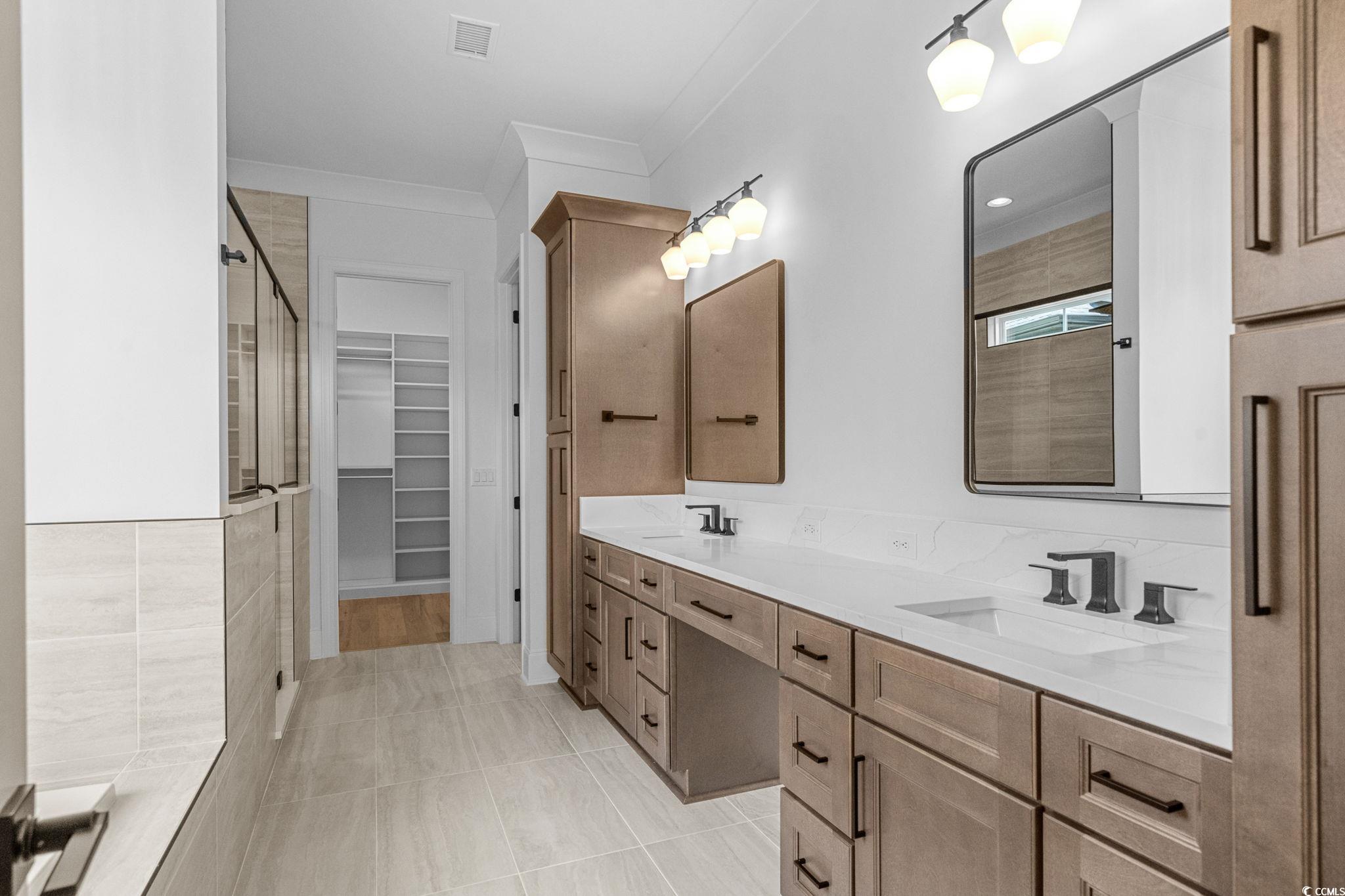 Exceptional new construction on a premium corner lot in Waterbridge, just a short walk to the communitys world-class amenity center. This custom-designed home offers 4,348 heated square feet and over 5,400 square feet under roof, including a full two-car garage plus a third golf cart bay. The unique corner placement allows for an L-shaped driveway with ample parking. Inside, the first floor features 10' ceilings and a layout built for function and luxury. There are two bedrooms downstairs, including a primary suite with a five-star hotel-style bathroom and an oversized walk-in closet. The guest bedroom has its own en suite bath, perfect for visitors or those needing to avoid stairs. The main level also includes a large walk-in pantry, a private study, a mudroom with built-in cubbies, and a laundry room with a secondary refrigerator for kitchen overflow. Upstairs, youll find three more bedrooms, a flex room, and a massive bonus room ideal for entertaining or additional living space. Exterior finishes include Hardiplank siding, brick accents, a metal roof, and full front and rear porches. The professionally landscaped yard features irrigation, sod, palm trees, and over two dozen evergreen shrubs. As a Waterbridge homeowner, enjoy unmatched amenities: a resort-style pool, clubhouse, fitness center, tennis courts, fire pit, and walking trails, all just minutes from the beach, golf, schools, shopping, and dining. This one is a must-see.
