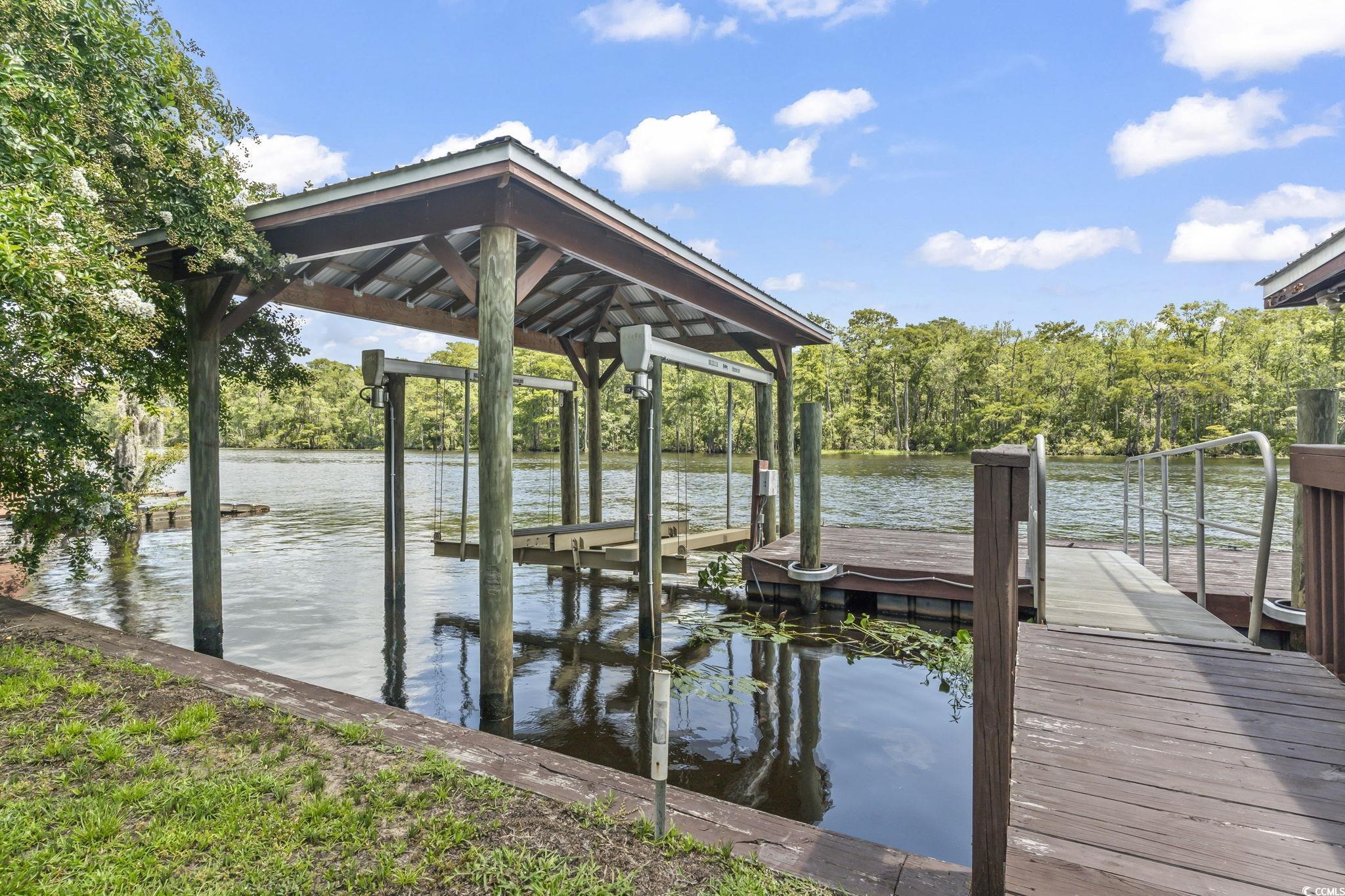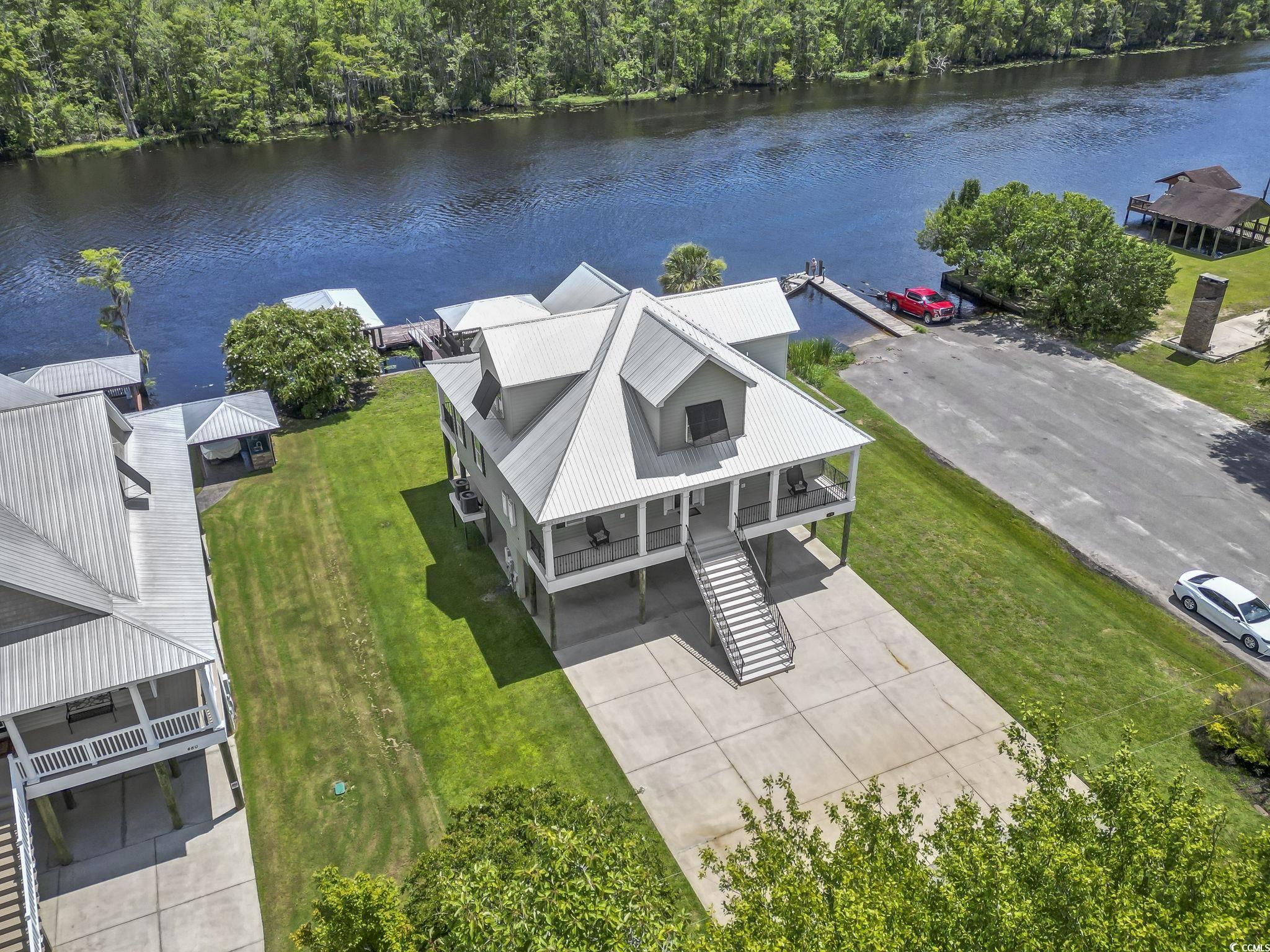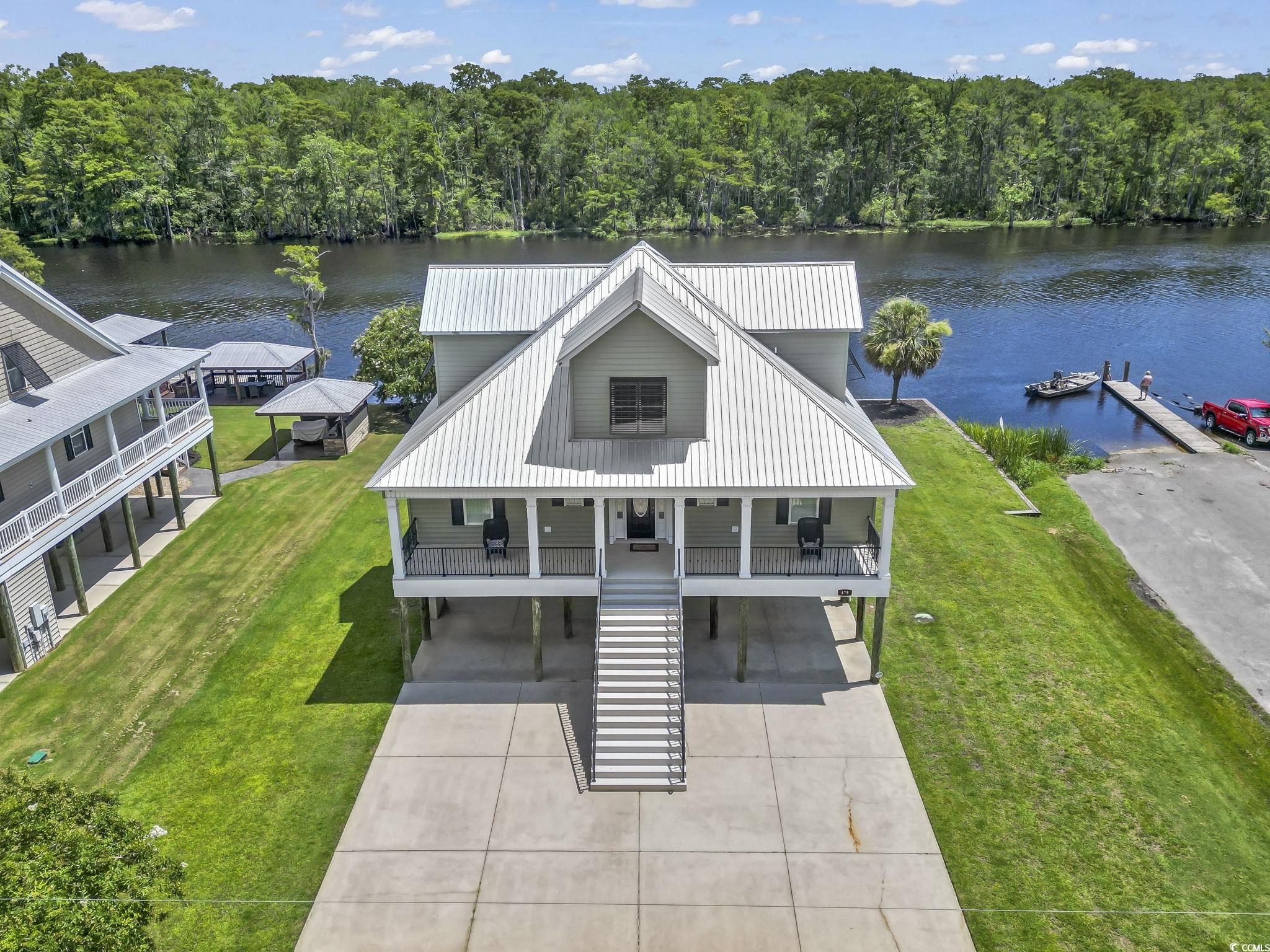 Welcome to 478 Riverfront Road-a beautifully custom-built, elevated home nestled along the water in Conway, SC, just steps from the Bucksville Landing boat ramp. Built in 2015, this luxurious 3-bedroom, 3-bath residence offers a perfect blend of timeless craftsmanship, modern elegance, and waterfront living. From the moment you arrive, you'll be drawn to the home's striking curb appeal, with its metal roof, black hurricane shutters, and elegant front and rear staircases. Expansive covered porches with durable Trex decking and sleek metal railings provide the perfect space to relax and take in the peaceful views. Inside, you'll find upscale finishes throughout-from crown molding and LVP flooring to tile in wet areas and a full interior elevator that offers convenient access to all levels. The main living area showcases soaring ceilings and abundant natural light through large windows dressed with plantation shutters. A thoughtfully designed gourmet kitchen features white cabinetry, granite countertops, under-cabinet lighting, a spacious island, and a convection oven-ideal for both entertaining and everyday cooking. The luxurious primary suite is located on the main living level and includes dual sinks, a beautifully tiled oversized walk-in shower, and plenty of storage. Upstairs, two additional bedrooms each feature private bathroom access, creating a layout that offers comfort and privacy for all. Downstairs, you'll find a full bathroom and ample storage for gear, tools, and water toys. The waterfront lifestyle is fully embraced here, with a large covered boat lift, a floating dock with an EZ Dock system, and a shaded deck area perfect for enjoying the river breeze. With the boat landing just next door, you can launch your boat or jet ski within moments, making every day feel like a vacation. Located just 10 minutes from historic Downtown Conway, you'll enjoy the charm of a vibrant riverfront town known for its oak-lined streets, boutique shopping, local restaurants, theaters, and weekly farmers markets. Conway blends Southern hospitality with modern convenience, and you're also only about 30 minutes from the sandy shores, entertainment, and endless attractions of Myrtle Beach and the Grand Strand. Whether you're drawn by the boating lifestyle, peaceful setting, or proximity to both nature and city life, this property offers the best of it all. Don't miss the opportunity to own this one-of-a-kind waterfront home-schedule your private tour today!