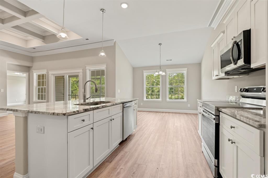Fantastic Opportunity to Own the Popular Pelican A Floor Plan in Carolina Shores! This beautifully designed 3-bedroom, 2-bath home sits on an oversized lot and offers a well-thought-out split-bedroom layout with stunning attention to detail throughout. From the moment you step inside, you'll notice the upgraded featurescoffered ceilings, extensive trim work, and an open-concept living space perfect for both everyday living and entertaining. The gourmet kitchen is a showstopper, featuring 42-inch white cabinetry, a spacious center island, and a walk-in pantry. Adjacent is a designated laundry room with direct access to the 2-car garage, which includes attic storage for added convenience. The primary suite is tucked away at the back of the home for privacy and showcases tray ceilings, a walk-in closet, and a luxurious en-suite bathroom complete with a custom tile shower and dual vanities. Two additional bedrooms are located at the front of the home, sharing a full guest bathroom and multiple storage closets. Step outside to enjoy the screened-in back patioa perfect spot to relax and enjoy the beautiful Carolina weather year-round. Located right on the NC/SC border, Carolina Shores gives you easy access to both Calabash and Little River, offering a variety of local restaurants, pristine beaches, and championship golf courses just minutes away. Don't miss your chanceask about our lot and home packages today!