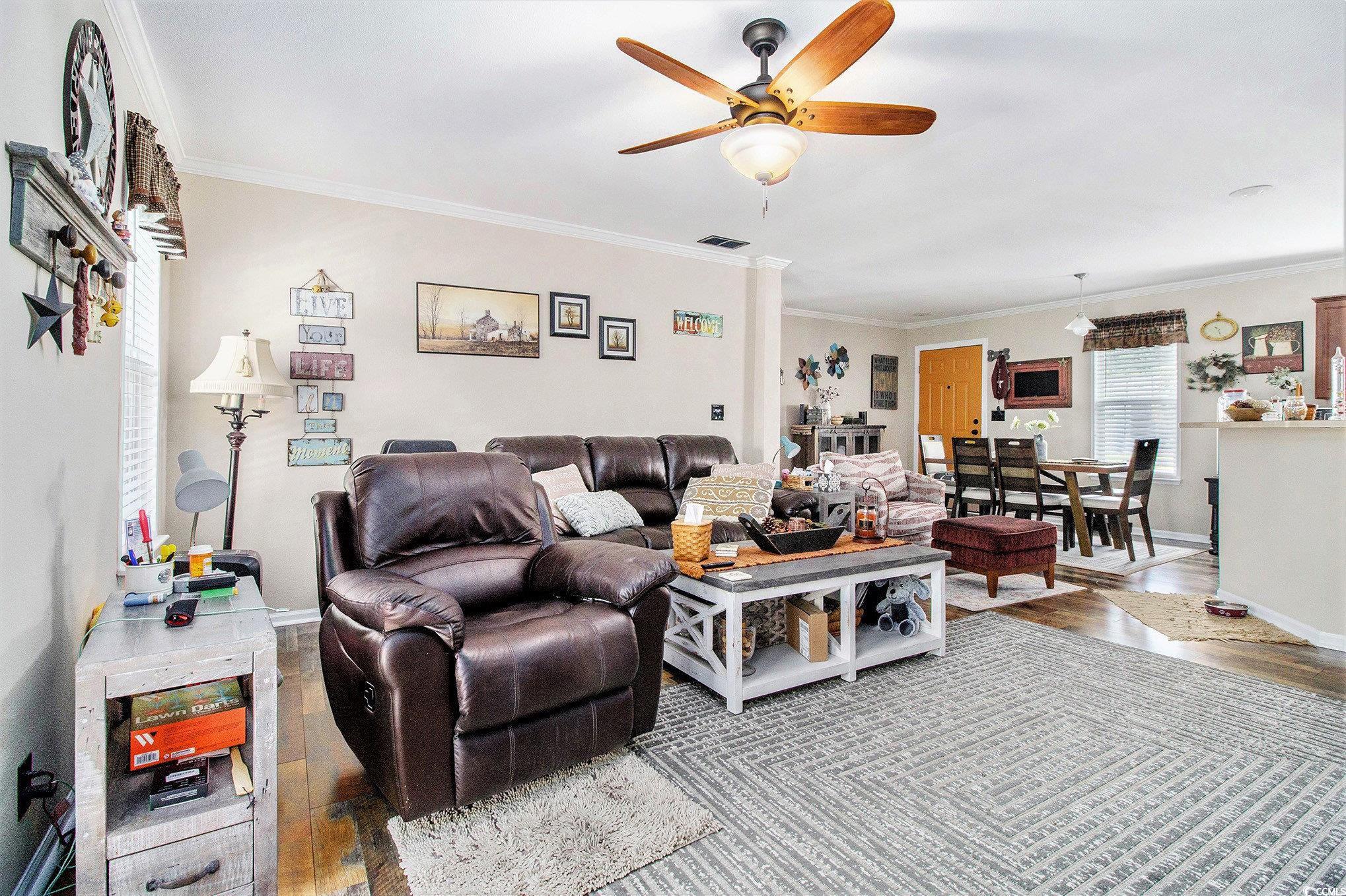 Welcome Home! This beautifully maintained 2-bedroom, 2-bathroom home is full of thoughtful upgrades and charm. From the moment you arrive, you'll be impressed by the meticulous landscaping featuring river rocks and custom curbscape. Step inside to an inviting open floor plan that's perfect for both everyday living and entertaining. The split bedroom layout ensures privacy, with a spacious master suite tucked away for comfort. Enjoy brand-new vinyl plank flooring throughout, elegant crown molding, and many upgraded features throughout. The master bath boasts a large, tiled walk-in shower with a built-in bench, while a remote-controlled retractable sun awning adds comfort to your outdoor space. Start your day with coffee on the cozy front porch or take advantage of all that Lakeside Crossing, a premier 55+ gated community, has to offer. Amenities include indoor and outdoor pools, tennis and pickleball courts, a state-of-the-art fitness center, pub area with pool tables, library, craft room, and so much more. Conveniently located near top-notch medical facilities, shopping, dining, golf courses, and just a short drive to the stunning South Carolina coastline, this home offers the lifestyle you've been looking for!