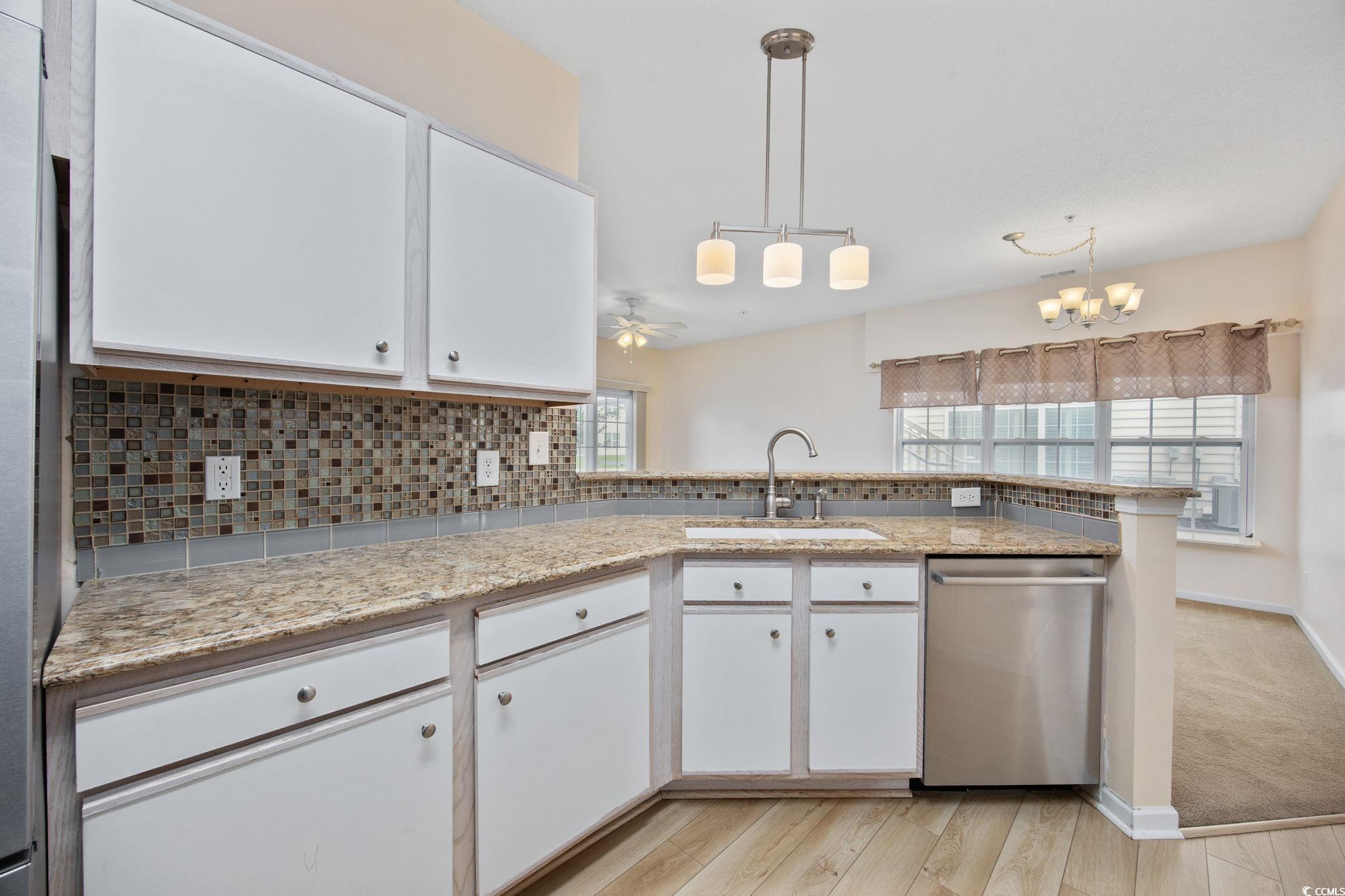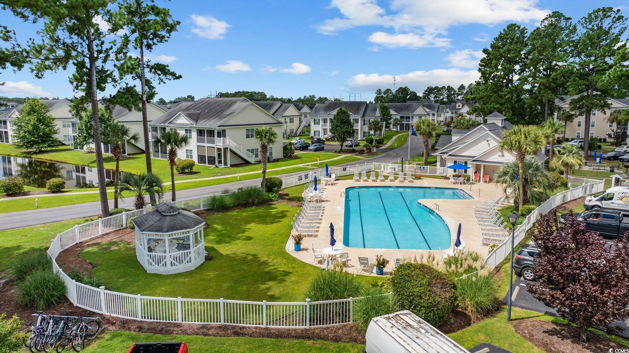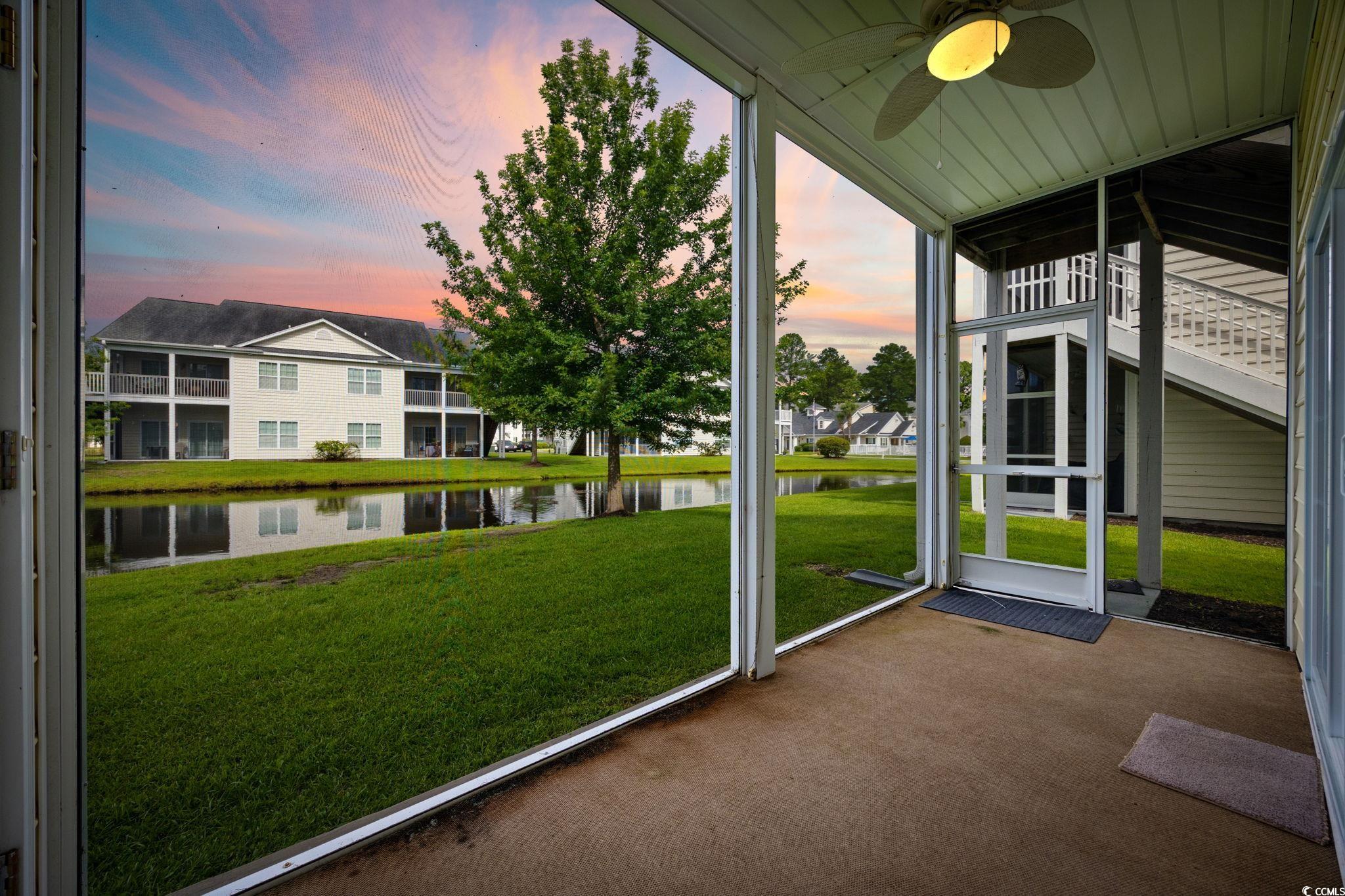 First-floor! End Unit! This spacious, bright, and beautifully maintained 3BR/2BA condo in Windsor Green at Carolina Forest is ready for a new owner! Featuring an open-concept layout with a split-bedroom plan for privacy, and a screened-in porch overlooking a tranquil pond - you may have found the one you've been looking for. As you enter the foyer, you'll take note of beautiful LVP and find two generously sized bedroom; each with ceiling fan. One has LVP and a walk-in closet. The shared bathroom has LVP, comfort height toilet and a shower/tub combo. From the guest quarters, step into the kitchen with it's bright light, pendant lights, stainless appliances, granite counters, ample cabinet space, and a breakfast bar. Off the kitchen is a separate laundry room with a full-size washer and dryer which conveys and a large rack for additional storage. The living area separates the guest rooms and the primary suite and has a dining area as well. The extra windows and double slider in this end unit, fill the room with natural light. Both the living room and primary suite have direct views of the pond and access to the screened porch. The primary suite has a large walk-in closet, and the ensuite has linen storage and a shower/tub combo. There is an attached storage closet on the front porch as well. Community amenities include an outdoor pool, playground, rec center, and well-kept grounds. Windsor Green is conveniently located near Carolina Forest schools, Tanger Outlets for shopping, locan and chain dining, golf courses, walk/ride paths on each side of the boulevard, and is just a short drive to the beach and MYR airport. Whether you're looking for your own coastal home, a full-time residence, or an investment property, this unit delivers. Schedule a private tour today.