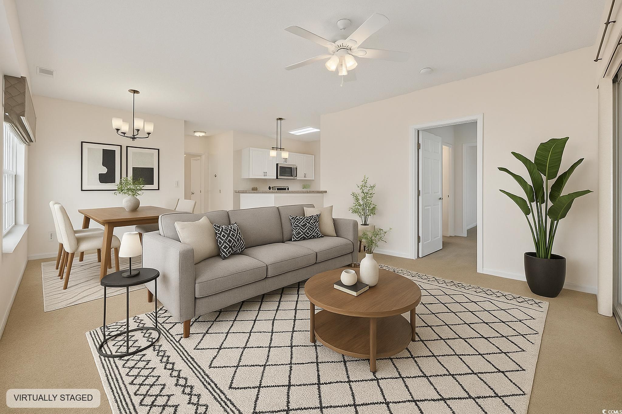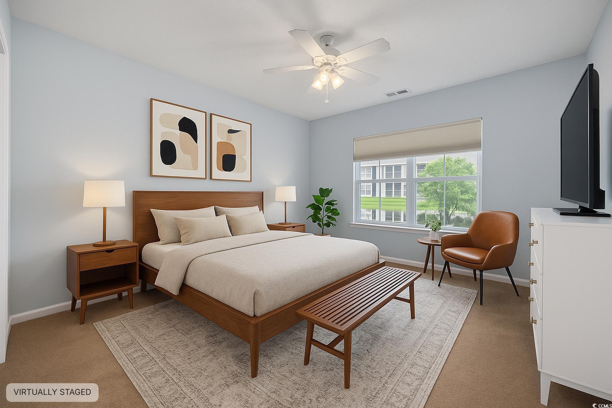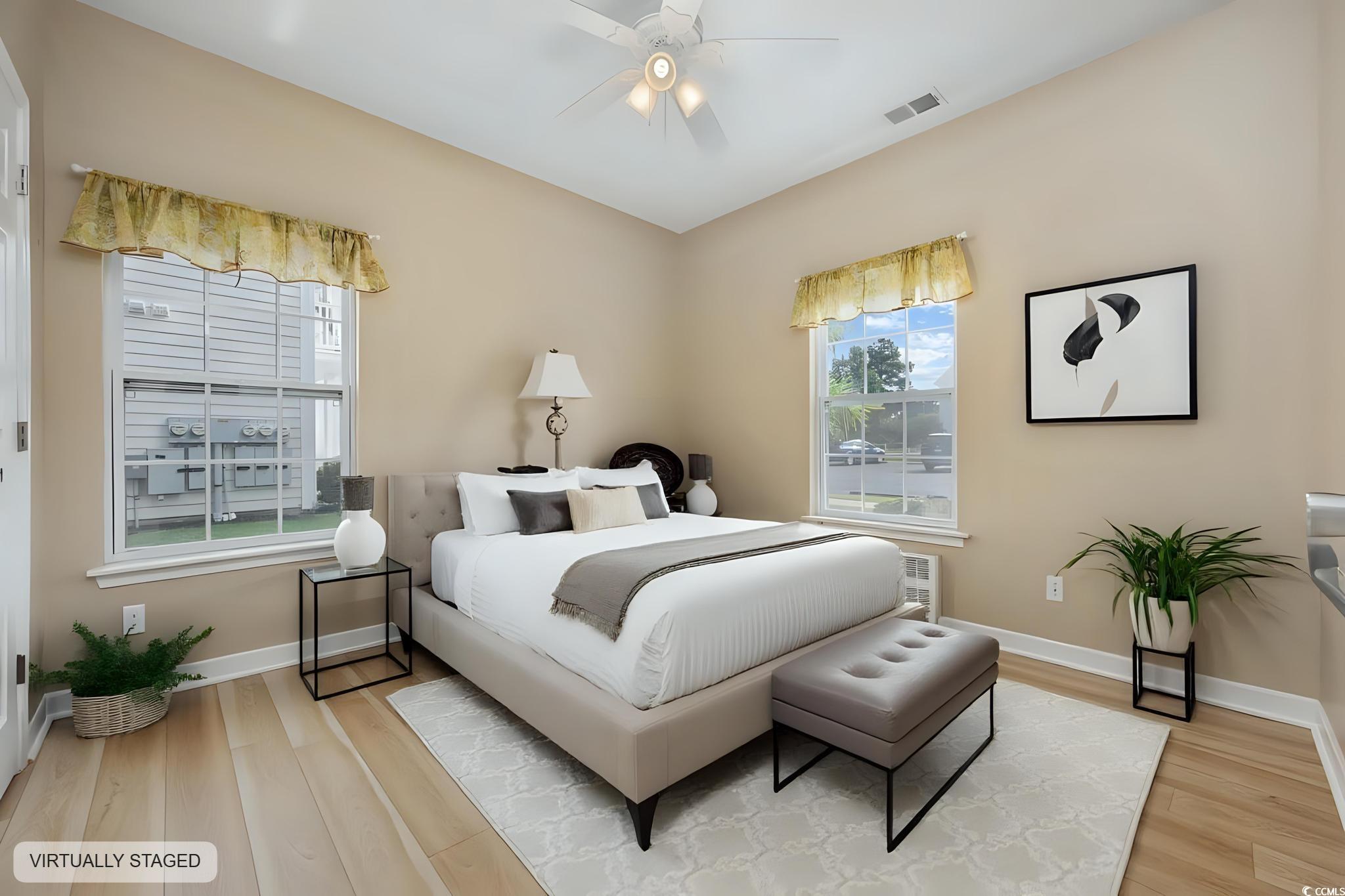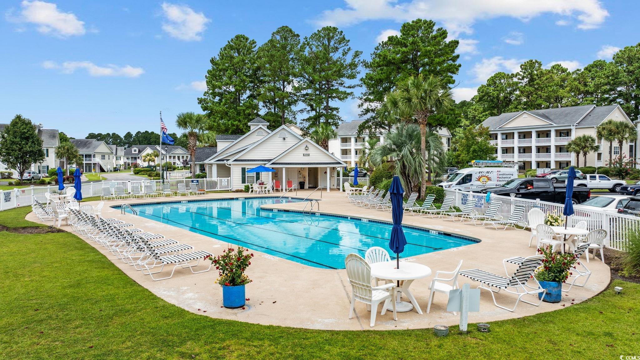 First-floor! End Unit! This spacious, bright, and beautifully maintained 3BR/2BA condo in Windsor Green at Carolina Forest is ready for a new owner! Featuring an open-concept layout with a split-bedroom plan for privacy, and a screened-in porch overlooking a tranquil pond - you may have found the one you've been looking for. As you enter the foyer, you'll take note of beautiful LVP and find two generously sized bedroom; each with ceiling fan. One has LVP and a walk-in closet. The shared bathroom has LVP, comfort height toilet and a shower/tub combo. From the guest quarters, step into the kitchen with it's bright light, pendant lights, stainless appliances, granite counters, ample cabinet space, and a breakfast bar. Off the kitchen is a separate laundry room with a full-size washer and dryer which conveys and a large rack for additional storage. The living area separates the guest rooms and the primary suite and has a dining area as well. The extra windows and double slider in this end unit, fill the room with natural light. Both the living room and primary suite have direct views of the pond and access to the screened porch. The primary suite has a large walk-in closet, and the ensuite has linen storage and a shower/tub combo. There is an attached storage closet on the front porch as well. Community amenities include an outdoor pool, playground, rec center, and well-kept grounds. Windsor Green is conveniently located near Carolina Forest schools, Tanger Outlets for shopping, locan and chain dining, golf courses, walk/ride paths on each side of the boulevard, and is just a short drive to the beach and MYR airport. Whether you're looking for your own coastal home, a full-time residence, or an investment property, this unit delivers. Schedule a private tour today.