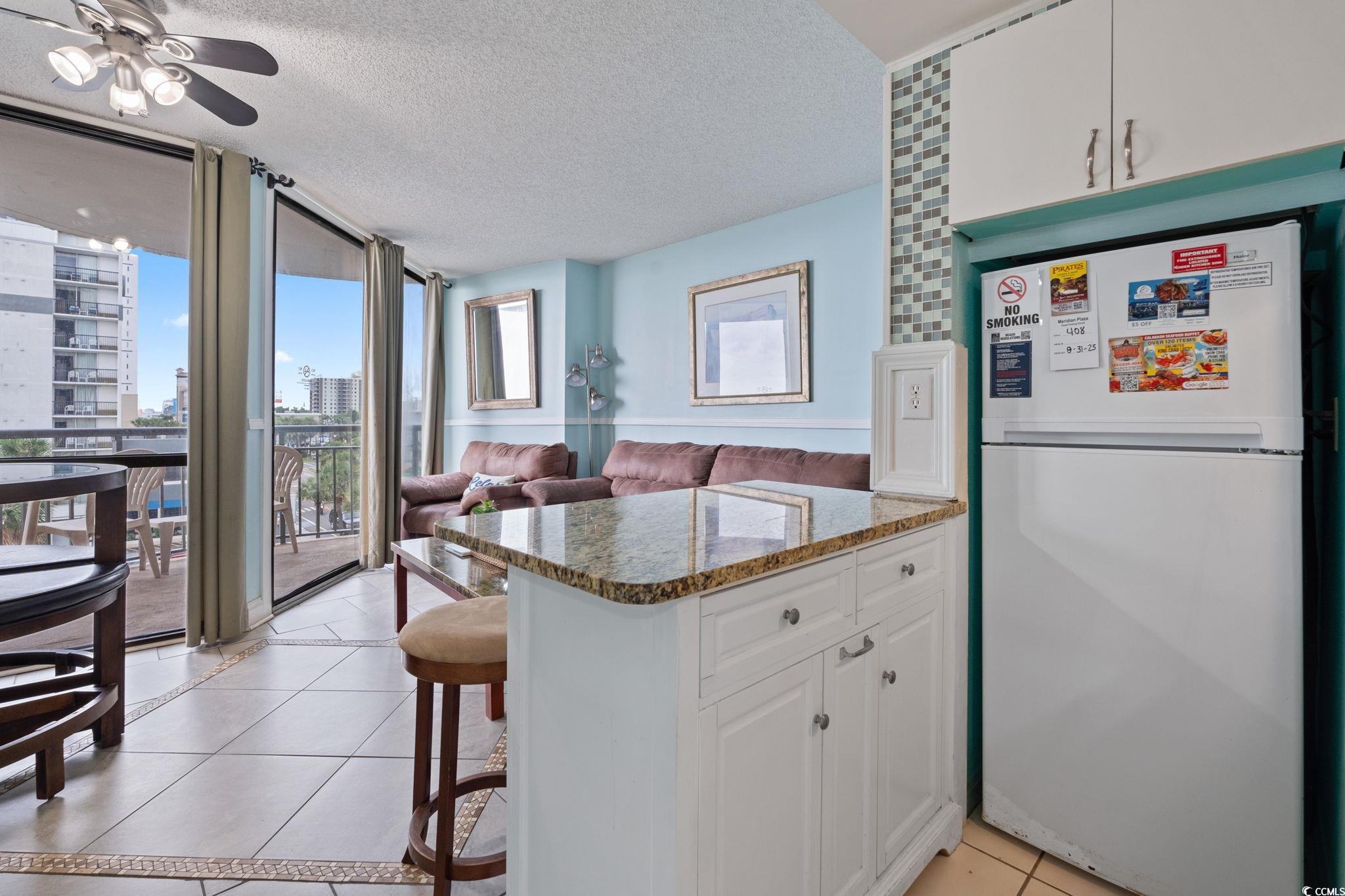 Experience breathtaking sunsets and stunning ocean views from this beautifully updated 1-bedroom, 1-bath condo located on the 4th floor of the highly sought-after Meridian Plaza in the heart of Myrtle Beach. This fully furnished unit offers the perfect blend of comfort and convenience, making it an ideal primary residence, vacation getaway, or investment property. Step inside to find tile flooring throughout, a spacious living area with a sleeper sofa, and a large separate bedroom featuring two queen beds - comfortably sleeping up to six. The full kitchen includes modern cabinetry and a tiled backsplash, while the bathroom offers a double vanity and a clean, updated design. The highlight of this unit is the private balcony, where you can relax with your morning coffee or unwind in the evening while enjoying panoramic coastal views and the fresh ocean breeze. The Meridian Plaza boasts direct beach access and top-notch amenities including indoor and outdoor pools, a hot tub, onsite laundry facilities, high-speed WiFi, and covered parking. Located just steps from the Myrtle Beach Boardwalk, SkyWheel, Broadway at the Beach, local dining, shops, and entertainment, this condo offers an unbeatable location and lifestyle. Don't miss your opportunity to own this move-in-ready coastal retreat in one of the most desirable oceanfront buildings in Myrtle Beach.