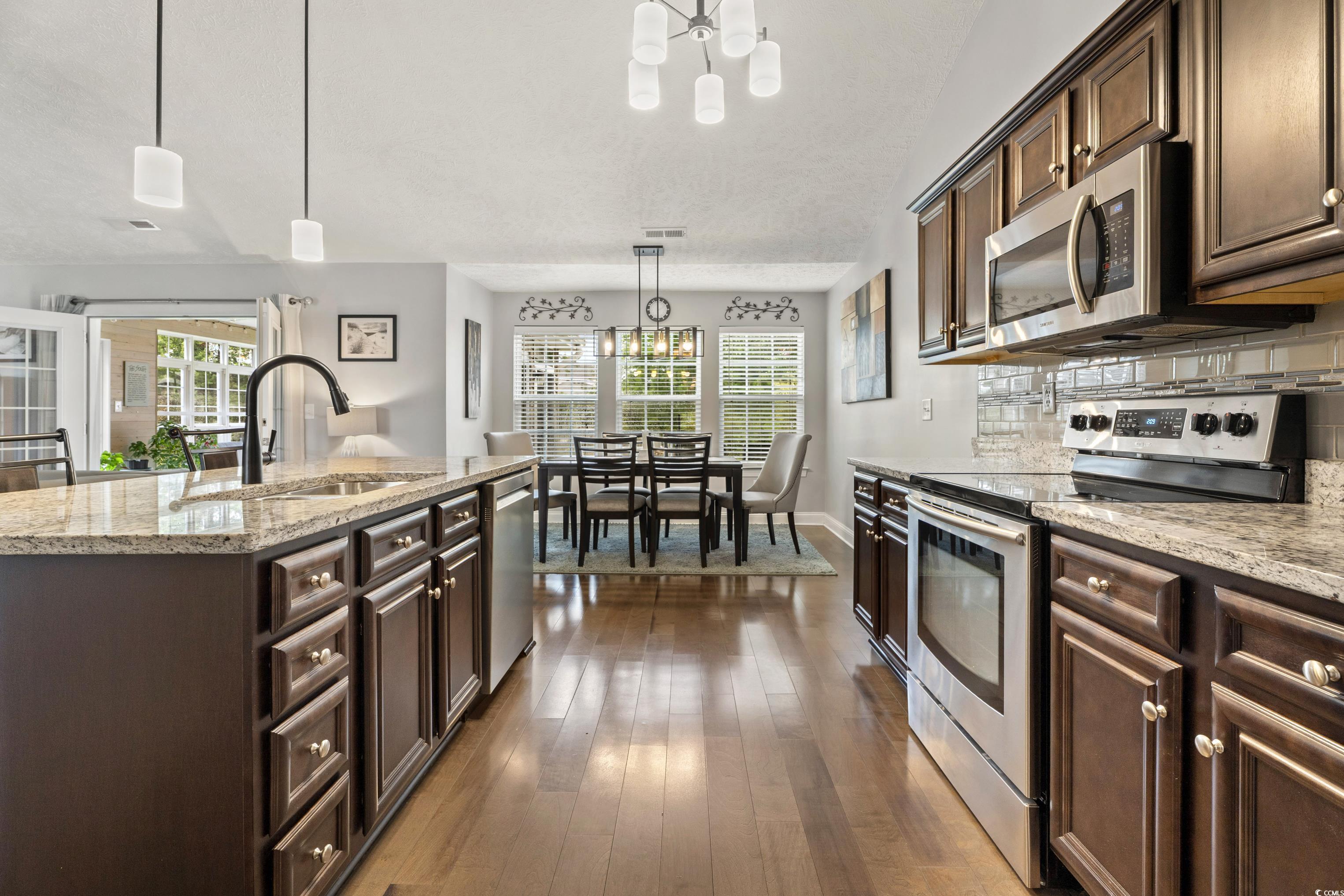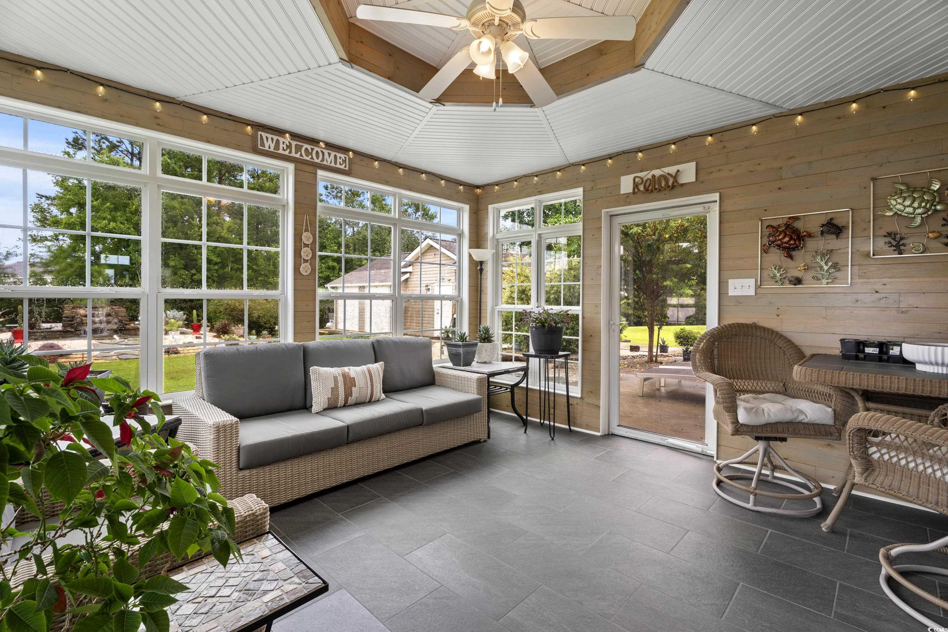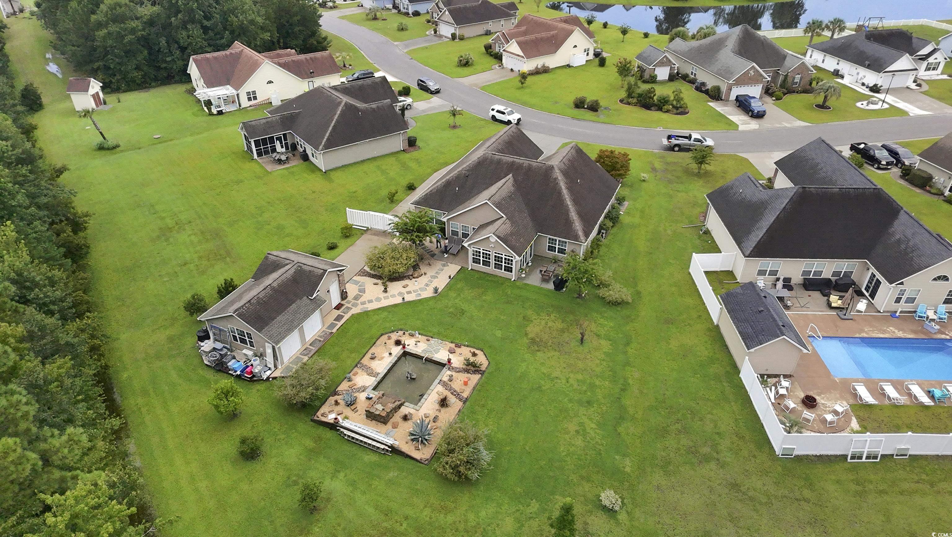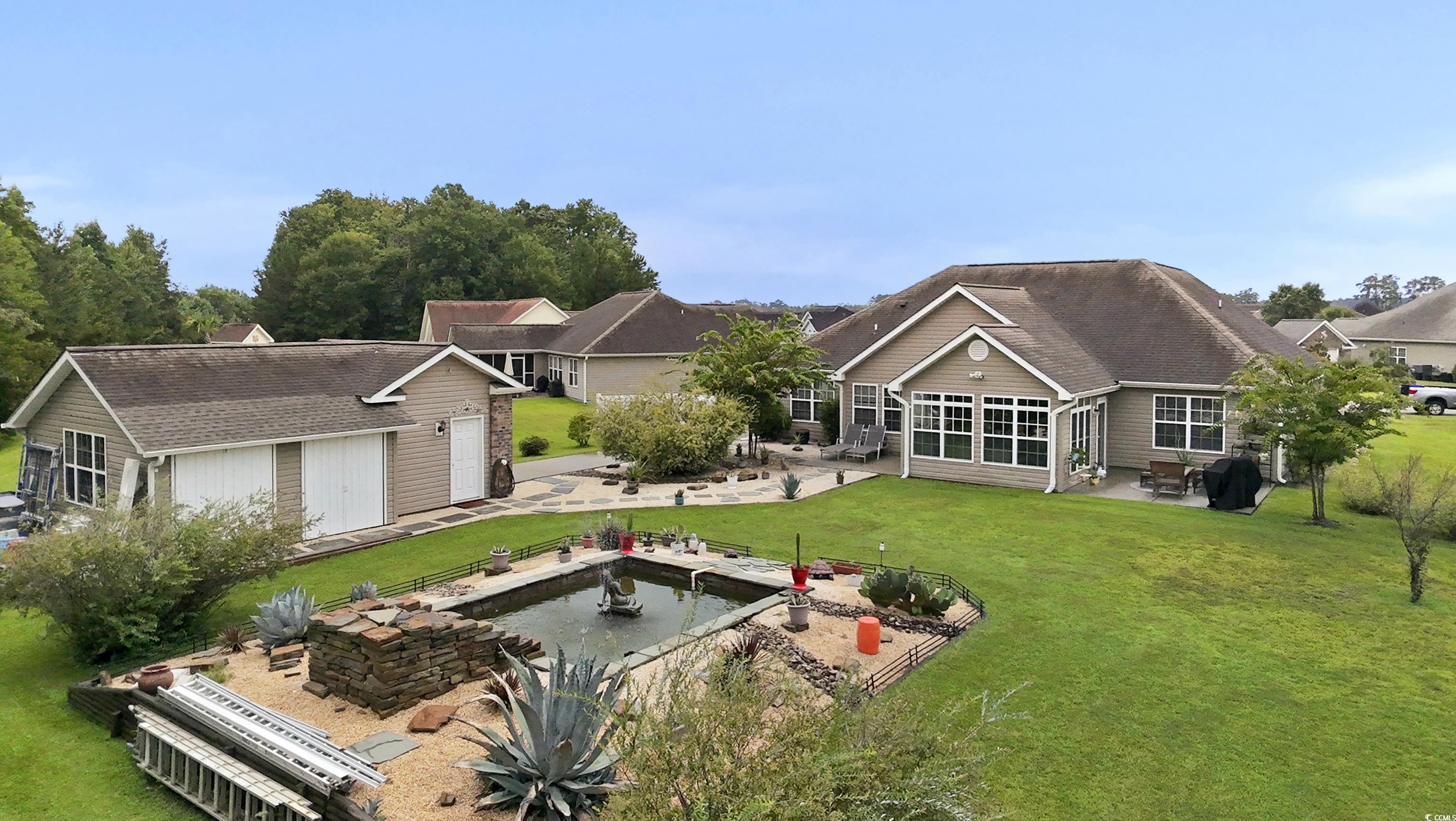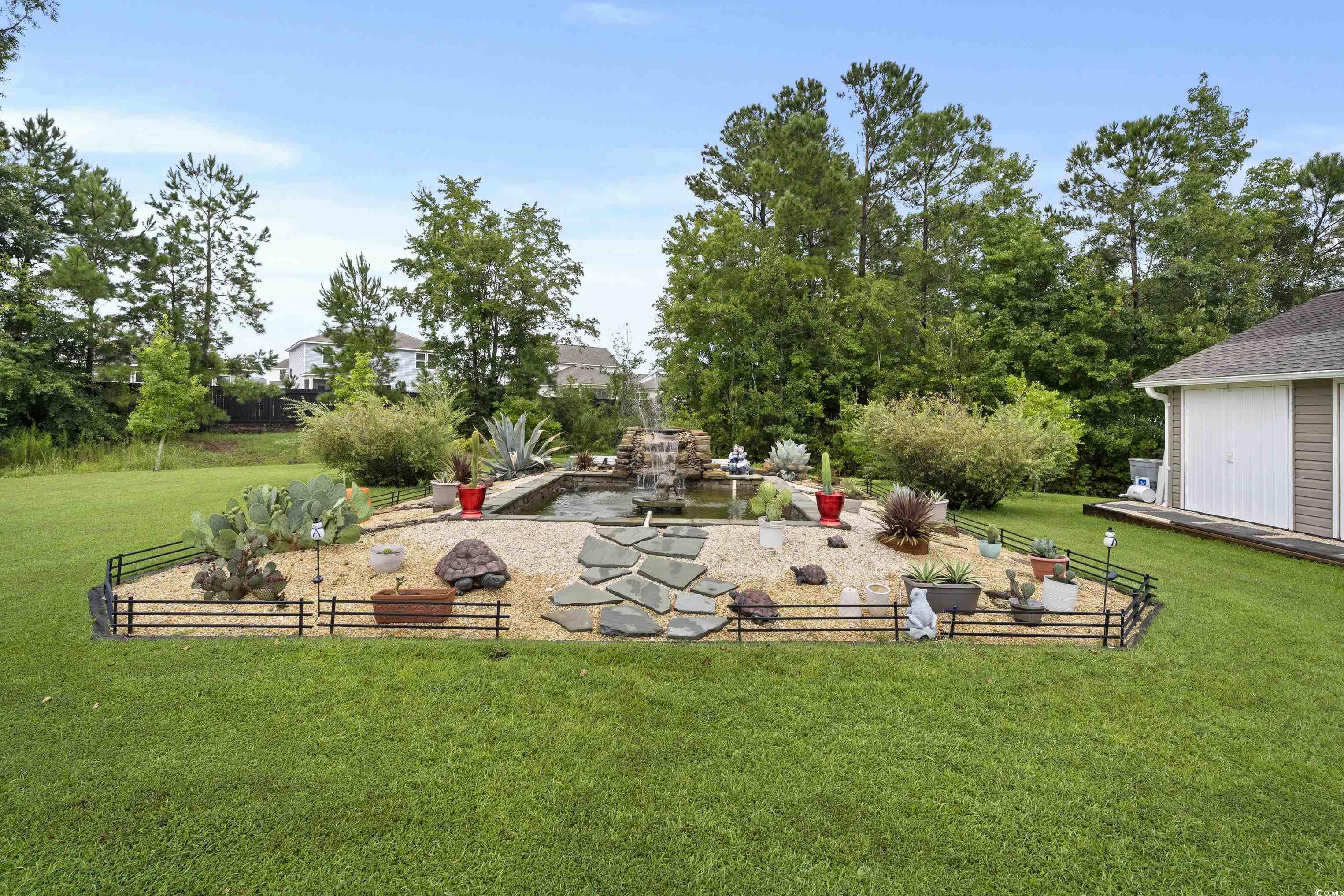 Looking for a single-story home with land, privacy, and lifestyle, but still want to be close to everything Myrtle Beach has to offer? This 3 bed, 2 bath ranch-style home sits on nearly HALF AN ACRE in Forestbrook Preserve and features the space, flexibility, and upgrades you're looking for. Inside enjoy vaulted ceilings, wood flooring throughout (no carpet!), and an open layout that flows seamlessly into a custom-built 3 Seasons Carolina Room. The kitchen features granite countertops, stainless steel appliances, beautiful backsplash, and a center island. Step outside and you'll find what truly sets this home apart: a 520 sq ft heated and cooled detached workshop and a handcrafted waterfall pond, creating your own private oasis. The extended 112' driveway offers plenty of space for parking. Whether youre dreaming of a home gym, hobby space, she-shed, man cave, or business setup, this property delivers. One of the largest lots in Forestbrook Preserve, youll enjoy room to garden, play, or simply breathe. Low HOA fees, neighborhood pool, and a community feel, all just 15 minutes to the beach, airport, Market Commons, Coastal Grand Mall, and more.