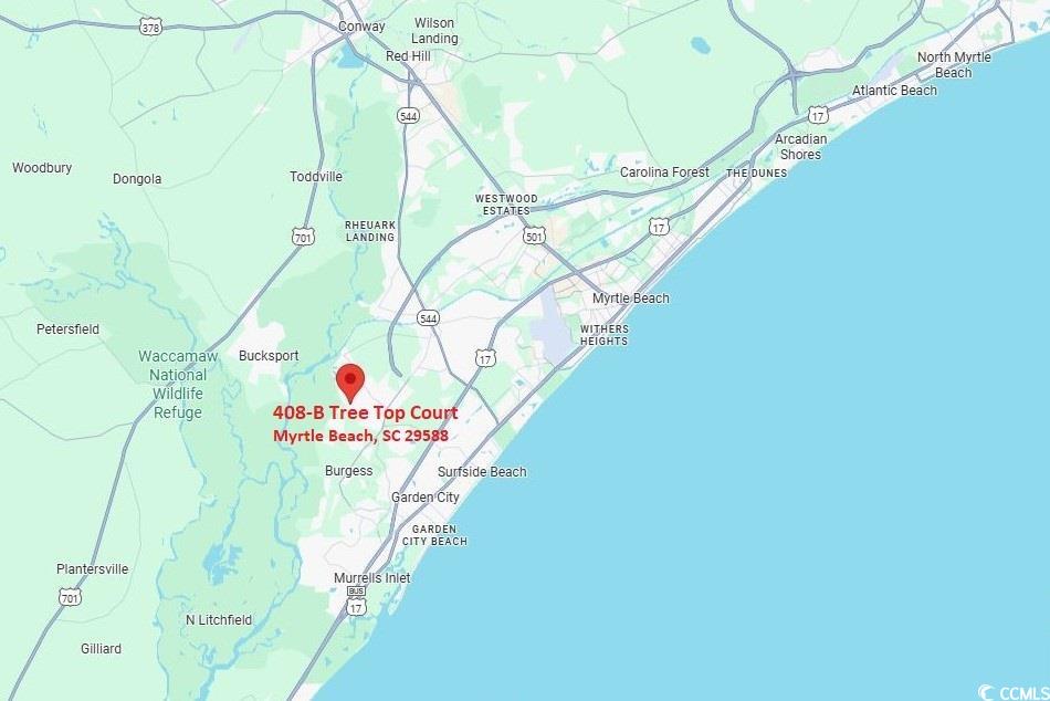 From SC Hwy 707 turn west onto Bay Road at the Traffic Light. Turn left onto Freewoods Road. Turn Right onto Sunnehanna Drive to enter Island Green. Turn left to enter the Parking Lot for Arms Wide Open Church @ 455 Sunnehanna Drive. Unit 408-C Tall Oaks Court is next to the Parking Lot for Arms Wide Open Church. Unit B is the 2nd floor unit on the right side of the building. GPS 33.641937, -79.054810Courtesy of Re/max Southern Shores Gc - Cell: 843-450-8760