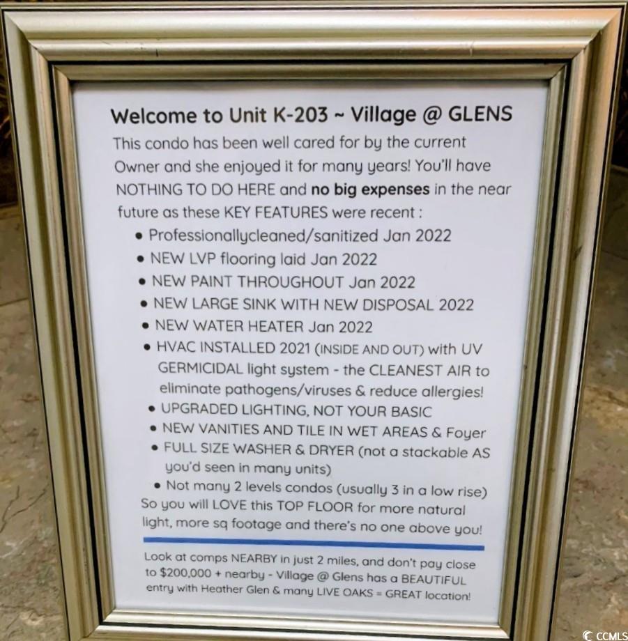 Discover Your Coastal Oasis at Villages at the Glen - Little River, SC! Welcome to your serene retreat in the heart of Little River, SC,perfectly situated at Villages at the Glen, just moments from the North Carolina state line! This charming condo offers the ideal blend ofcomfort, convenience, and a vibrant coastal lifestyle, whether you're seeking a primary residence, a vacation getaway, or an income-producing investment property. Condo Features You'll Love As you enter, youll be captivated by the inviting kitchen that opens to thecombined dining/living area, designed for modern convenience and style. The kitchen features vintage tin backsplash, ample cabinetsand counter space, and a sleek bar that creates a pass-through or adds bar stools for additional seating, perfect for casual dining orentertaining guests. The large two-door fridge with freezer drawer provides ample storage space for all your culinary needs. Thethoughtfully designed laundry area, complete with a front-load washing machine and dryer, is conveniently tucked away behind bi-folddoors, maintaining the sleek aesthetics of the home. Storage is a breeze with a coat closet and bathroom closet, plus two closets in eachbedroom, offering plenty of space for all your belongings. Step outside to your large, screened balcony, which is accessible via slidingglass doors from the living room. Enjoy the fresh air while taking advantage of the additional storage offered by the outdoor closetidealfor seasonal items or outdoor gear. Community Amenities & Local Highlights Village at the Glens offers owners and guests alandscaped yard complete with a grilling area, plus on hot days cool off at the community pool complete with a pool house. PrimeLocation: Enjoy the best of both worlds! Located in the picturesque fishing village of Little River, you're minutes from North Myrtle Beachand just a short drive to the beautiful beaches of Cherry Grove, Sunset Beach (NC), and Ocean Isle Beach (NC). The proximity to theNC state line offers easy access to Calabash's renowned seafood restaurants and charming shops. Golfer's Paradise: Situated directlyacross from Glen Dornoch Waterway Links, and near Heather Glen Golf Links, this community is a dream for golf enthusiasts. Residentshave access to the Glen Dornoch practice facility with a driving range and putting green, and many properties offer golf course views.Enjoy a round or simply soak in the scenic greens. Resort-Style Amenities The Village at the Glens boasts a sparkling communityswimming pool with shaded lounge areas and restrooms, perfect for relaxing after a day at the beach or on the links. HOA fee coversbasic cable TV, internet, water/sewer, exterior maintenance, and common ground maintenance, ensuring a carefree lifestyle. CoastalLiving at Its Finest: Little River offers a relaxed, laid-back atmosphere with a plethora of natural views and unique attractions. Explore the Intracoastal Waterway (ICW) with boating and fishing opportunities, take a ride on the Big M Casino yacht, or discover the tranquility of Vereen Memorial Historical Gardens. Enjoy fresh seafood at local waterfront restaurants, attend the famous Blue Crab Festival, or explore the shopping and dining options in nearby North Myrtle Beach and Calabash, NC. Convenient Access: With quick access to Highway 17 and Highway 31, you're seamlessly connected to all that the Grand Strand has to offer, from entertainment and activities to additional golf courses and major roadways. Don't miss the opportunity to experience the best of coastal living in this desirable Little River community!