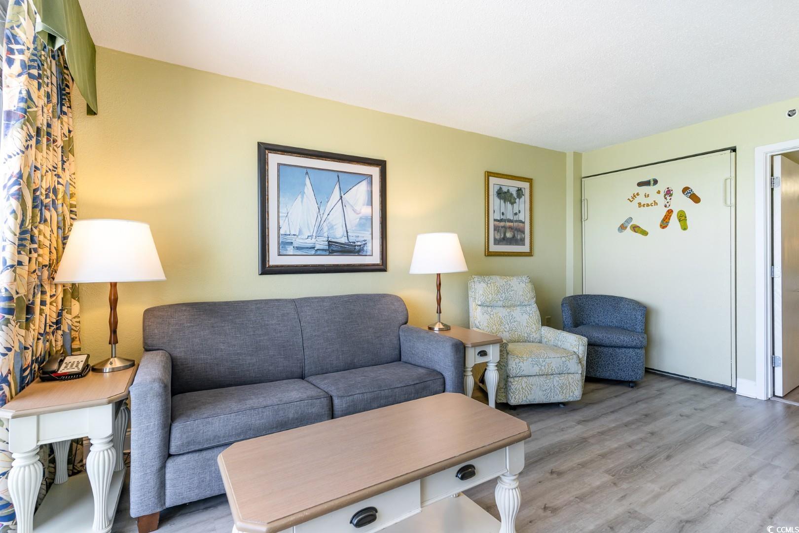 Welcome to your vacation paradise! The panoramic views are spectacular from this gorgeous 1 bed 1 bath oceanfront condo located at the always popular Compass Cove Resort! This desirable north corner unit in the 52 stack has a large ocean view window facing the coastline in the bedroom and has been updated with a new range and new sliding doors and features commercial LVP floors, kitchen backsplash, 5"" wide base molding and an owner lockout closet. Tastefully furnished and decorated with delightful beach themed wall dcor, this unit boasts a nicely equipped kitchen with full size refrigerator, new GE flat top range, a microwave, granite counters, a double sink and abundant cabinet space. A nice-sized living room has direct access to the balcony, a dining table with seating for three and a Murphy bed for additional sleeping options. The bedroom has a king-sized bed and also has plenty of storage and closet space plus those great views and the full bath has a vanity and tub/shower. The private extended balcony is the perfect spot to enjoy your morning coffee or just relax with cocktails and savor the ocean breezes and those spectacular unobstructed views of the coast. Amenities at Compass Cove are fantastic and include indoor and outdoor pools, water slides, hot tubs, lazy rivers, kiddie pools and the Silly Submarine plus restaurants offering breakfast, lunch and dinner, Joe's Coffee Bar, a Tiki bar, fitness center and gift shop. HOA dues are all inclusive and cover building and HO6 insurance and all utilities including electric in the unit. Situated in the heart of Myrtle Beach and close to Broadway at The Beach with so many entertainment and amusement options, the Boardwalk and the SkyWheel, Market Common with upscale shopping and fine dining and just minutes from the airport. Whether you are searching for your dream beach getaway or an investment property, this is a wonderful opportunity! Don't miss it!
