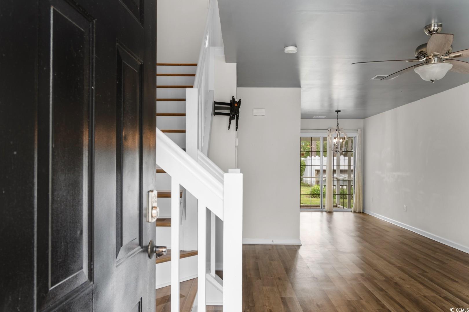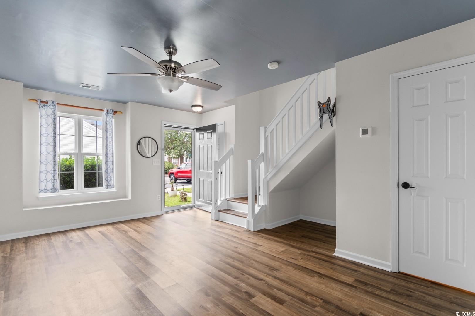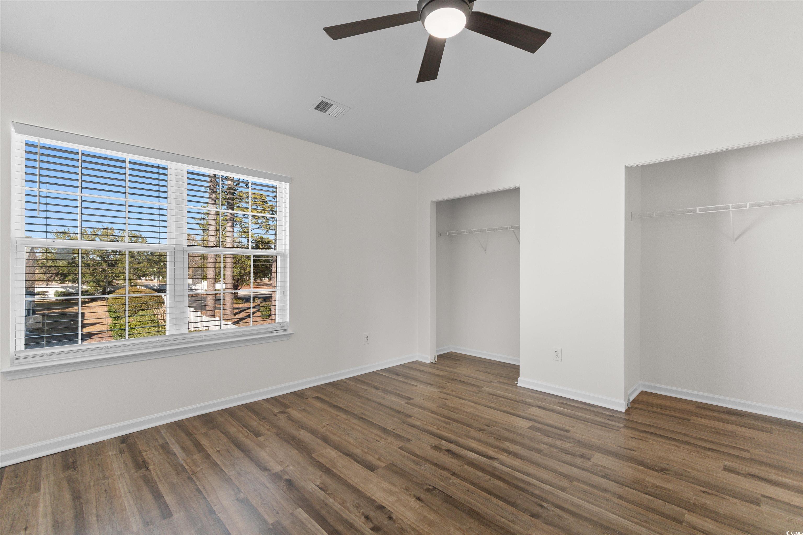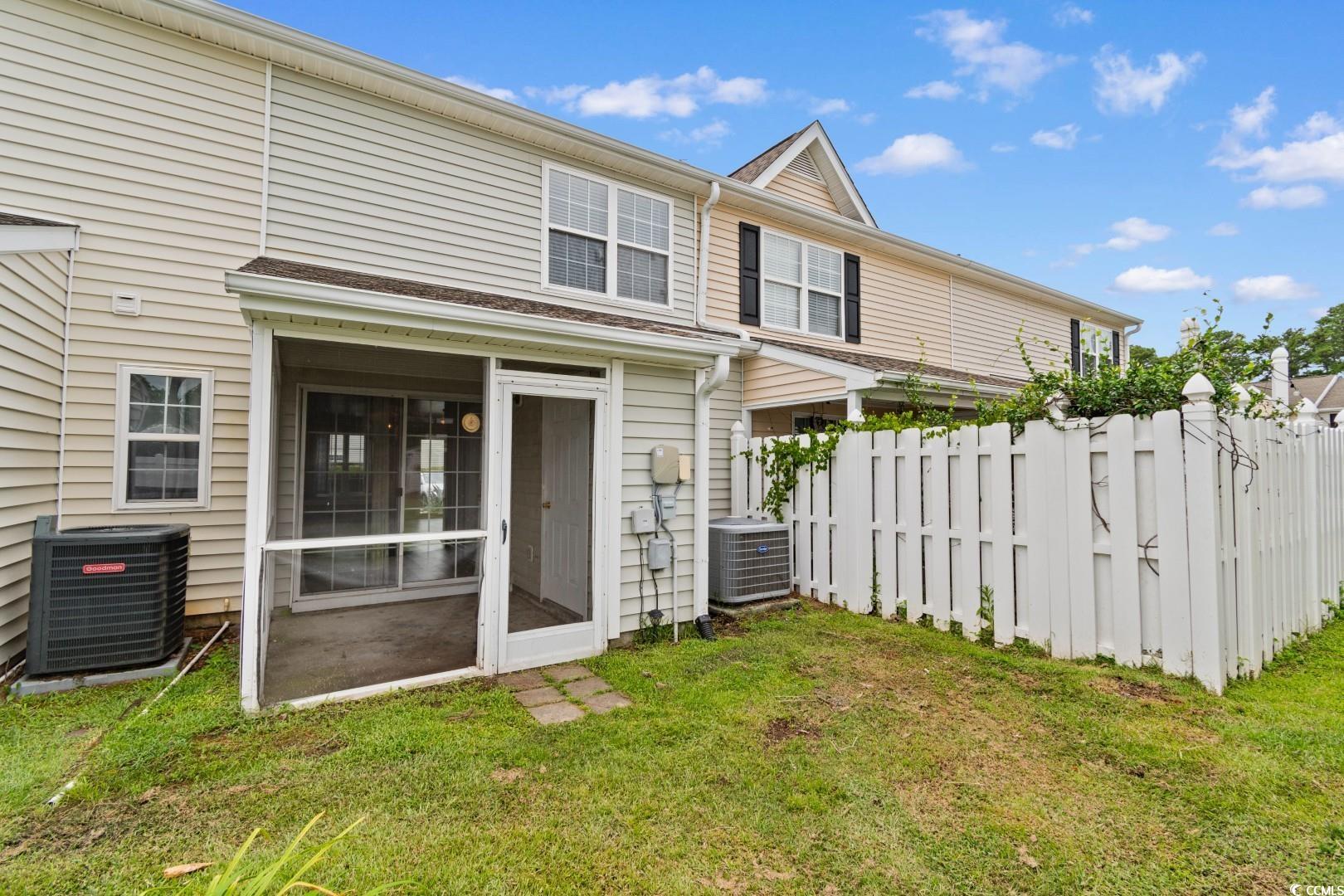 Welcome to Windsor Gate, a charming townhome community in the highly sought-after Market Common area of Myrtle Beach. This splendid two-bedroom, 1.5-bathroom residence offers the perfect blend of comfort and convenience, featuring a thoughtful two-story layout. The main living areas are on the first floor, with a spacious living room and a kitchen that includes a full set of appliances and a breakfast bar. The adjacent dining area opens to a private, screened-in back porch through sliding glass doors, creating a seamless indoor-outdoor flow. A convenient half-bath is also on this level. Upstairs, two well-appointed bedrooms share a Jack and Jill style bathroom. Both bedrooms boast vaulted ceilings; one includes a walk-in closet, and the other has two standard closets. As a resident, you'll have access to fantastic community amenities, including a refreshing pool and a scenic walking path around a beautiful lake. The prime location places you just a 5-minute drive from the beach at Myrtle Beach State Park. The vibrant Market Common is also just a short distance away, offering an array of restaurants, shops, a movie theater, and a bowling alley, ensuring you're never far from the action.