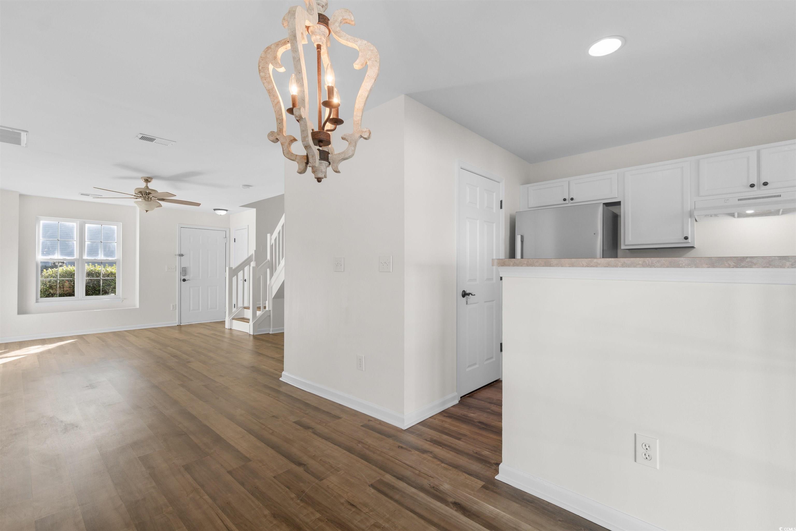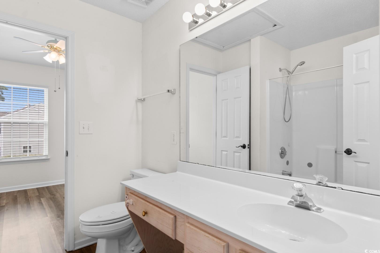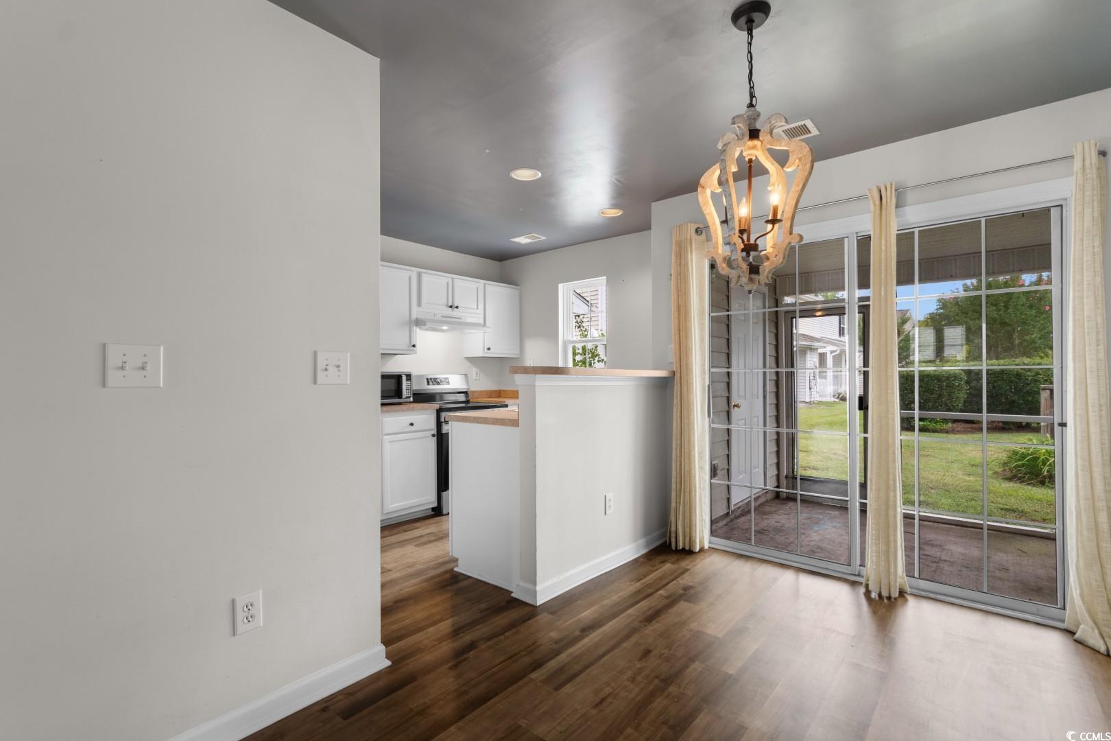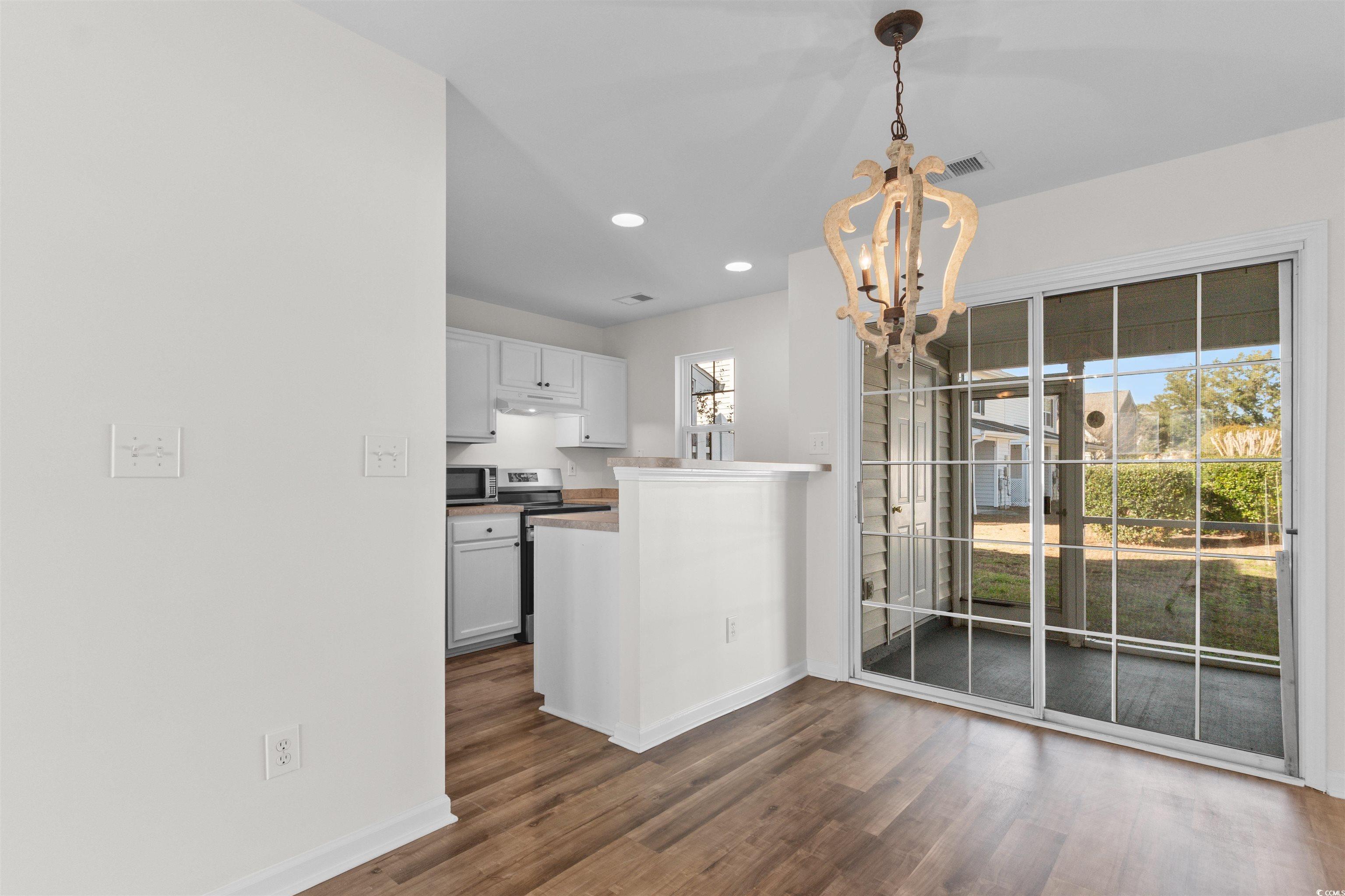 Welcome to Windsor Gate, a charming townhome community in the highly sought-after Market Common area of Myrtle Beach. This splendid two-bedroom, 1.5-bathroom residence offers the perfect blend of comfort and convenience, featuring a thoughtful two-story layout. The main living areas are on the first floor, with a spacious living room and a kitchen that includes a full set of appliances and a breakfast bar. The adjacent dining area opens to a private, screened-in back porch through sliding glass doors, creating a seamless indoor-outdoor flow. A convenient half-bath is also on this level. Upstairs, two well-appointed bedrooms share a Jack and Jill style bathroom. Both bedrooms boast vaulted ceilings; one includes a walk-in closet, and the other has two standard closets. As a resident, you'll have access to fantastic community amenities, including a refreshing pool and a scenic walking path around a beautiful lake. The prime location places you just a 5-minute drive from the beach at Myrtle Beach State Park. The vibrant Market Common is also just a short distance away, offering an array of restaurants, shops, a movie theater, and a bowling alley, ensuring you're never far from the action.