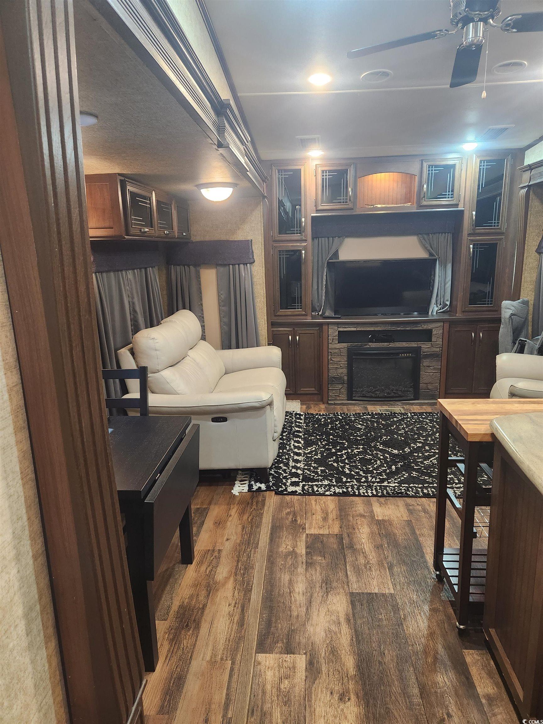 N-71 is centrally located in the middle of Ocean Lakes and close to all amenities. This 2016 Forest River Sierra model # 371REBH is a 43' 5th wheel that is permanently set-up with plumbing, electric, supports and necessary hurricane straps, attached underpinning and attached covered deck structure. All plumbing has been hard piped throughout and the waste water and sewage has also been hard piped into the ground giving you worry free utilities. This 2 bedroom 1 bath is being sold furnished, outside storage building has a washer/dryer, and water heater. The huge outside attached deck and covered porch has a large ceiling fan, entertaining area, and TV. Plenty of parking is behind the 5th wheel.