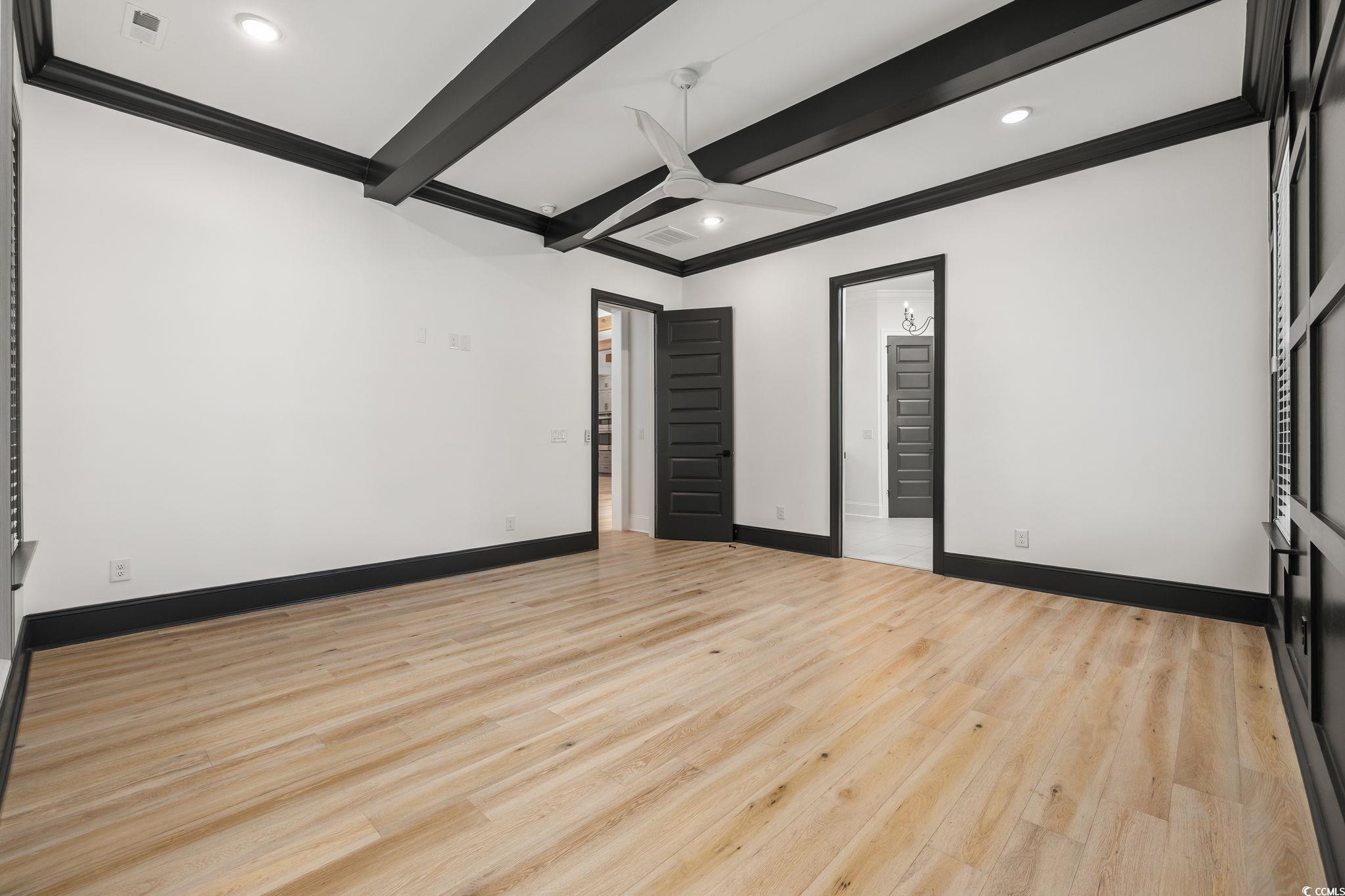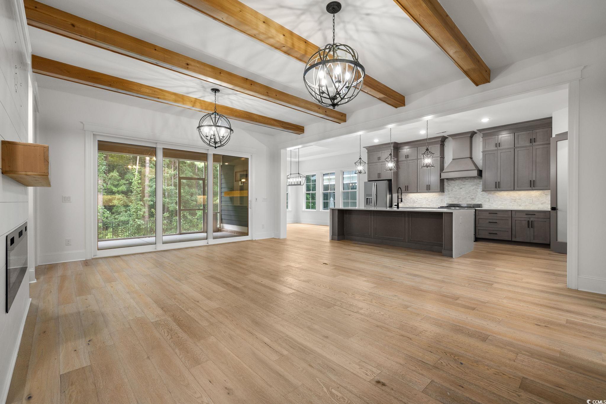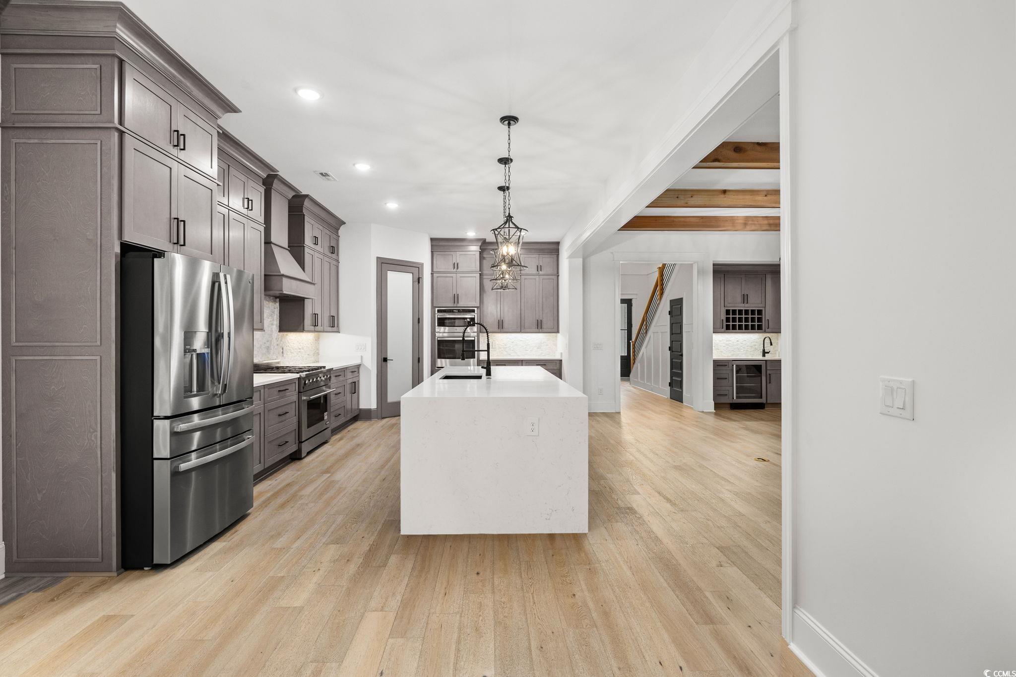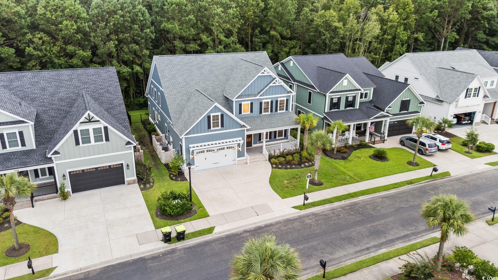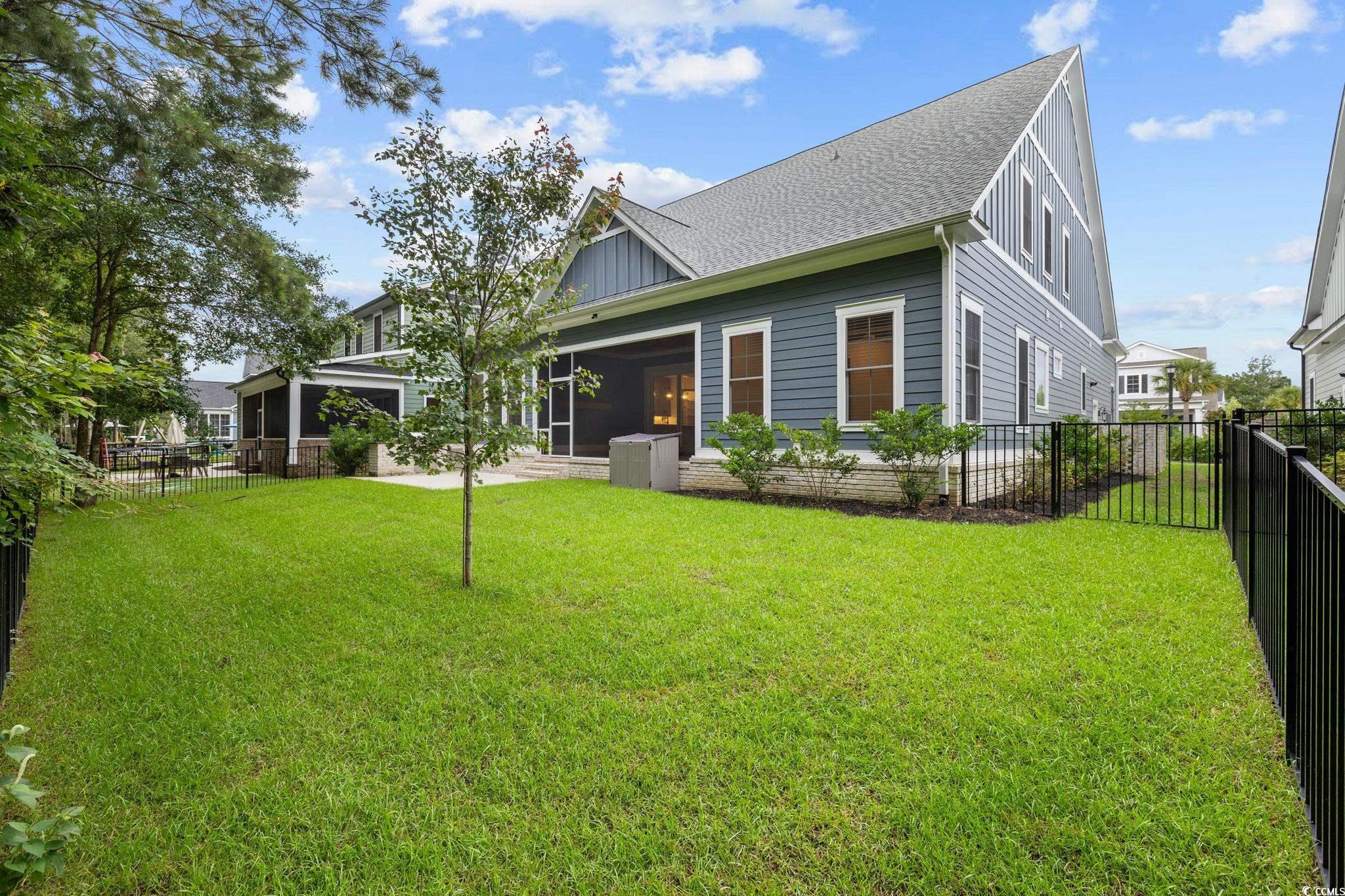 Step into this stunning and nearly new 6BR - 4BA modern home located in the desirable Waterway Palms Plantation, nestled within the award-winning Carolina Forest school district. With easy access to both Highway 31 and 17, and just a short 10-minute drive to the beach, this home offers the perfect balance of tranquility and convenience. From the charming front porch and attached two-car garage, youre welcomed into an impressive foyer with gleaming hardwood floors and wainscoting accents. Just off the entryway, you'll find a spacious guest suite complete with its own ensuite bath featuring tile floors and a sleek glass-door shower/tub combo. The heart of the home is the inviting living room, where a wood-beam ceiling, custom built-in shelving and cabinetry, an electric fireplace, and a full wet bar with wine fridge set the stage for effortless entertaining. Large sliding doors open to a screened-in back porch with wood ceiling and TV mount, creating a perfect transition to outdoor living. The dining area features a tray ceiling and is surrounded by windows that offer peaceful wooded views. In the gourmet kitchen, no detail has been overlooked, from Corian countertops to the custom tile backsplash and stainless-steel appliances. The kitchen is a chef's dream, complete with striking black hardware, a farmhouse sink, and an island with a breakfast bar perfect for serving weekend brunch. There is an extra large pantry with custom shelving to tie everything together. The luxurious first-floor primary suite boasts a beam ceiling, custom accent wall, walk-in closet with built-in shelving, and a spa-like ensuite bath with dual vanities, a separate water closet, and a fully tiled custom shower with double shower heads and a privacy window. Connected to the owners suite is a stylish laundry room with herringbone flooring, sink, and cabinetry which adds to the homes functionality. Upstairs, you'll find three additional bedrooms, two with walk-in closets (one featuring its own ensuite bath), plus a large bonus room and additional storage space. Enjoy peaceful evenings on the back patio featuring a built-in brick surround for the gas grill, overlooking the fully fenced backyard with mature trees. This exceptional property offers modern elegance, thoughtful details, and a quiet wooded backdrop and all just minutes from the coast and conveniences.