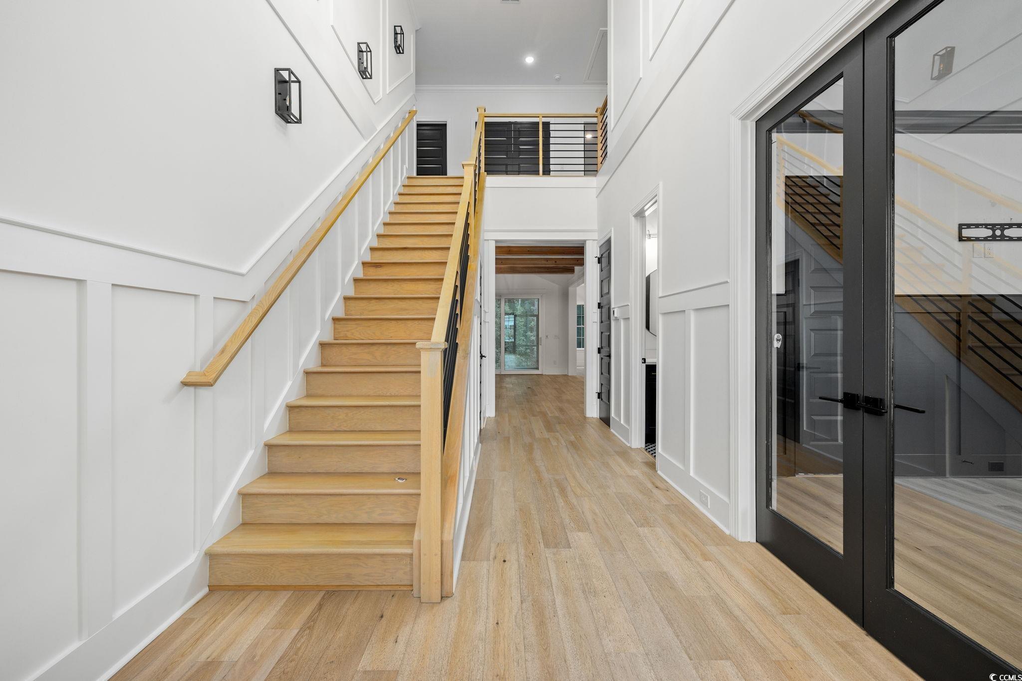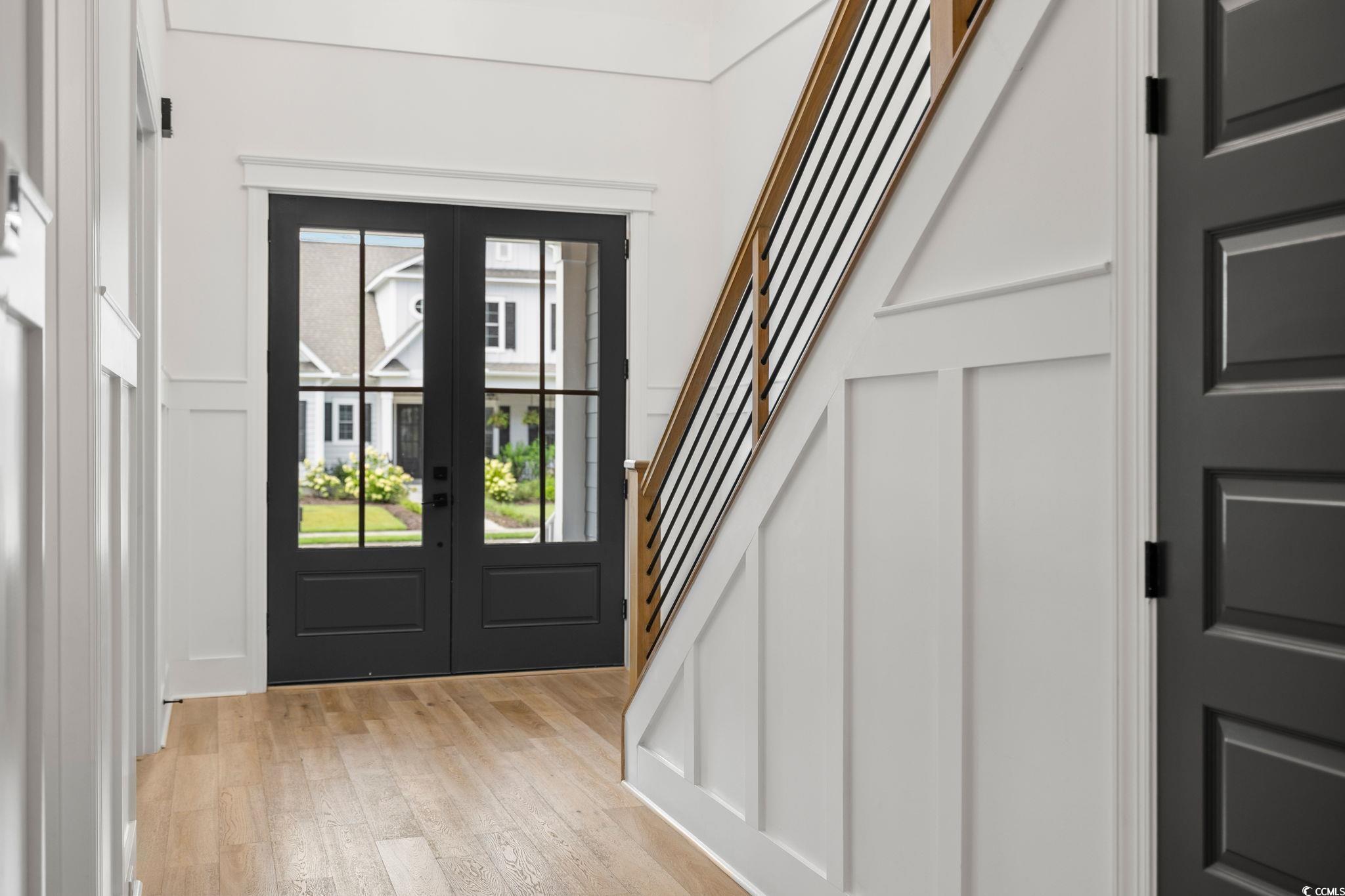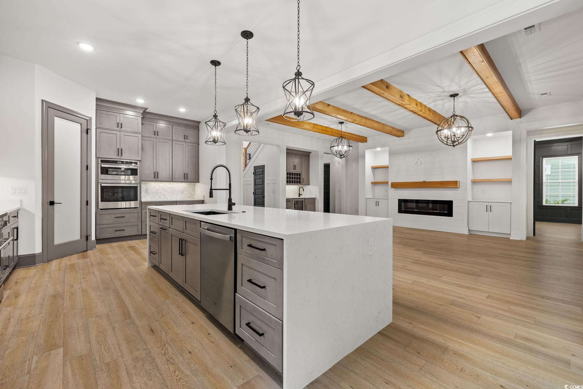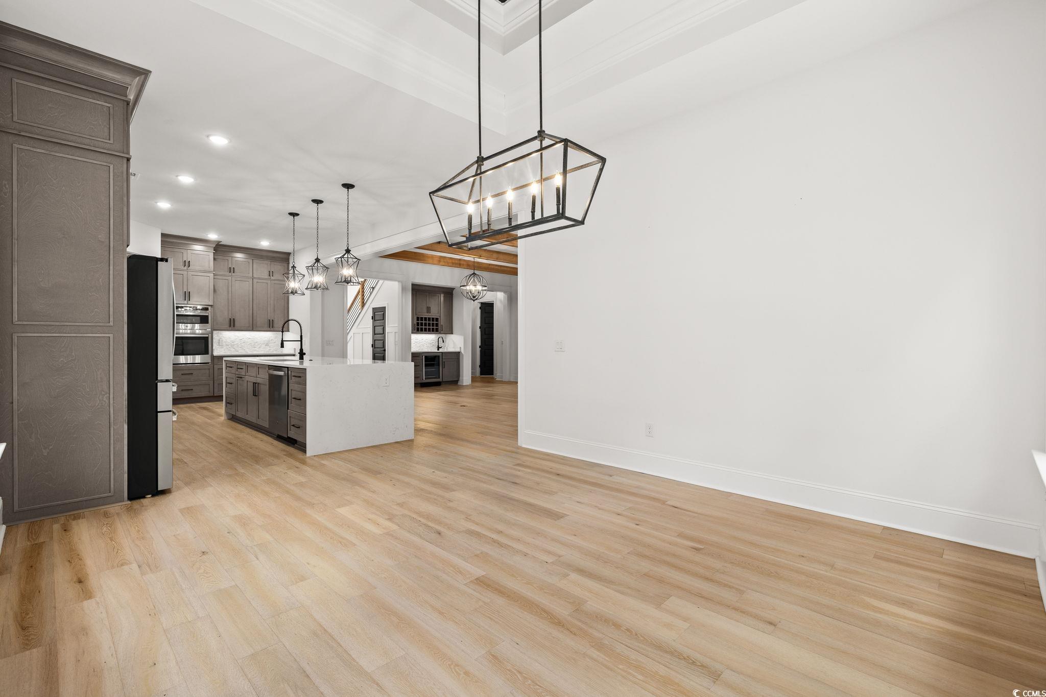 Step into this stunning and nearly new 6BR - 4BA modern home located in the desirable Waterway Palms Plantation, nestled within the award-winning Carolina Forest school district. With easy access to both Highway 31 and 17, and just a short 10-minute drive to the beach, this home offers the perfect balance of tranquility and convenience. From the charming front porch and attached two-car garage, youre welcomed into an impressive foyer with gleaming hardwood floors and wainscoting accents. Just off the entryway, you'll find a spacious guest suite complete with its own ensuite bath featuring tile floors and a sleek glass-door shower/tub combo. The heart of the home is the inviting living room, where a wood-beam ceiling, custom built-in shelving and cabinetry, an electric fireplace, and a full wet bar with wine fridge set the stage for effortless entertaining. Large sliding doors open to a screened-in back porch with wood ceiling and TV mount, creating a perfect transition to outdoor living. The dining area features a tray ceiling and is surrounded by windows that offer peaceful wooded views. In the gourmet kitchen, no detail has been overlooked, from Corian countertops to the custom tile backsplash and stainless-steel appliances. The kitchen is a chef's dream, complete with striking black hardware, a farmhouse sink, and an island with a breakfast bar perfect for serving weekend brunch. There is an extra large pantry with custom shelving to tie everything together. The luxurious first-floor primary suite boasts a beam ceiling, custom accent wall, walk-in closet with built-in shelving, and a spa-like ensuite bath with dual vanities, a separate water closet, and a fully tiled custom shower with double shower heads and a privacy window. Connected to the owners suite is a stylish laundry room with herringbone flooring, sink, and cabinetry which adds to the homes functionality. Upstairs, you'll find three additional bedrooms, two with walk-in closets (one featuring its own ensuite bath), plus a large bonus room and additional storage space. Enjoy peaceful evenings on the back patio featuring a built-in brick surround for the gas grill, overlooking the fully fenced backyard with mature trees. This exceptional property offers modern elegance, thoughtful details, and a quiet wooded backdrop and all just minutes from the coast and conveniences.