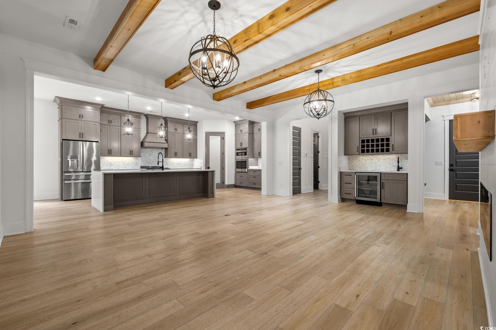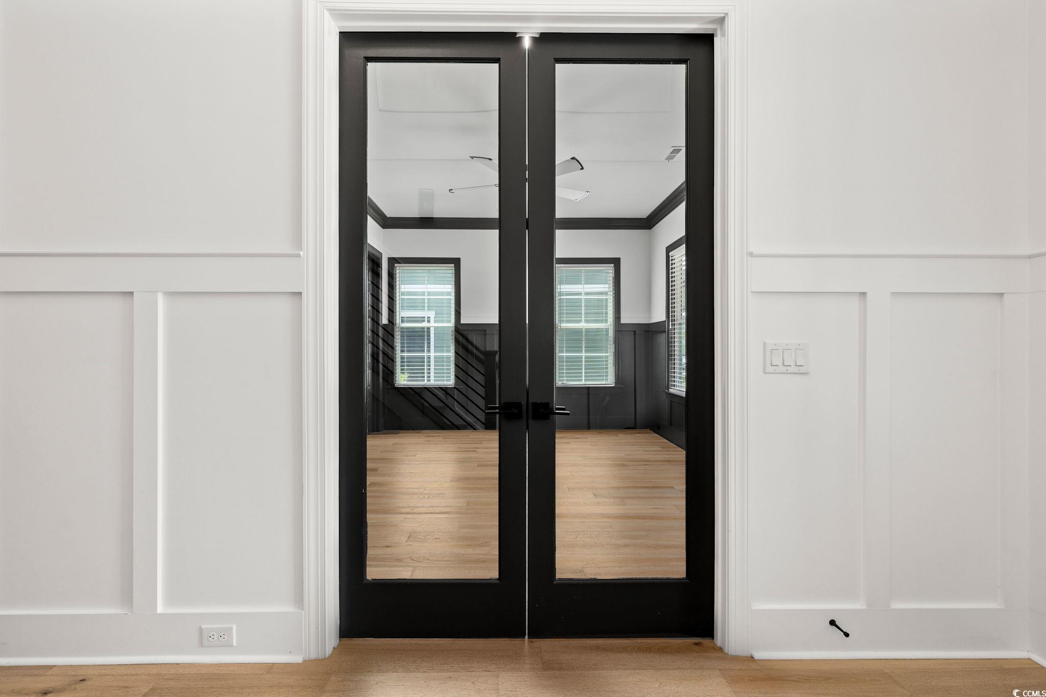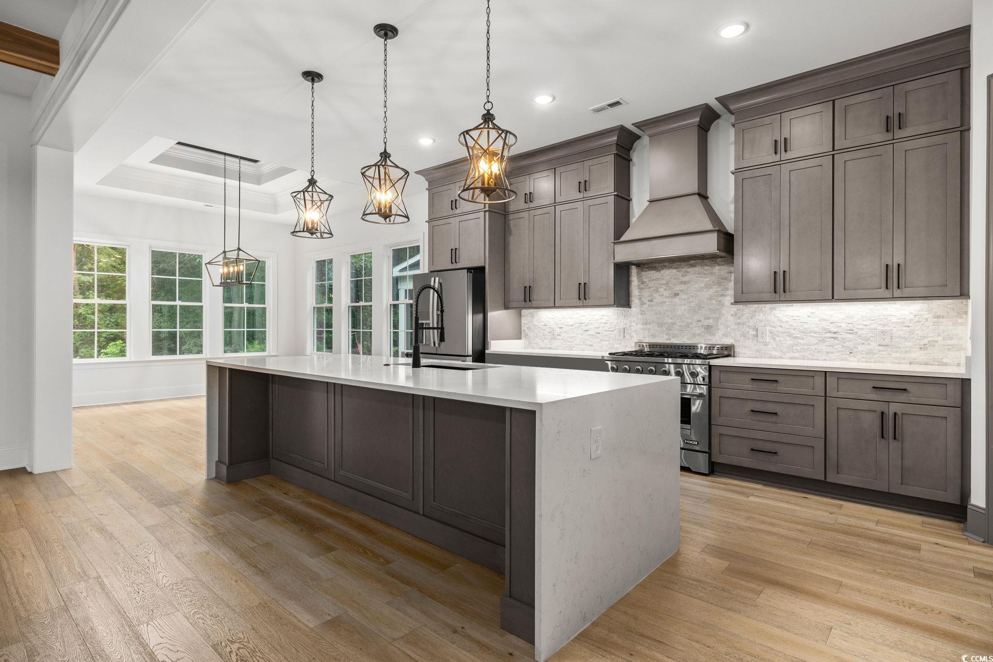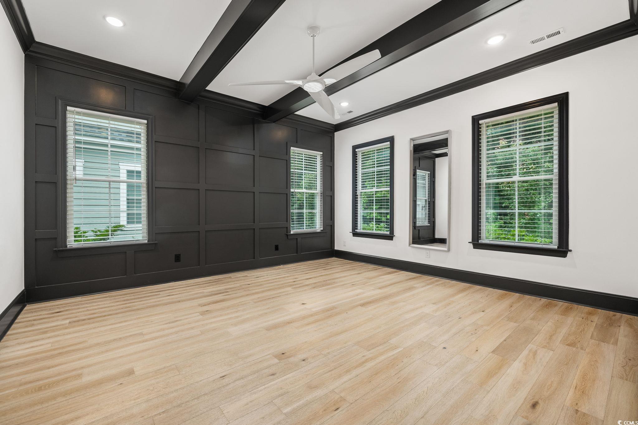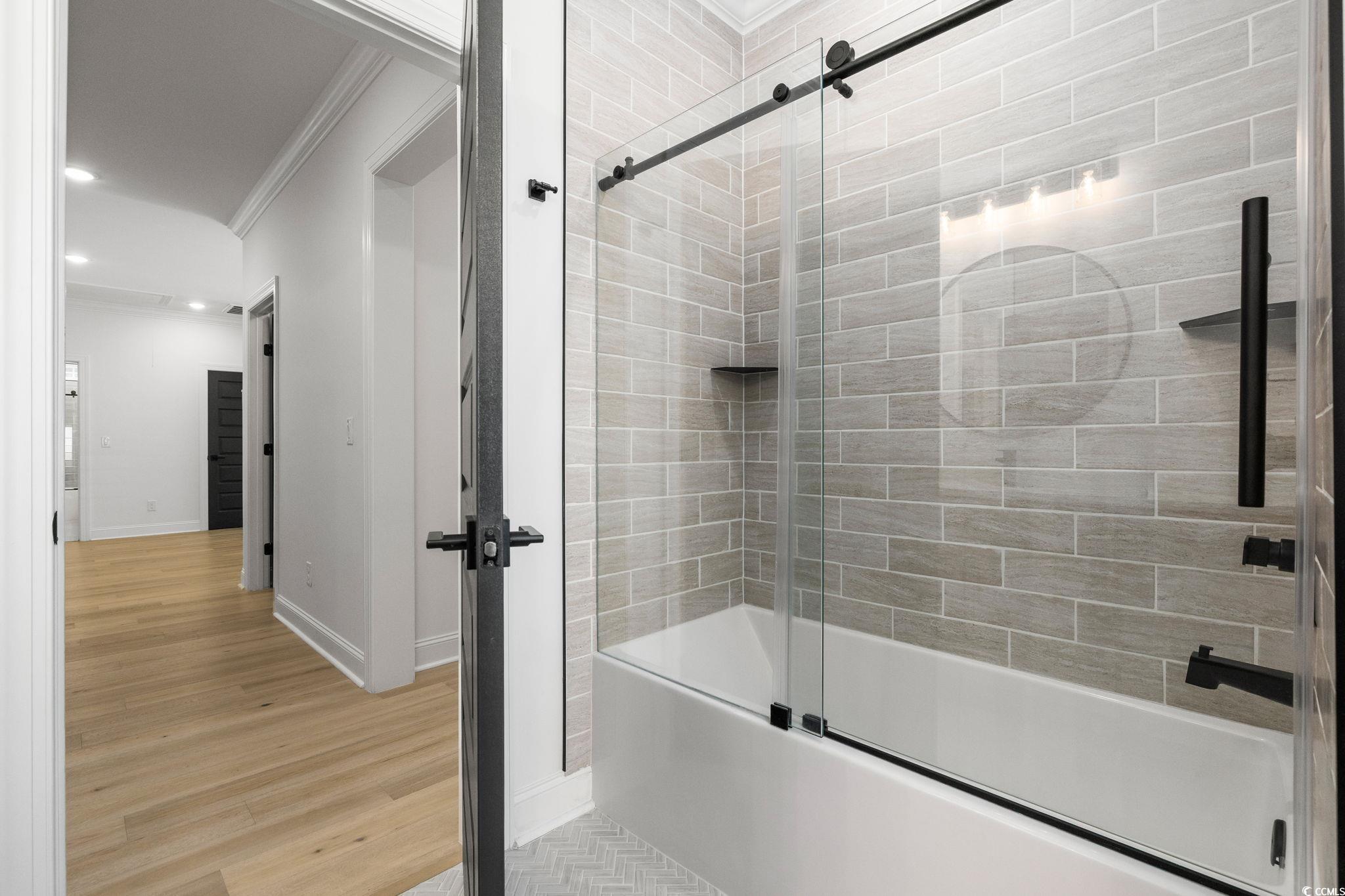 Step into this stunning and nearly new 6BR - 4BA modern home located in the desirable Waterway Palms Plantation, nestled within the award-winning Carolina Forest school district. With easy access to both Highway 31 and 17, and just a short 10-minute drive to the beach, this home offers the perfect balance of tranquility and convenience. From the charming front porch and attached two-car garage, youre welcomed into an impressive foyer with gleaming hardwood floors and wainscoting accents. Just off the entryway, you'll find a spacious guest suite complete with its own ensuite bath featuring tile floors and a sleek glass-door shower/tub combo. The heart of the home is the inviting living room, where a wood-beam ceiling, custom built-in shelving and cabinetry, an electric fireplace, and a full wet bar with wine fridge set the stage for effortless entertaining. Large sliding doors open to a screened-in back porch with wood ceiling and TV mount, creating a perfect transition to outdoor living. The dining area features a tray ceiling and is surrounded by windows that offer peaceful wooded views. In the gourmet kitchen, no detail has been overlooked, from Corian countertops to the custom tile backsplash and stainless-steel appliances. The kitchen is a chef's dream, complete with striking black hardware, a farmhouse sink, and an island with a breakfast bar perfect for serving weekend brunch. There is an extra large pantry with custom shelving to tie everything together. The luxurious first-floor primary suite boasts a beam ceiling, custom accent wall, walk-in closet with built-in shelving, and a spa-like ensuite bath with dual vanities, a separate water closet, and a fully tiled custom shower with double shower heads and a privacy window. Connected to the owners suite is a stylish laundry room with herringbone flooring, sink, and cabinetry which adds to the homes functionality. Upstairs, you'll find three additional bedrooms, two with walk-in closets (one featuring its own ensuite bath), plus a large bonus room and additional storage space. Enjoy peaceful evenings on the back patio featuring a built-in brick surround for the gas grill, overlooking the fully fenced backyard with mature trees. This exceptional property offers modern elegance, thoughtful details, and a quiet wooded backdrop and all just minutes from the coast and conveniences.