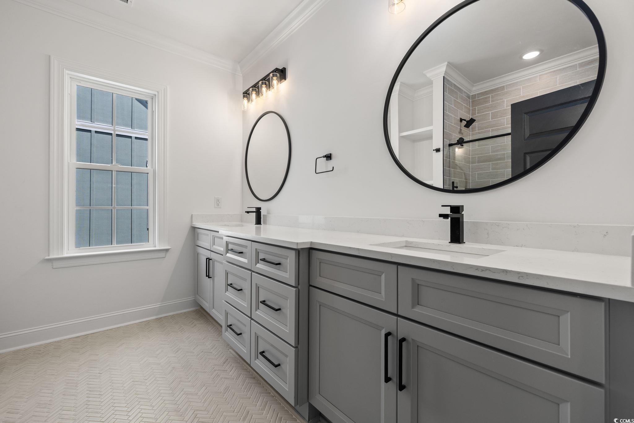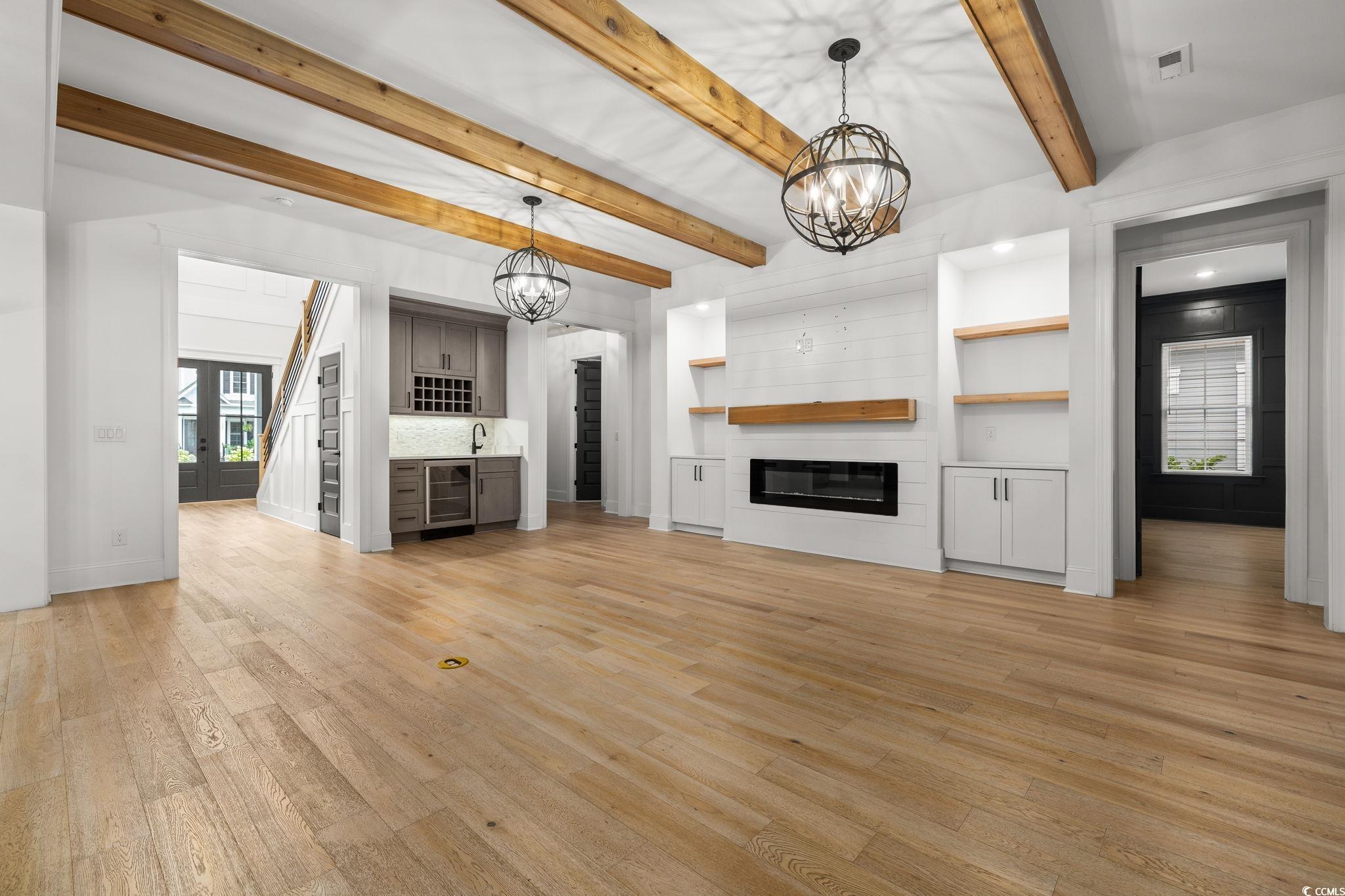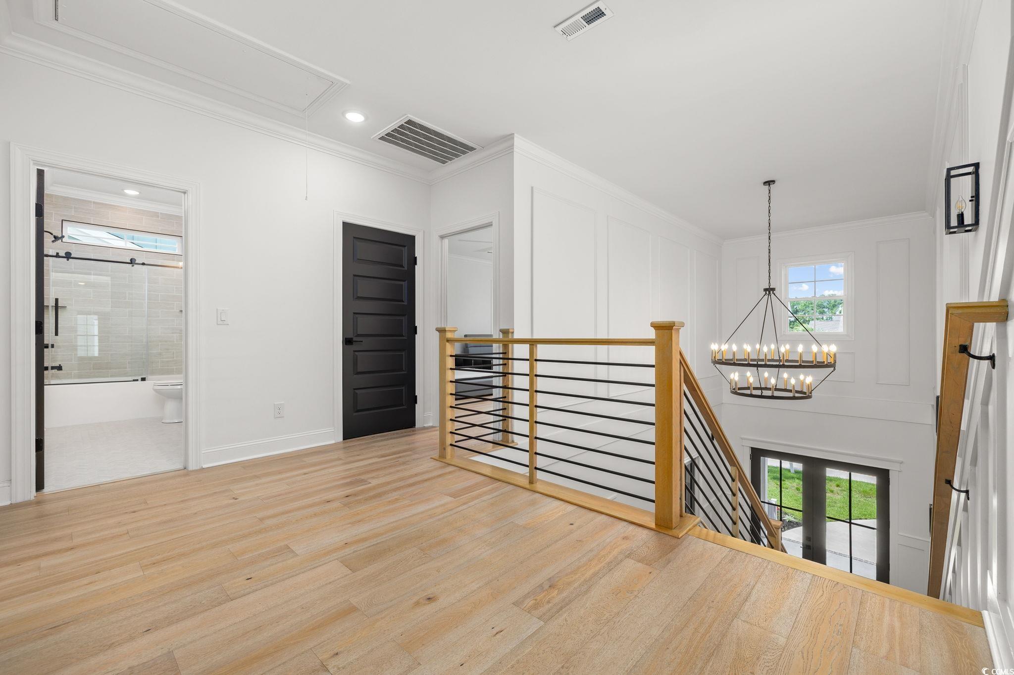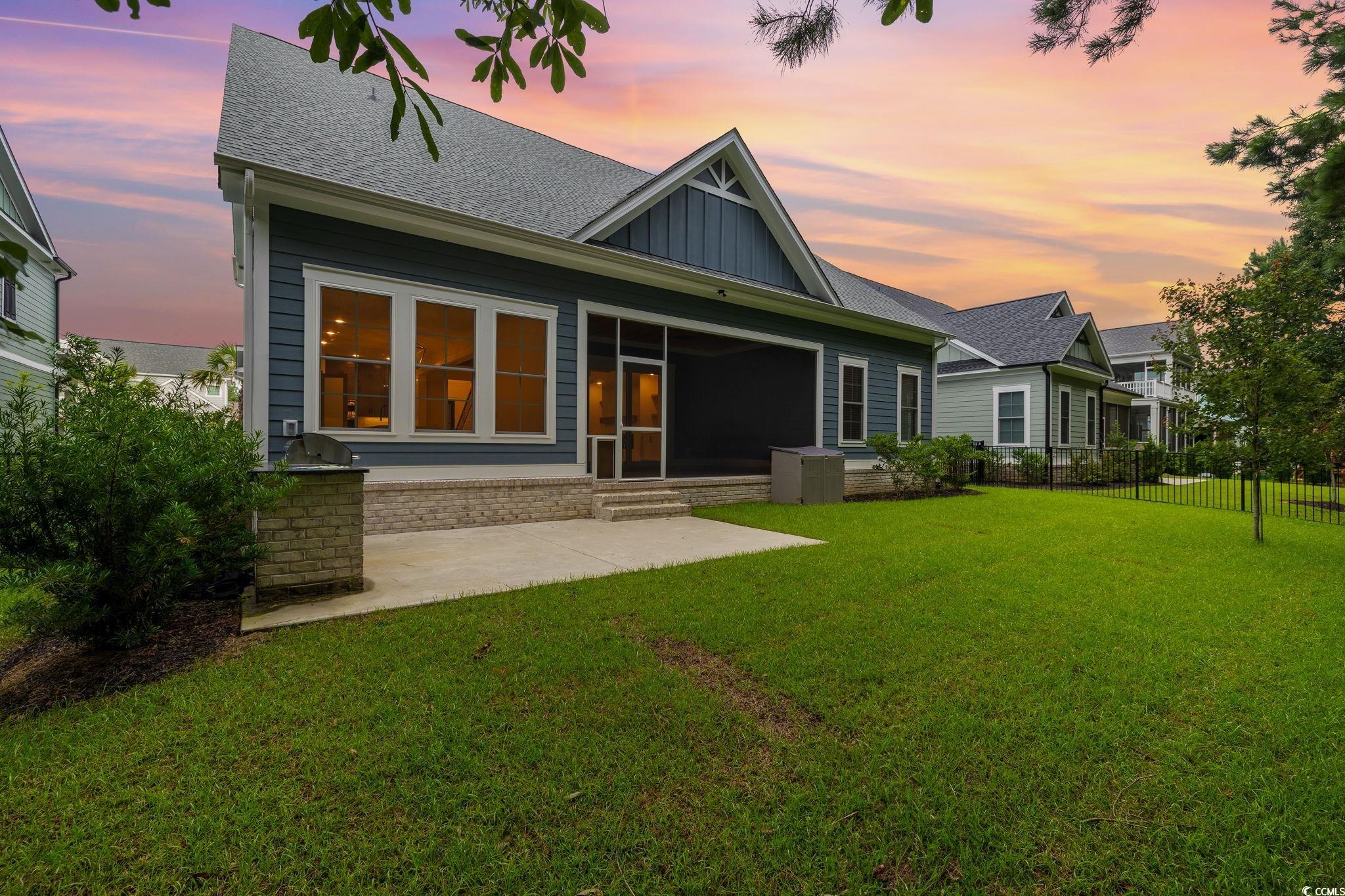 Step into this stunning and nearly new 6BR - 4BA modern home located in the desirable Waterway Palms Plantation, nestled within the award-winning Carolina Forest school district. With easy access to both Highway 31 and 17, and just a short 10-minute drive to the beach, this home offers the perfect balance of tranquility and convenience. From the charming front porch and attached two-car garage, youre welcomed into an impressive foyer with gleaming hardwood floors and wainscoting accents. Just off the entryway, you'll find a spacious guest suite complete with its own ensuite bath featuring tile floors and a sleek glass-door shower/tub combo. The heart of the home is the inviting living room, where a wood-beam ceiling, custom built-in shelving and cabinetry, an electric fireplace, and a full wet bar with wine fridge set the stage for effortless entertaining. Large sliding doors open to a screened-in back porch with wood ceiling and TV mount, creating a perfect transition to outdoor living. The dining area features a tray ceiling and is surrounded by windows that offer peaceful wooded views. In the gourmet kitchen, no detail has been overlooked, from Corian countertops to the custom tile backsplash and stainless-steel appliances. The kitchen is a chef's dream, complete with striking black hardware, a farmhouse sink, and an island with a breakfast bar perfect for serving weekend brunch. There is an extra large pantry with custom shelving to tie everything together. The luxurious first-floor primary suite boasts a beam ceiling, custom accent wall, walk-in closet with built-in shelving, and a spa-like ensuite bath with dual vanities, a separate water closet, and a fully tiled custom shower with double shower heads and a privacy window. Connected to the owners suite is a stylish laundry room with herringbone flooring, sink, and cabinetry which adds to the homes functionality. Upstairs, you'll find three additional bedrooms, two with walk-in closets (one featuring its own ensuite bath), plus a large bonus room and additional storage space. Enjoy peaceful evenings on the back patio featuring a built-in brick surround for the gas grill, overlooking the fully fenced backyard with mature trees. This exceptional property offers modern elegance, thoughtful details, and a quiet wooded backdrop and all just minutes from the coast and conveniences.