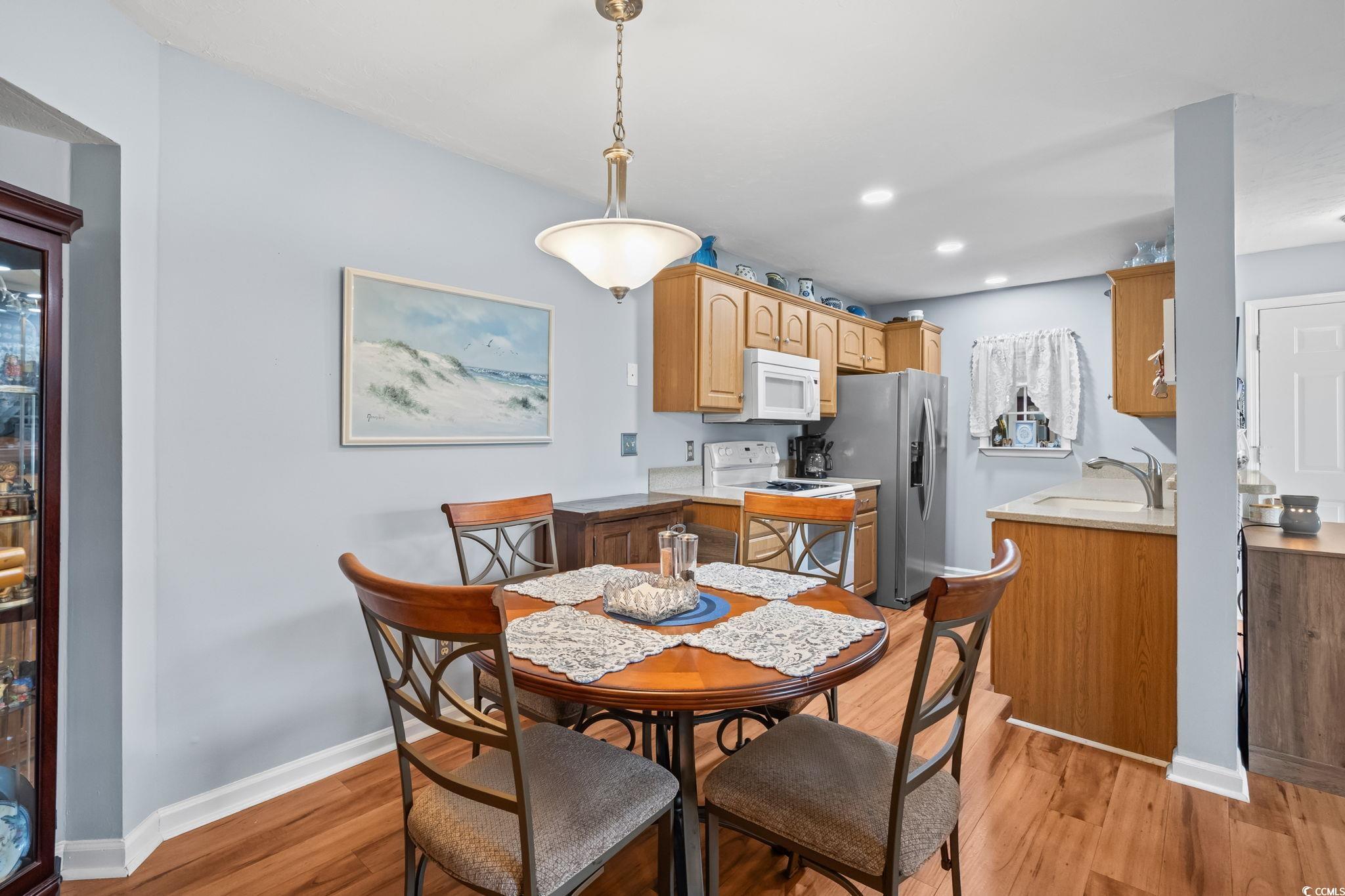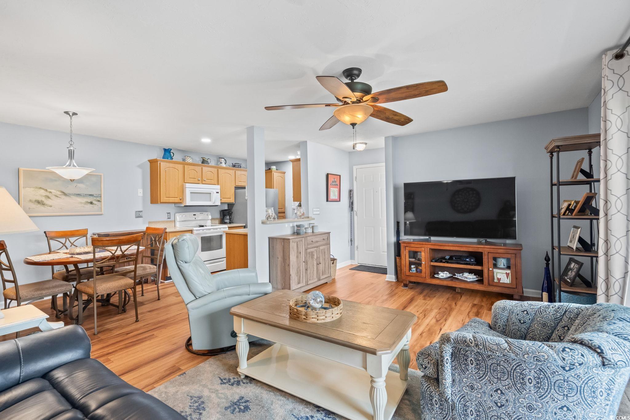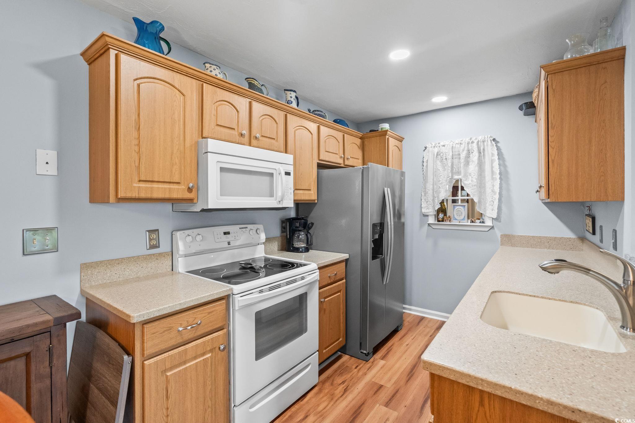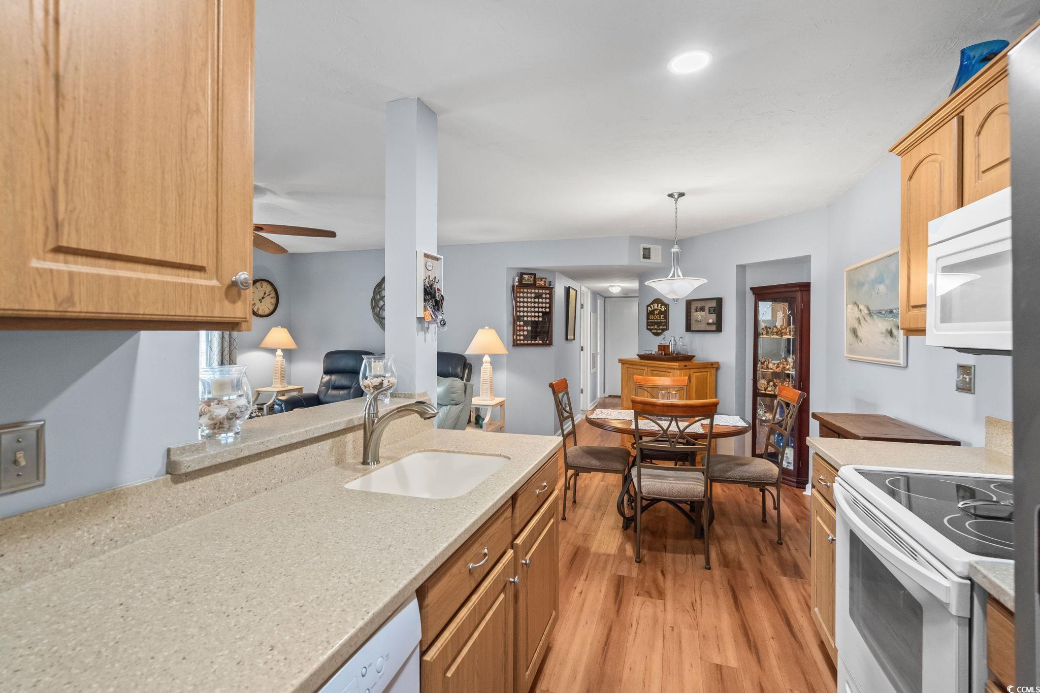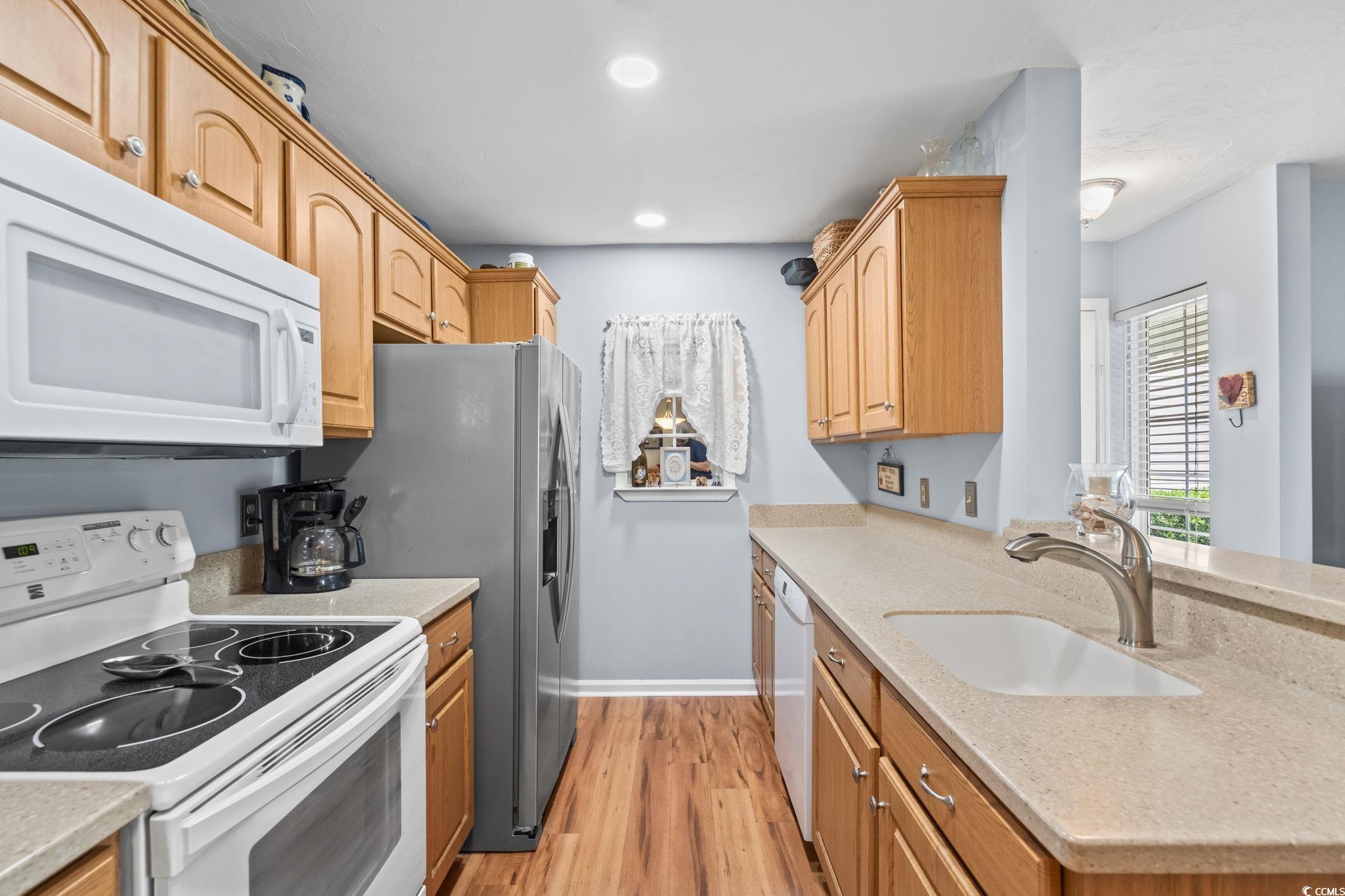 Welcome to this fully upgraded 3 bedroom, 2 bath condo only 4 minutes to Surfside Beach! This move-in ready home features brand-new luxury vinyl plank flooring throughout, freshly smoothed ceilings (no popcorn here!) and updated lighting throughout the home. The sizable kitchen includes Corian countertops and sink, recessed lighting, pull out drawers in the pantry, a water filtration system and a new stainless steel refrigerator! Both the secondary bedrooms are sizable with upgraded ceiling fans. The secondary bathroom has been refreshed with new cabinetry, a refinished tub, and a refaced vanity. In the spacious primary suite, enjoy two closets-including one walk-in-and a fully updated bathroom with upgraded cabinetry, linen storage and a newly installed cultured marble walk-in shower. Step outside to relax on your screened-in composite porch with tile floors, ceiling fan, and private storage closet. Peace of mind comes easy with a newer HVAC system and water heater (both less than 3 years old), plus a lifetime window warranty. The building is situated on a tranquil lake and just a short stroll to the community pool. This condo offers low-maintenance coastal living at its finest. Don't miss your chance to make it yours!