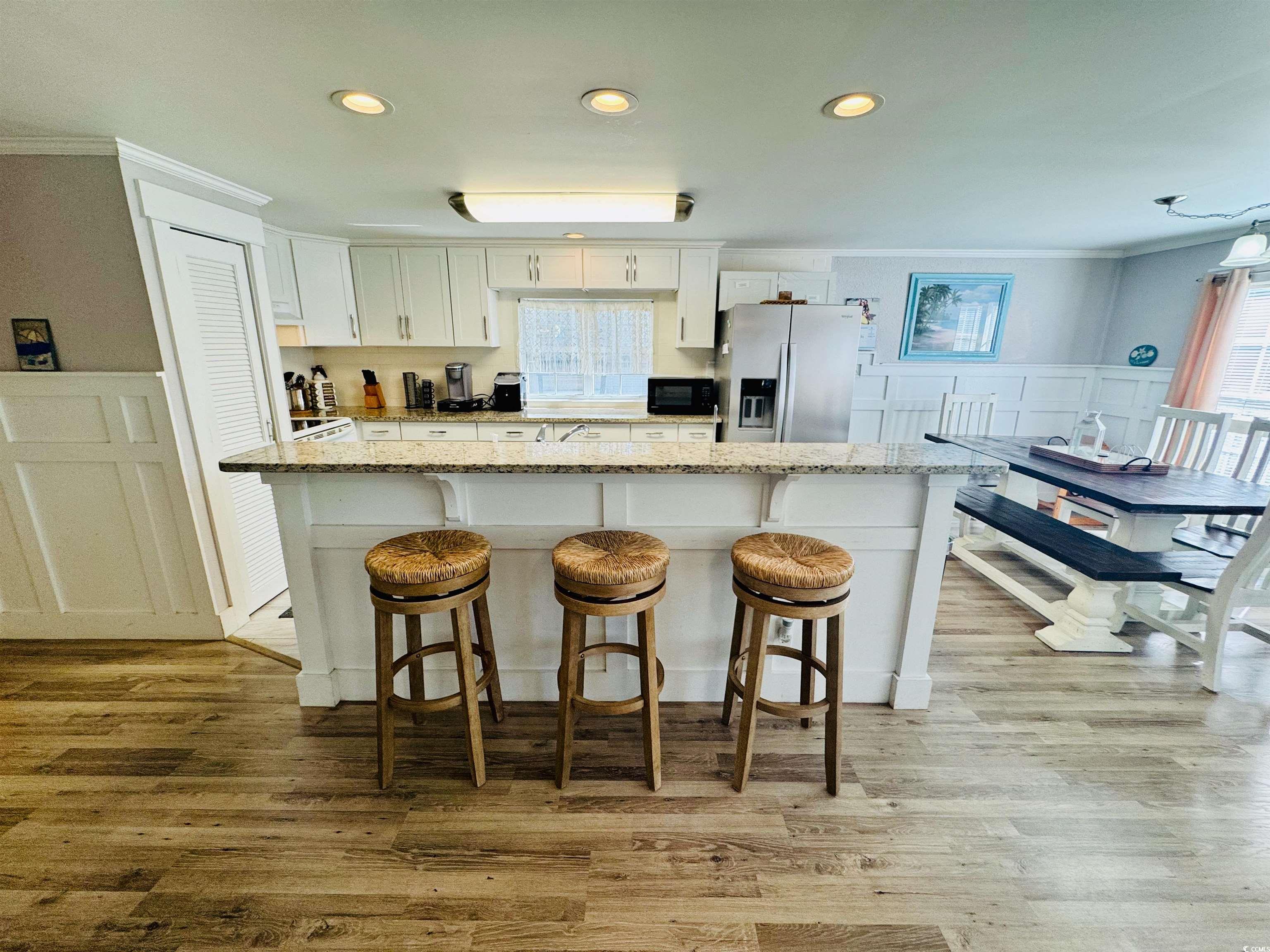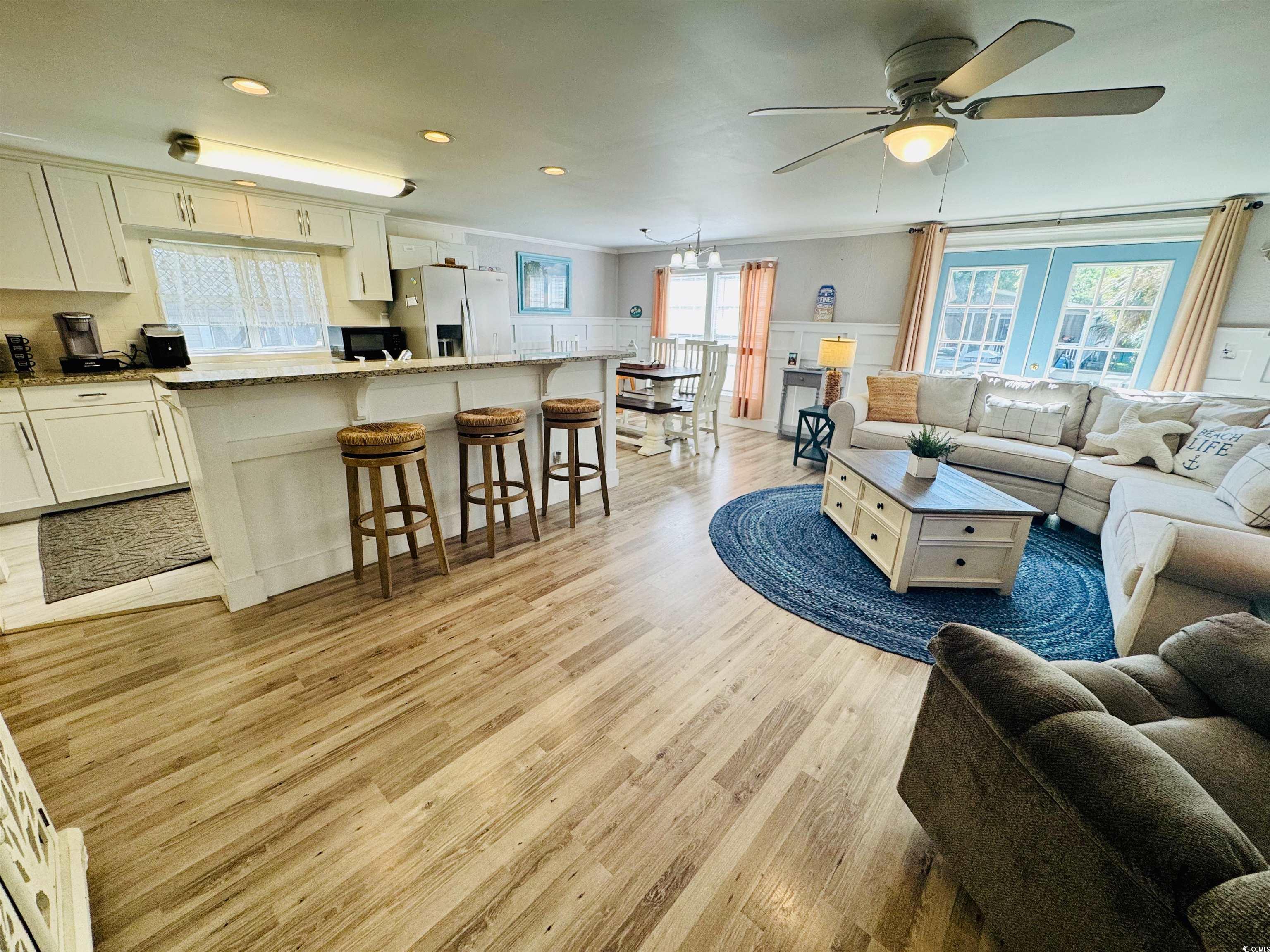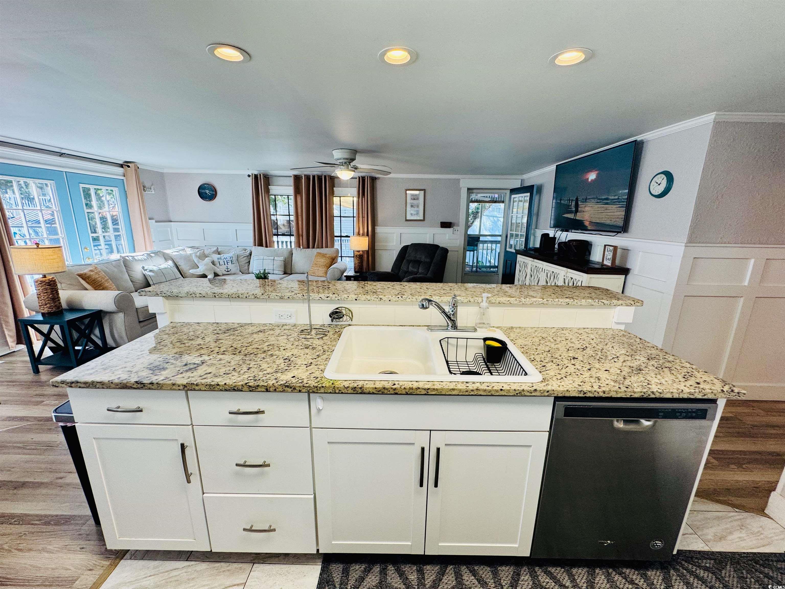 LARGE DOUBLE WIDE BEACH HOUSE ON ONE OF THE LARGEST LOTS IN OCEAN LAKES! Looking for some breathing room in Ocean Lakes? You have found it! This property offers tons of outdoor space, boat/RV parking, huge wraparound deck with covered porch, grilling area, handicap accessible deck ramp, fire pit, two detached storage buildings and an oversized paved driveway. Inside you will find a welcoming open concept floor plan with large family room, breakfast bar/work island, spacious dining area, well equipped kitchen with pantry, granite countertops, new cabinets providing lots of storage space, laundry/mud room with separate entrance, a big primary bedroom with beautiful ensuite that includes double vanities and a walk-in shower, three guest's bedrooms and a full bathroom. This home promises to be someone's new oasis at the beach. Sold fully furnished including Club Car golf cart! Now Showing! There is no HOA in Ocean Lakes however, the house is located on leased land, which is payed in two semiannual payments due in January and July. If you've never visited Ocean Lakes you must check this park out. Amenities abound in this gated, oceanfront community and include one mile of privately accessed pristine white sand beach, 24 hour security, free trash pick-up, free cable TV, indoor/outdoor swimming pools, large water park/slides, lazy river, kid's splash zone, new dog park, new beachside coffee house and ice cream bar, playgrounds, full size basketball courts, miniature golf, fire pit, corn hole, shuffle board, horseshoes, ping-pong, Sandy's Down-under skatepark, recreation building, arcade, general store, golf cart rentals, Sandy's Meet & Eat restaurant and more!