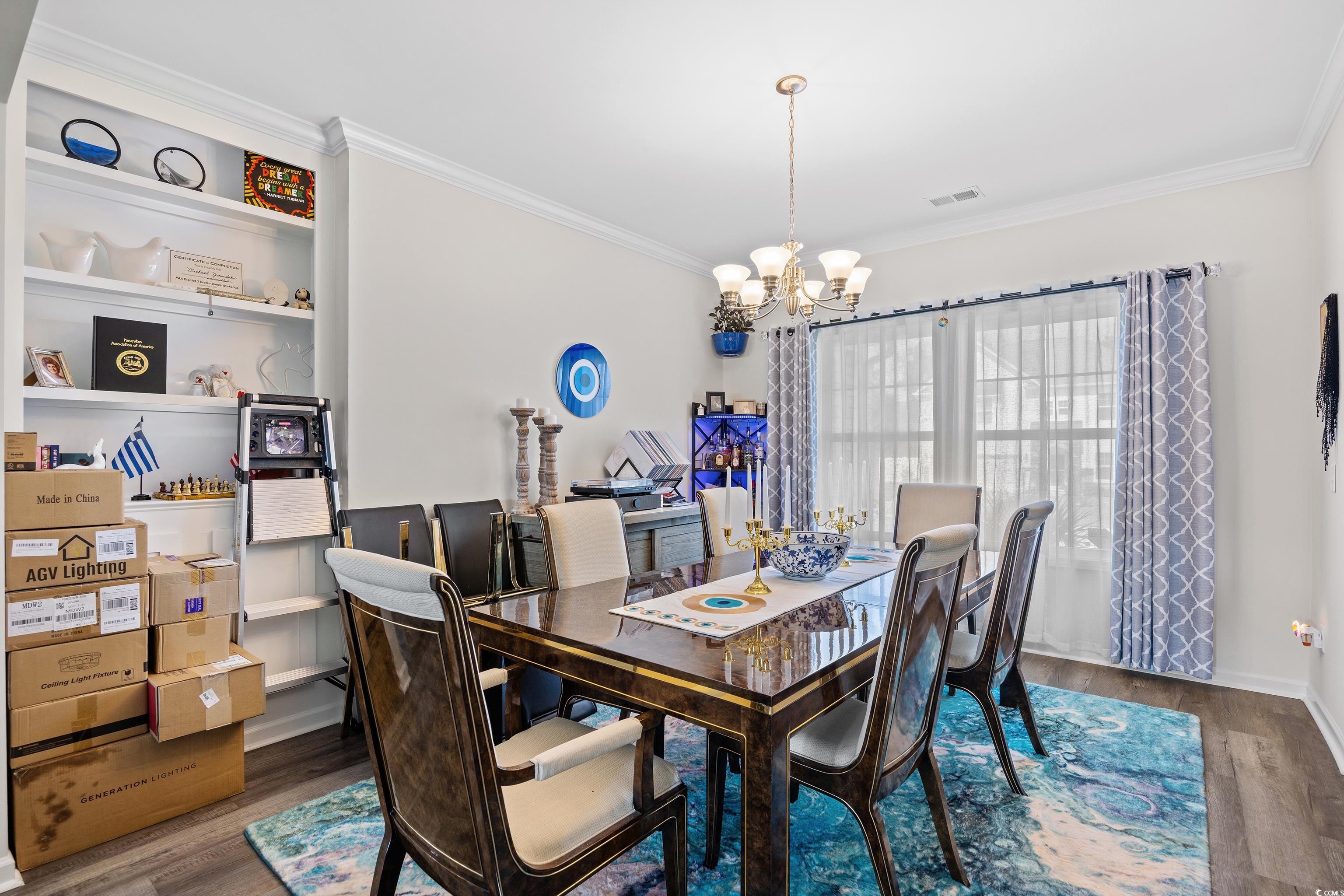 This popular Wisteria E ranch home is beautifully appointed with high quality upgrades! Vaulted ceiliings in the greatroom and Owner's suite make the well designed plan even more open and airy. Upgrades include a propane fireplace in the greatroom with a TV bracket in place above the fireplace-site built cabinets/bookshelves flank the fireplace and in the dining room and are all lighted; black accent upgraded hardware on cabinets, the kitchen is a cook's dream with a gas range; upgraded dishwasher; upgraded microwave; upgraded kitchen faucet and farm sink; tile backsplash, 3 cm granite countertops; large walk in pantry; kitchen island with storage; soft close doors and drawers, Luxury vinyl flooring everywhere except bedrooms; bathrooms have comfort height toliets and upgraded lighting; upgraded shower heads and faucets and a tiled shower with a tiled mudbed in the owner's bath. This home also has a nice covered patio on the back with raised cable and electrical outlets in place for a TV; a remote controlled ceiling fan; fully fenced back yard and irrigation system! Home also has a 220 outlet located in the garage, and gutters on the exterior. Beautifully landscaped yard featuring a raised retaining wall for raised flower bed with irrigation throughout the flowerbeds. This home is built on an elevated slab foundation, offering peace of mind, with no concerns about flooding or water intrusion. The raised design not only enhances durability but also provides a solid feel throughtout the home. Grissett Landing is located just 4 miles outside of downtown Conway located on the beautiful Waccamaw River. The community feautures a floating dock, a fire pit and green area for residents. Grissett is convenient to shopping, dining and approximately 25 to 30 minutes to the beach.
