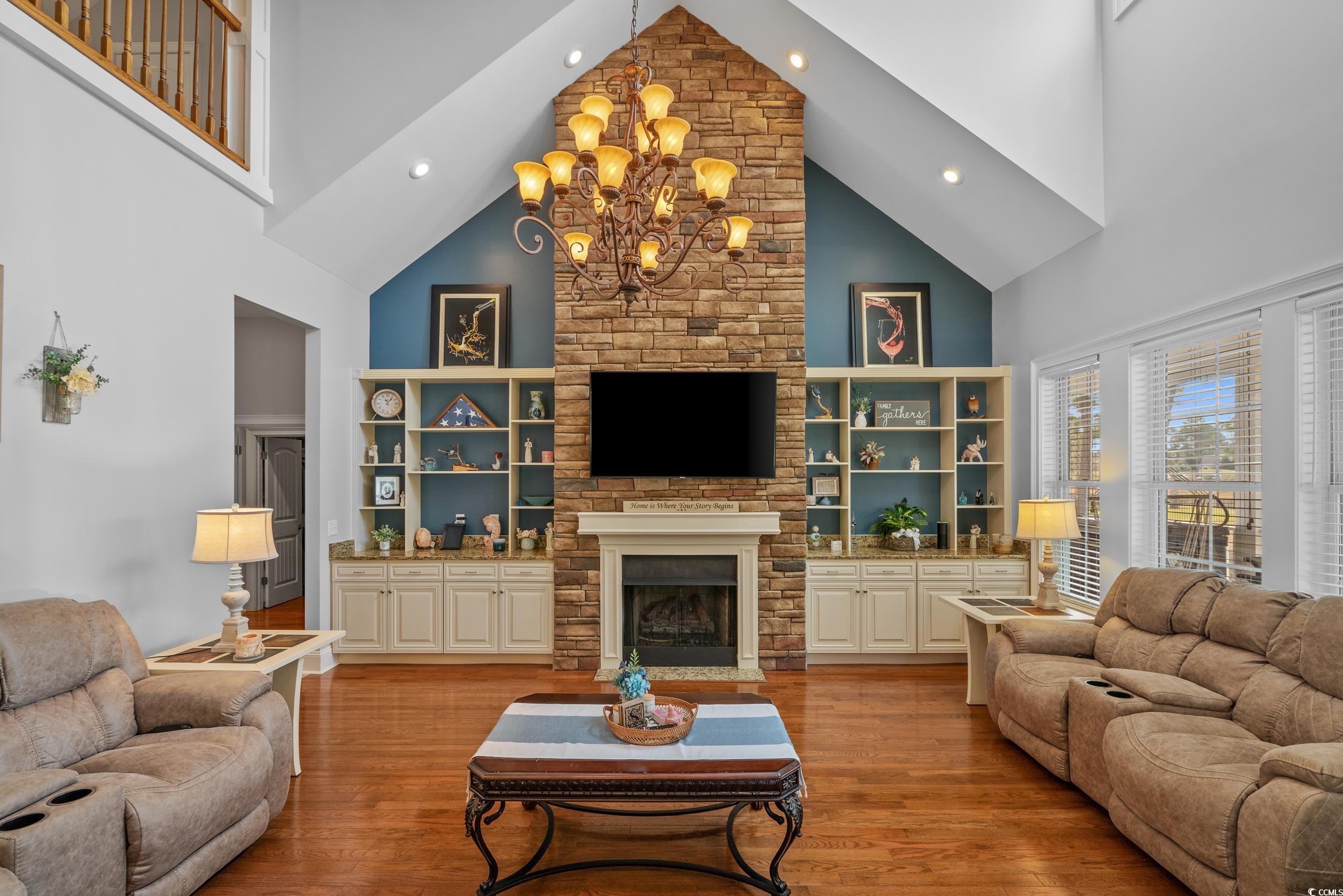 This stunning custom-built coastal cottage home in the Waterbridge Community is a true masterpiece, offering luxury and charm in every detail. From the inviting front porch and beautifully designed circular paver driveway to the oversized garage with a separate golf cart door, every aspect of this home exudes quality and elegance. Inside, you are welcomed with soaring cathedral ceilings and rich hardwood flooring that creates a grand yet inviting atmosphere. A breathtaking natural stone feature wall framing a cozy gas fireplace and custom built-in storage, shelving and granite tops serves as the focal point of the living space. The chef's kitchen is designed to impress, featuring gas cooking, a prep sink, ample counter space and high-end finishes. Each generously sized bedroom is an ensuite, offering comfort and privacy with the primary suite being on the first floor and the two other additional bedrooms are upstairs with a beautiful open airy hallway connecting the two. Above the oversized garage is a massive bonus room with a half bath and a private entrance that provides endless possibilities for an office, theater, playroom, or non-conforming bedroom. There is a large storage space that could easily be partitioned to make this room an ensuite bedroom if desired. Both HVAC units were replaced last year for enhanced energy efficiency and peace of mind. Outside, the meticulously manicured landscaping with mature trees providing additional privacy is highlighted by low-voltage lighting throughout, making this home a true showpiece. Situated on a lake lot in the prestigious gated community of Waterbridge in Phase 1, residents enjoy access to South Carolina's largest residential pool along with world-class amenities, including bocce, pickleball, tennis, basketball, volleyball, a fitness center, and more. This home is conveniently situated close to the entrances. All of this is centrally located and just minutes away from fine dining, entertainment, top notch school, medical facilities and your toes from being in the sand. Experience the perfect blend of luxury, comfort, and resort-style living in this exceptional property!