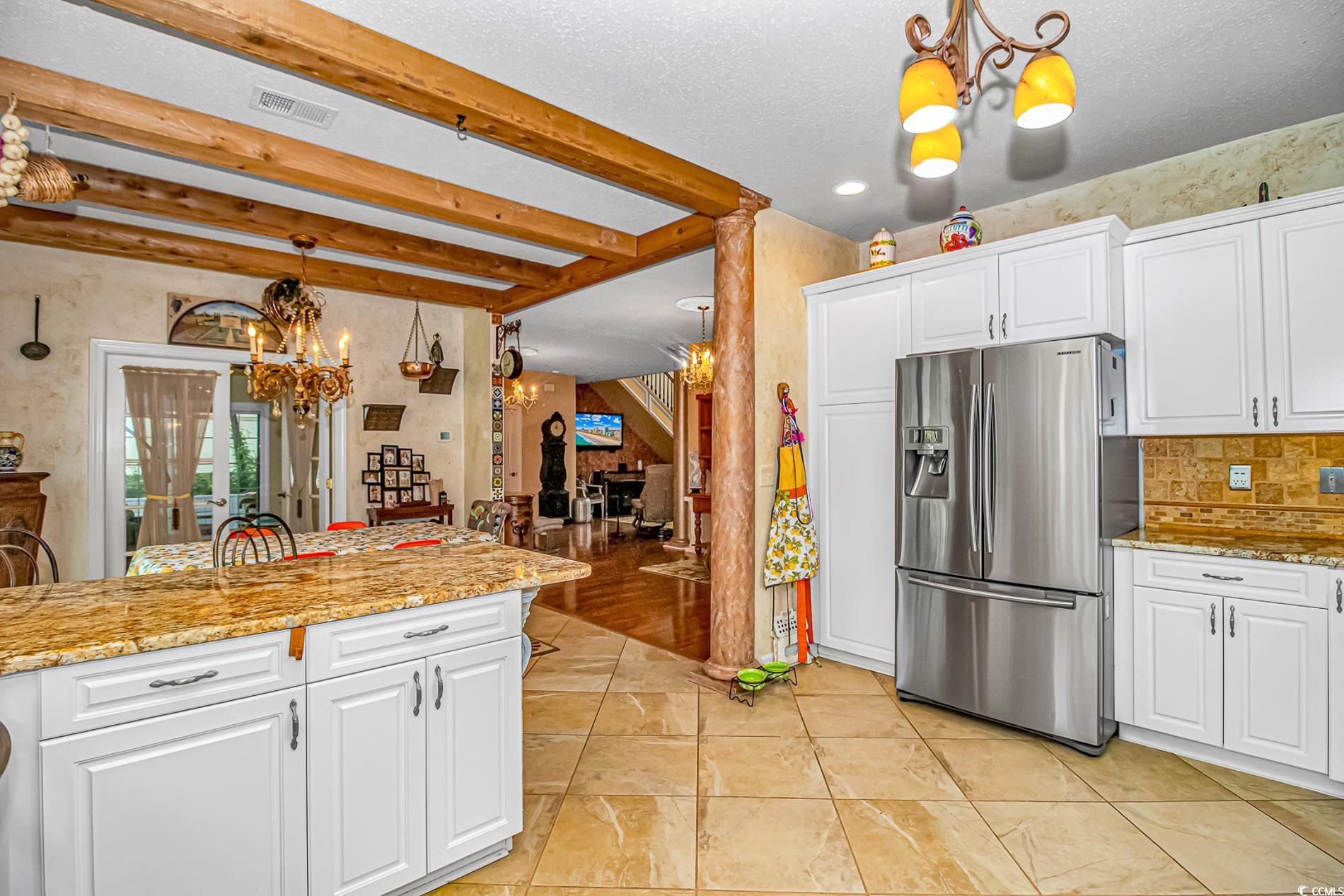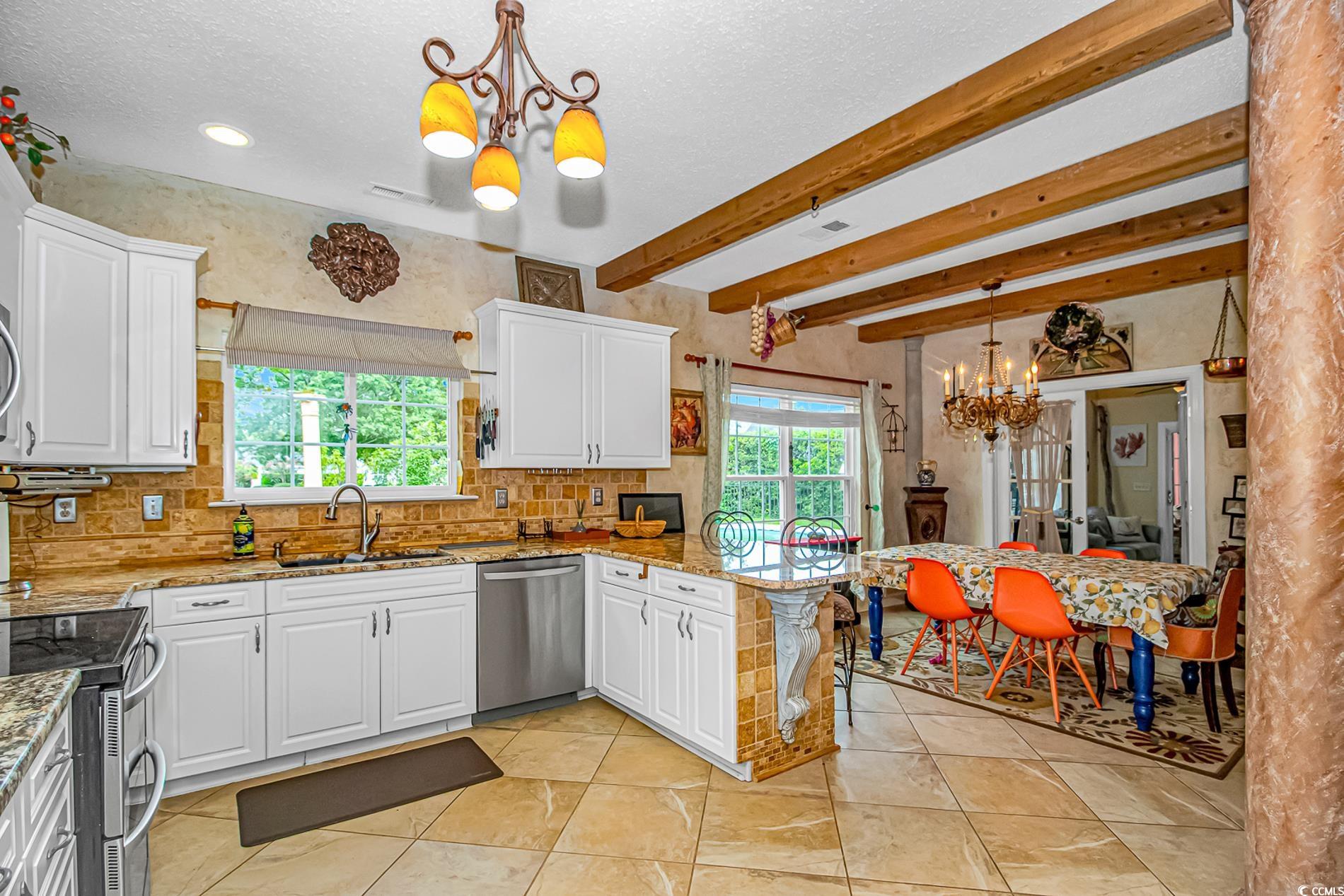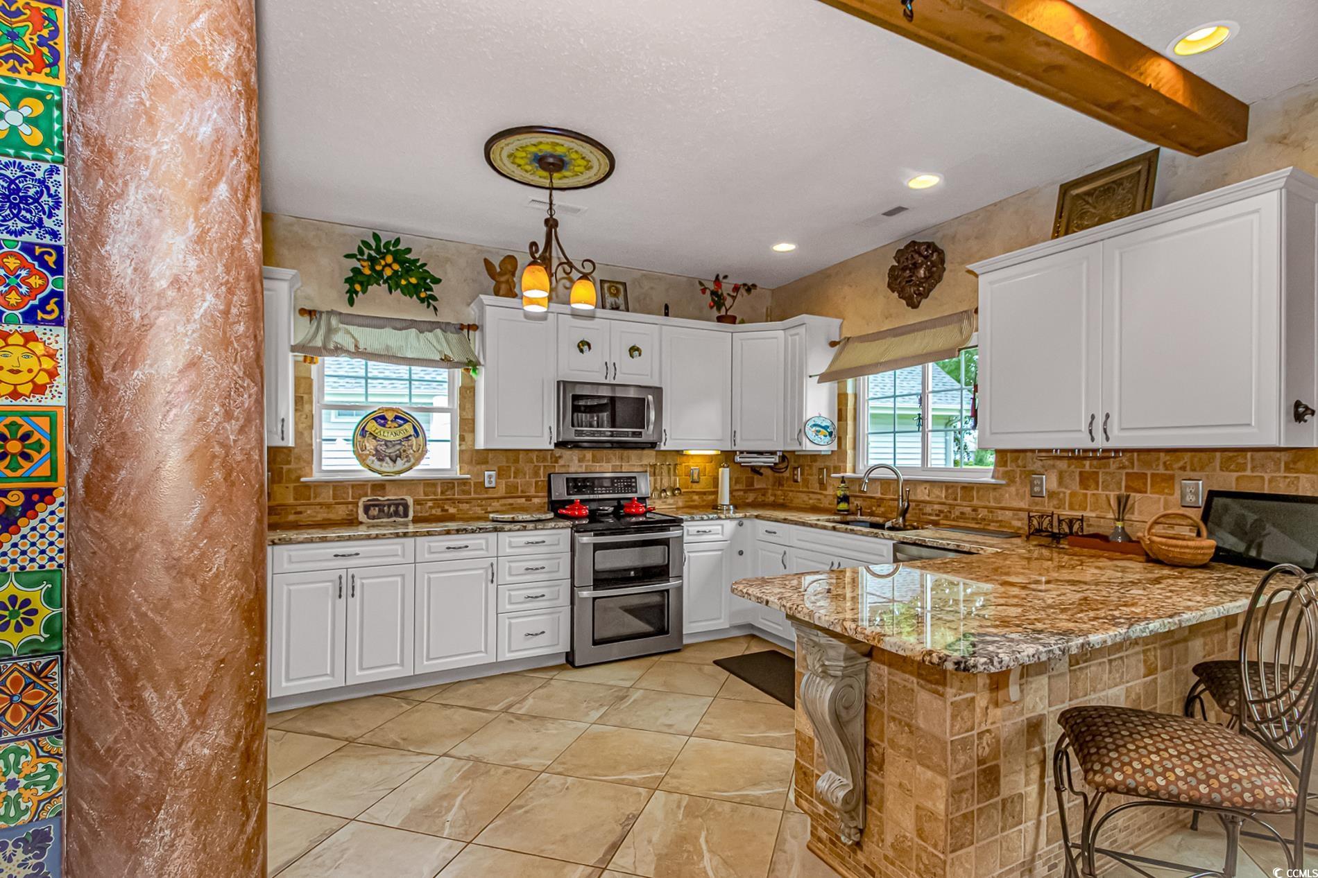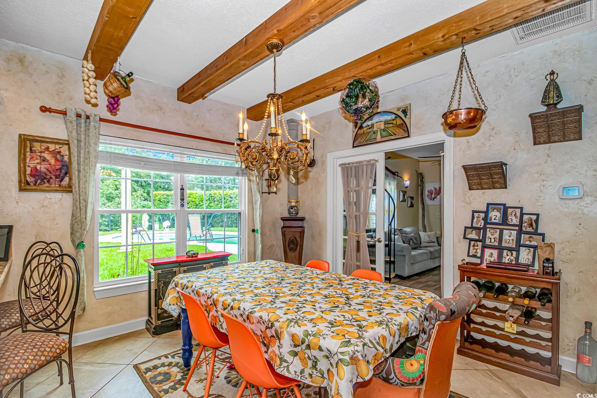 Charming 3-Bedroom Retreat in The Lakes, Myrtle Beach. Discover your dream home at 299 Catawba River Road, nestled in the desirable Lakes Subdivision, just 5 miles from the sun-kissed shores of Surfside Beach. This stunning 3-bedroom, 2.5-bathroom residence combines modern elegance with coastal charm, perfect for those seeking a serene escape. Step inside to a grand vaulted ceiling that soars above the open living area, showcasing beautiful flooring throughout. The main-level master suite is a true sanctuary, featuring a beautifully renovated master bathroom. The heart of the home is the expansive kitchen, boasting granite countertops, stainless steel appliances, and a double oven, seamlessly flowing into a dining area adorned with rustic beams. A convenient walk-in laundry room and an attached two-car garage add practicality to this stylish home. Upstairs, find two spacious bedrooms, one with a generous sitting area and a unique spiral staircase descending to the bright sunroom below. Step outside from the sunroom to a screened porch, perfect for relaxing while overlooking the sparkling Viking-installed swimming pool and tranquil community pond. The fenced backyard includes an outdoor shower, ideal for rinsing off after a dip. Enjoy lazy afternoons on the inviting covered front porch or host gatherings in this entertainers paradise. With its prime location and thoughtful upgrades, this Myrtle Beach gem is ready to welcome you home. Schedule a showing today!