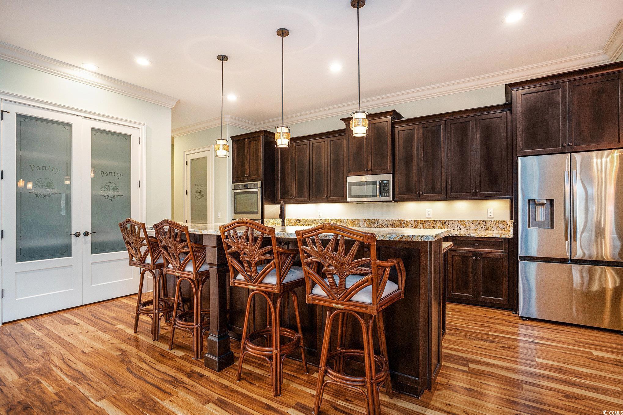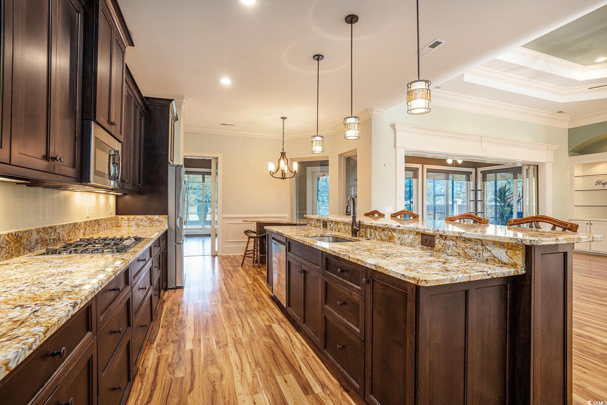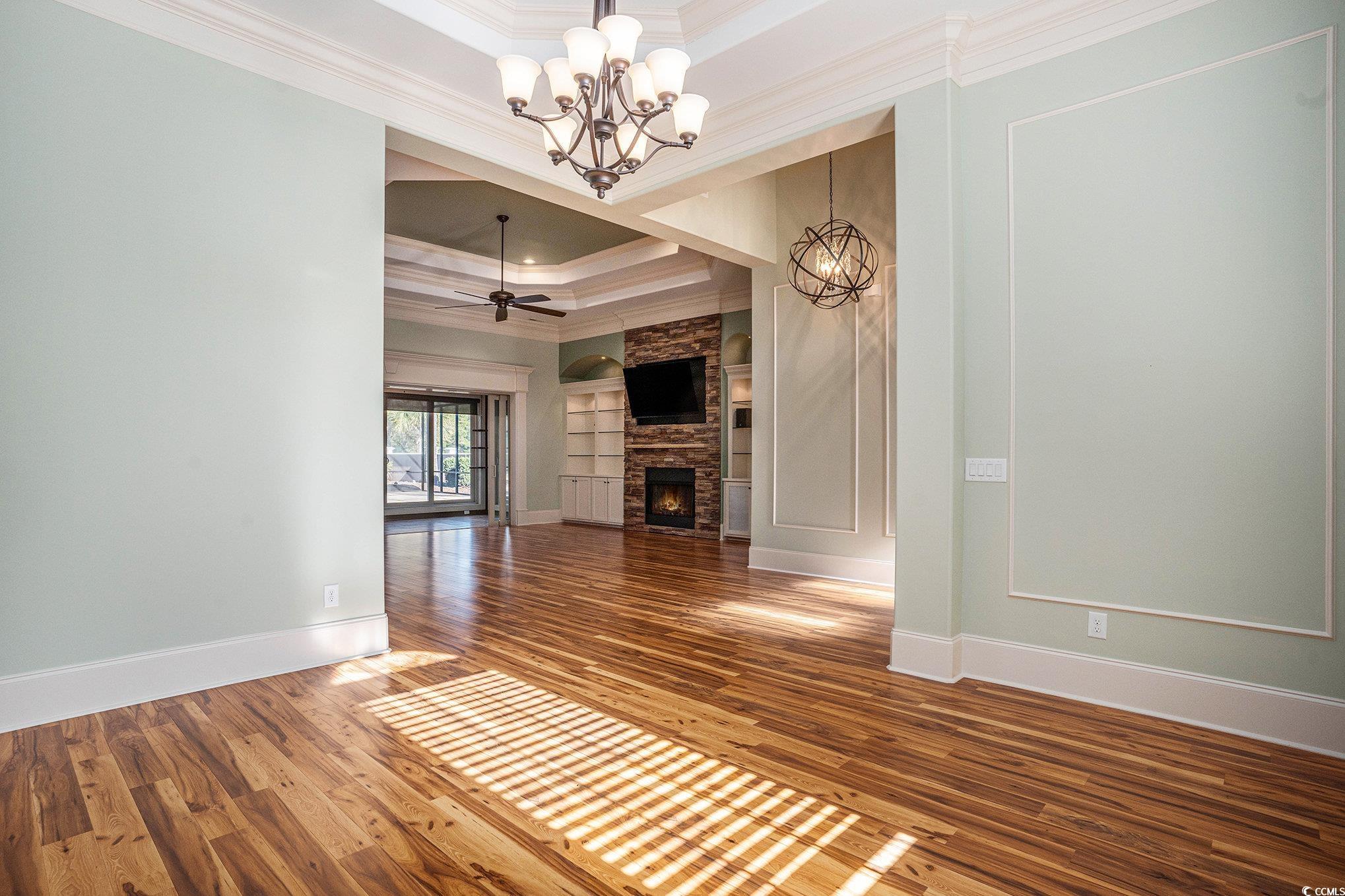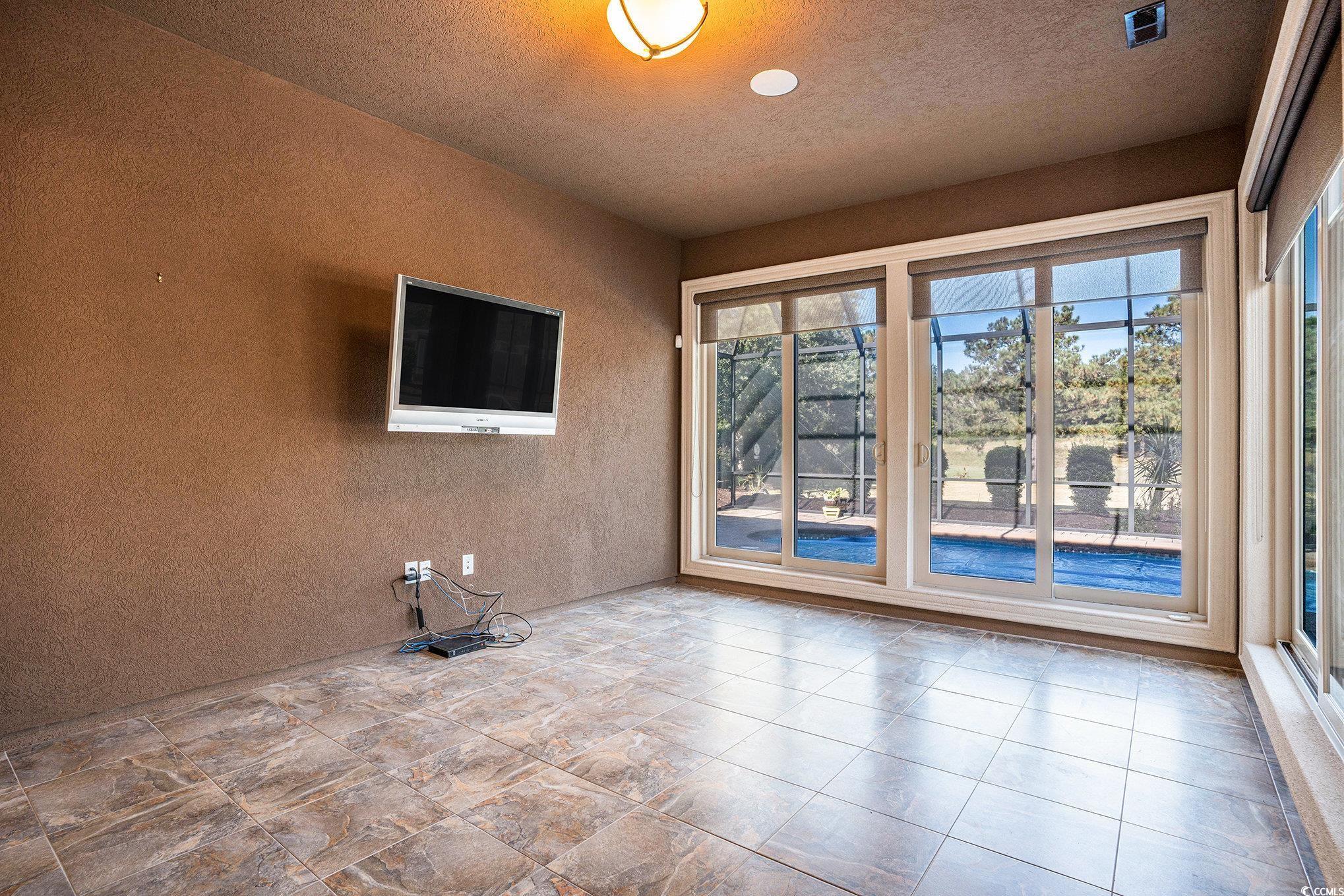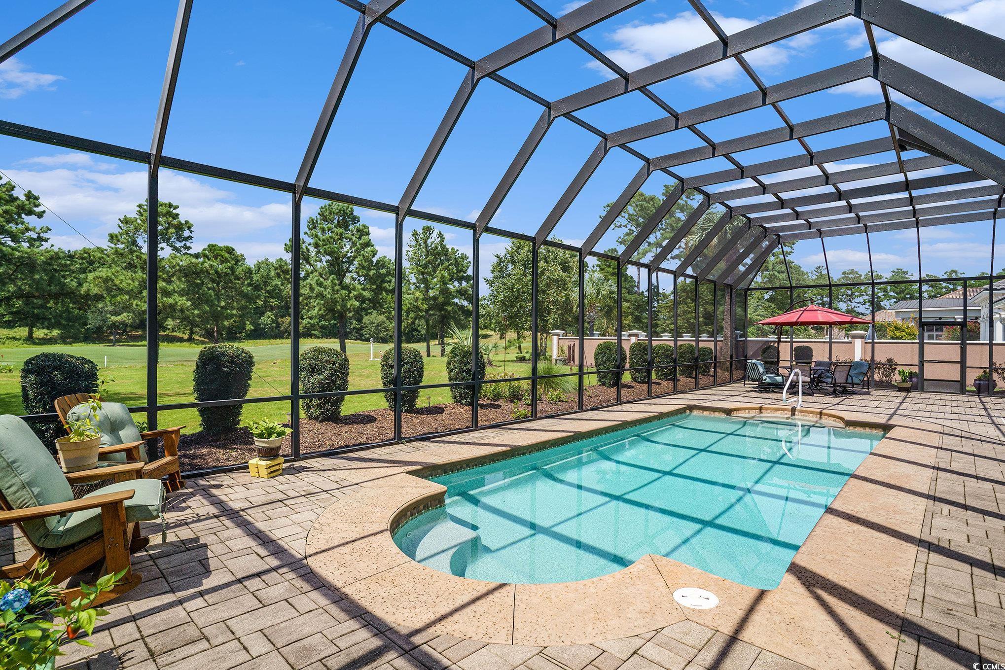 Driving through the private, gated community of Grande Dunes, you arrive at Bellasera Circle, a sought-after enclave known for its luxury homes and lush landscapes. The homes Mediterranean-inspired architecture, with its barrel tile roof, stone-accented entry, and lush palm-lined landscaping, immediately sets the tone for elegance. The paver driveway leads you to an arched stone entrance with a wood-stained door entry door that speaks elegance, creating a grand first impression along with the 3 car garage. Stepping inside, youre greeted by soaring tray ceilings, detailed crown molding, and warm hardwood floors that flow seamlessly throughout the main living areas. The formal living room welcomes you with abundant natural light and a stylish chandelier, perfect for entertaining guests. Moving forward, the spacious great room becomes the heart of the home. A stacked-stone fireplace flanked by custom built-ins anchors the space, while a triple tray ceiling with soft accent lighting adds depth and character. Expansive sliding glass doors open to a sprawling screened lanai, seamlessly blending indoor and outdoor living. The gourmet kitchen offers rich wood cabinetry, beautiful countertops, and an oversized center island with seating which is perfect for those quick meals. Pendant lighting highlights the island, and a double oven and stainless-steel appliances make it a chefs dream. An adjoining breakfast nook enjoys views of the lanai and pool. On one side of the home, the owners suite provides a private retreat with tray ceilings, cool coastal colors creating the perfect relaxing atmosphere. The ensuite bathroom features dual vanities, a whirlpool tub, and a walk-through tiled shower with dual showerheads and a rain showerhead as well. The expansive walk-in closet is what dreams are made of, with a ladder to even reach the very top! Three additional guest bedrooms each offer generous space, and access to beautifully finished full bathrooms. A well-appointed large laundry room with built-in storage and a utility sink add to the homes functionality. Upstairs above the garage is a spacious 289 sq. ft. room offers endless possibilitiesperfect for a home office, media room, gym, or hobby space. With the simple addition of one duct, it can be fully heated and cooled to suit your needs year-round. Step outside to the show-stopping screened lanai, where a sparkling pool takes center stage. With multiple sitting areas, a dining space, and panoramic views of the golf course, its the perfect backdrop for both quiet mornings and lively gatherings. This home also includes a spacious three-car garage and the exceptional lifestyle amenities of Grande Dunesprivate beach access at Ocean club and oceanfront pools. Cruise your way to the Members Club or the Ocean Club IN MINUTES! This prime location in Grande Dunes offers the perfect blend of privacy and convenience, just minutes from Myrtle Beachs pristine beaches, world-class golf courses, shopping, dining, entertainment, and popular attractions along the Grand Strand. Whether youre seeking a day on the sand, a night out, or a round of golf, everything is right at your doorstep. Buyer is responsible for verification.