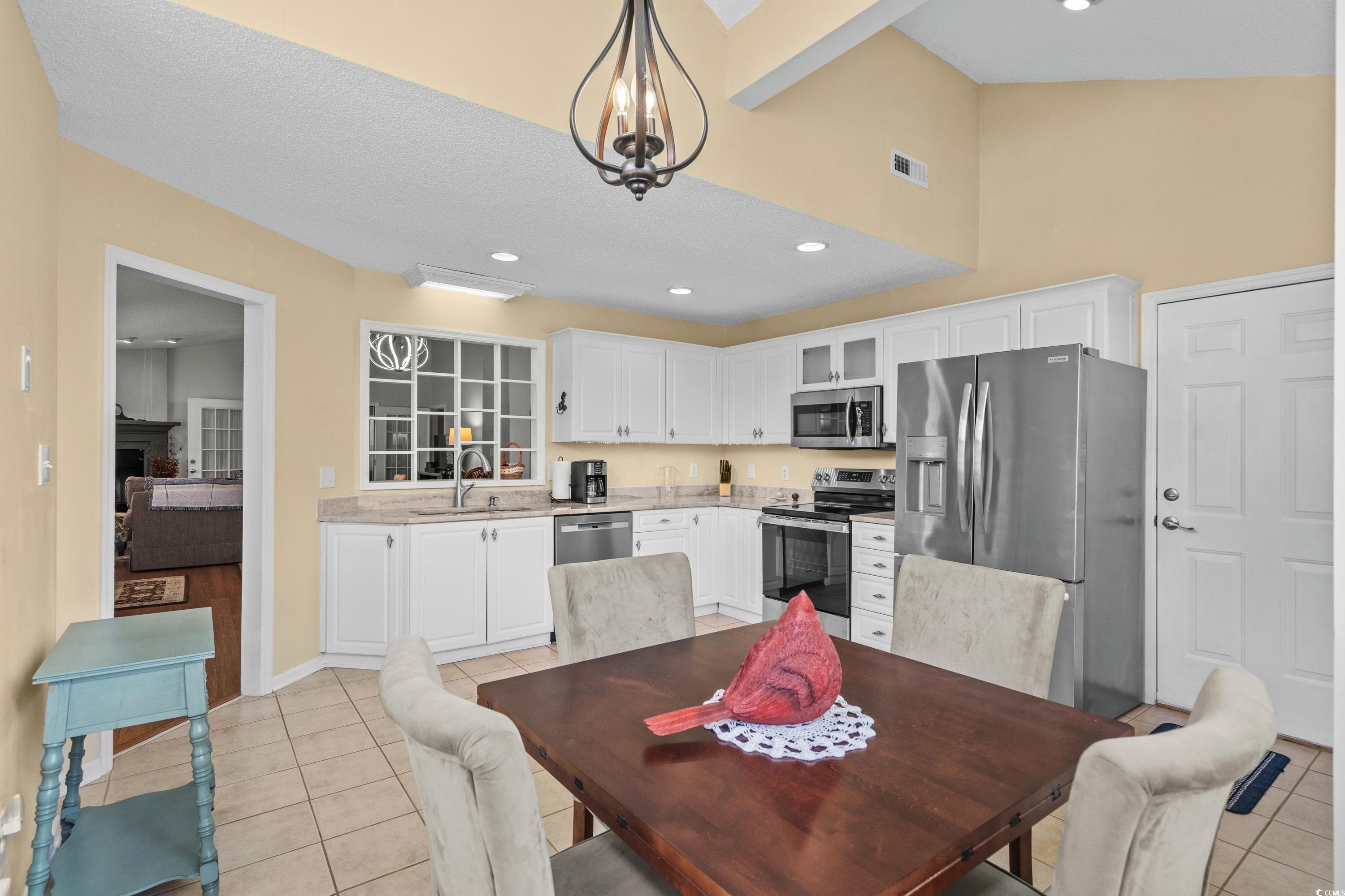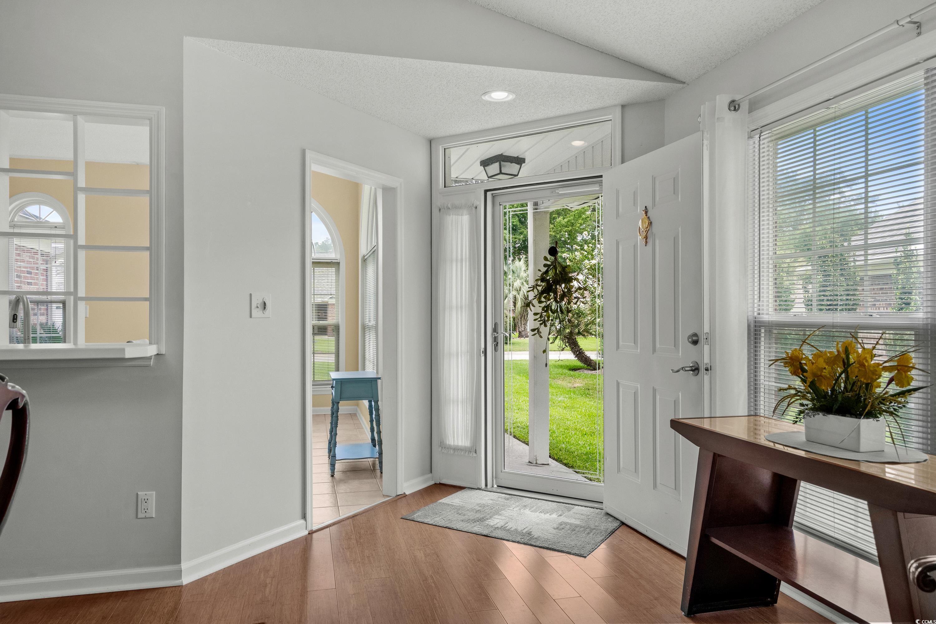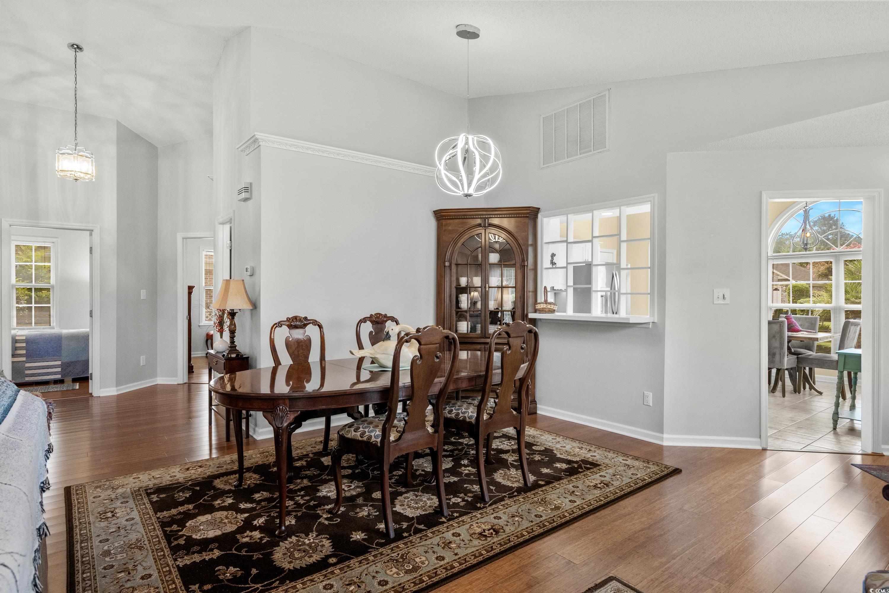 Welcome to this beautiful 3 bedroom, 2 bath all-brick home in the highly desirable Tilghman Forest section of Tilghman Estates in North Myrtle Beach. From the moment you arrive, youll notice the charm and quality this home offers, with the entire layout designed on one level for convenience and comfort. Step inside and youre greeted with soaring vaulted ceilings in every room and rich hardwood flooring that flows seamlessly throughout, with tile in the kitchen and baths. The remodeled kitchen is a true highlight of the home, featuring a brand new stove, nearly new stainless steel refrigerator, dishwasher, and microwave, plus decorative glass inserts in the cabinetry, under-cabinet lighting, and a cozy breakfast nook framed by two oversized palladium half-round windows that flood the space with natural light. The living room offers both warmth and character with a wood-burning fireplace complete with gas logs, making it the perfect spot for cozy evenings. The large master suite provides a quiet retreat with its vaulted ceiling, spacious layout, and private ensuite bath with double vanity and walk-in shower. Two additional bedrooms and a second full bath ensure plenty of space for family or guests. Off the great room, youll find a bright and versatile Carolina room that can easily serve as a second living area, home office, hobby space, or sun-filled retreat. Step outside and discover your very own backyard sanctuary, professionally designed by EliteLandscapers. This tranquil space features brick patio pavers, tropical plantings, landscape lighting, and a quiet, private setting that feels like your own hidden escape. Location doesnt get any better just a short golf cart ride takes you to some of the most pristine beaches in North Myrtle Beach, as well as to Main Street where youll enjoy dining, shopping, festivals, and live entertainment. Youll also have easy access to golf, boating, and everything the Grand Strand is famous for. As a resident of Tilghman Forest, youll enjoy community amenities including a pool and clubhouse. This is more than just a house its a lifestyle in one of the most desirable communities along the coast.