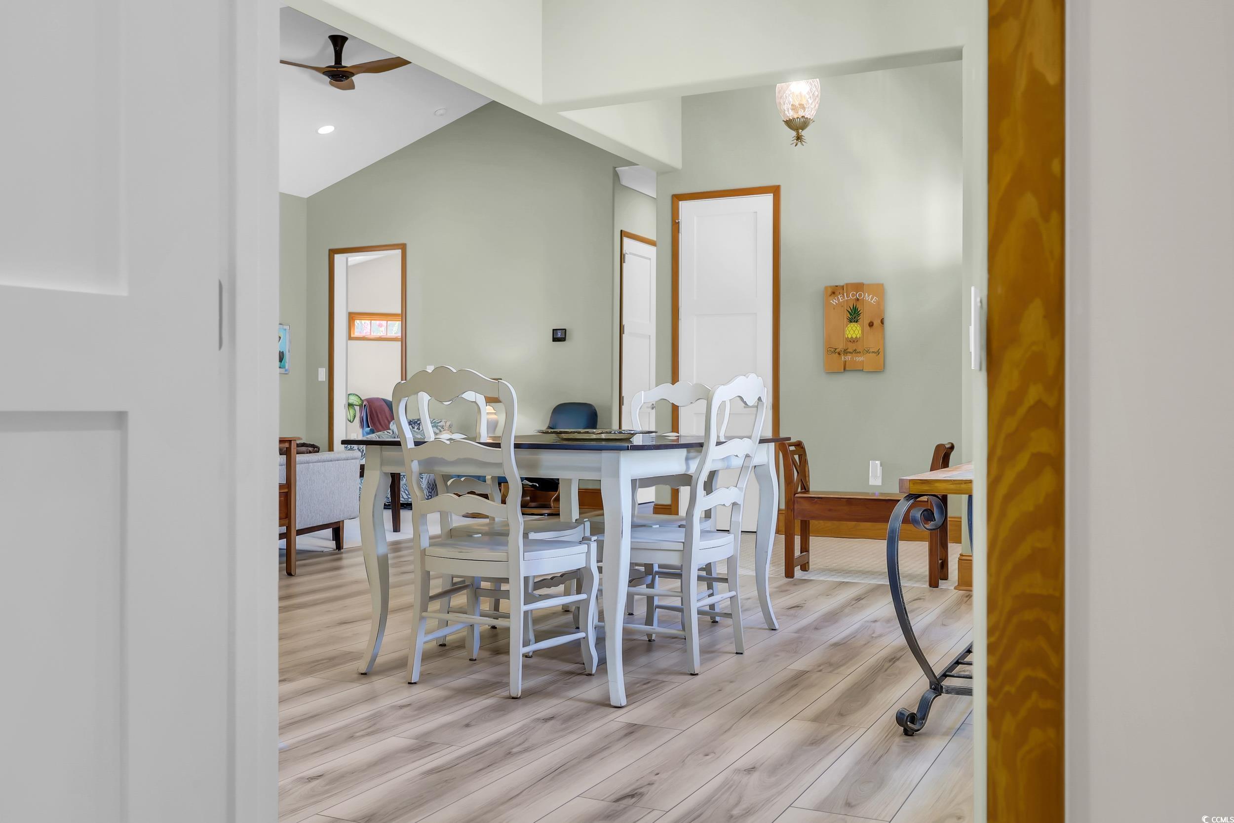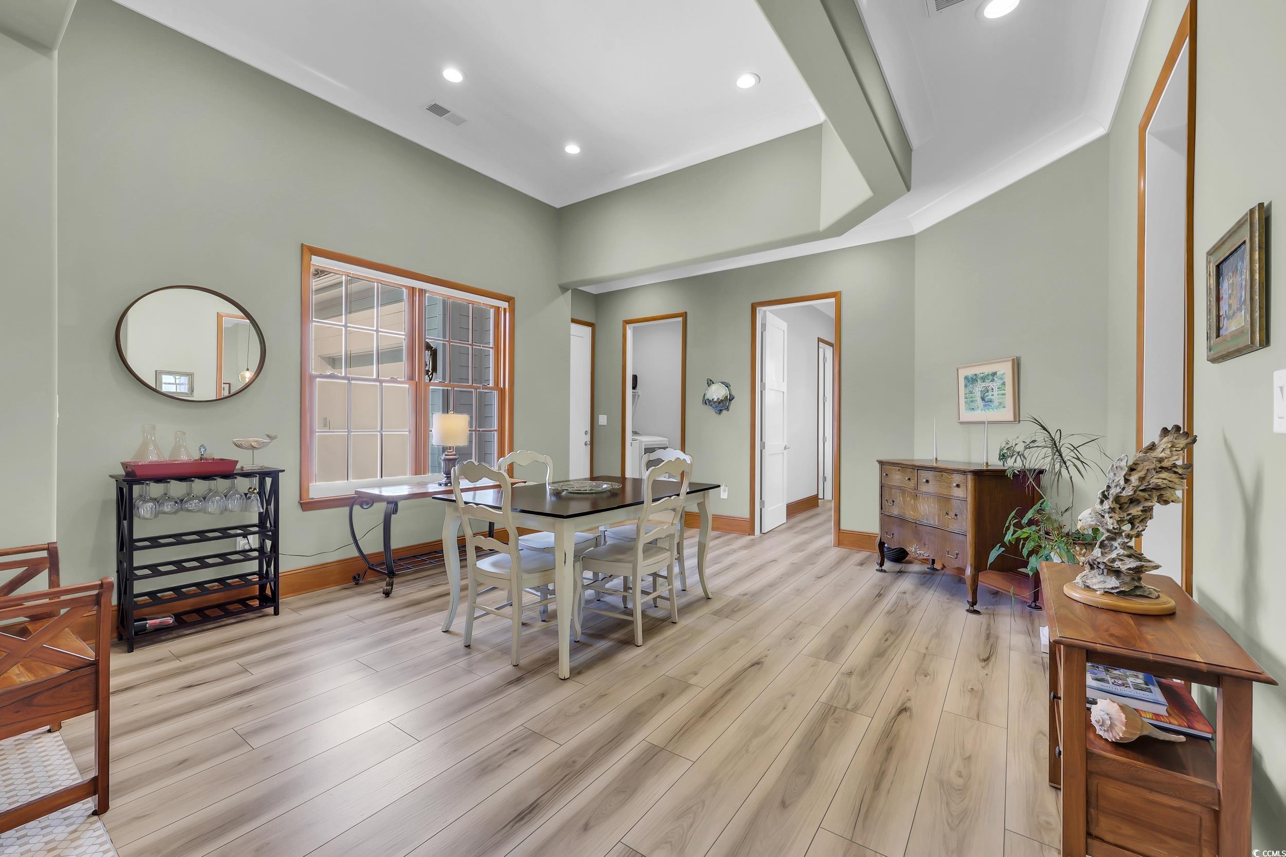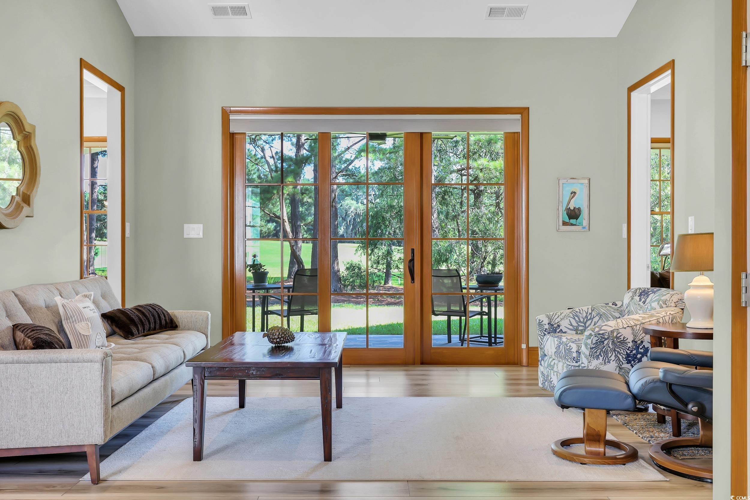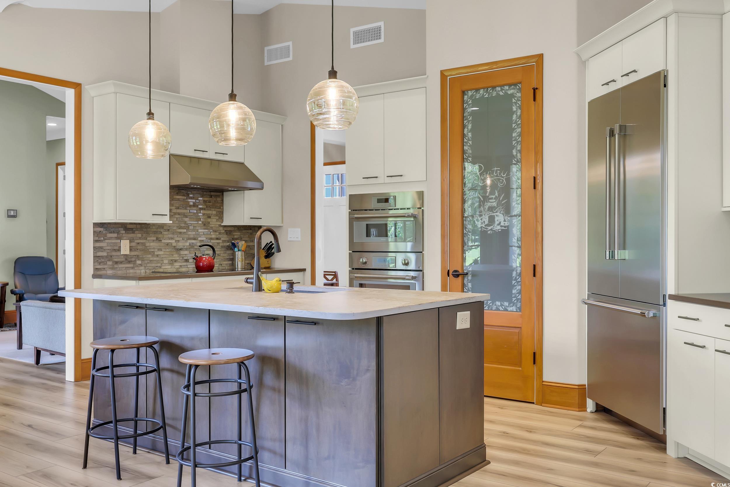 1575 Heritage Drive is a single-level custom home on the 5th fairway, just steps from the marina, built for living not just looking. Mid-century modern influences show in its crisp lines, open flow, and understated style, making it timeless and easy to live in. Inside, 12-foot ceilings, wide-plank floors, and oversized Sierra Pacific windows fill the home with natural light and frame golf-course views. The kitchen, breakfast nook, and keeping room flow seamlessly ideal for casual dining or relaxing by the modern fireplace. Thermador appliances, a leathered Caesarstone island, custom cabinetry, and a walk-in pantry keep everything organized. Some photos have been virtually staged. Dining and living rooms open from the entryway, creating an airy feel. The living room leads to the covered veranda, extending the home outdoors perfect for evening cocktails, weekend grilling, or a post-workout cool-down. The primary suite offers golf-course views, a soaking tub, dual vanities, and a large tiled shower. Two additional bedrooms (one en suite) and a glass-doored office provide flexible space for work, guests, or hobbies. The garage is a true luxury toy box. Three-car plus golf-cart bay with epoxy floors, insulated doors, and jackshaft openers offers room for cars, bikes, boards, a home gym, or workshop and can convert to conditioned living space if needed. Laundry is stylish and functional with Maytag appliances, utility sink, cabinetry, and a hand-laid tile backsplash. Low-maintenance landscaping, Rainbird irrigation, whole-house dehumidifier, generator, and CoreGuard Plus windows make upkeep effortless. Backed by a transferable 10-Year Quality Builders Warranty. Heritage Plantation delivers a gated, amenity-rich lifestyle marina, pool, tennis, pickleball, clubhouse, and championship golf just minutes from Pawleys Island beaches, dining, and boutiques. Perfect for buyers seeking a light-filled, mid-century inspired, easy-to-live-in home that works as hard as they do.