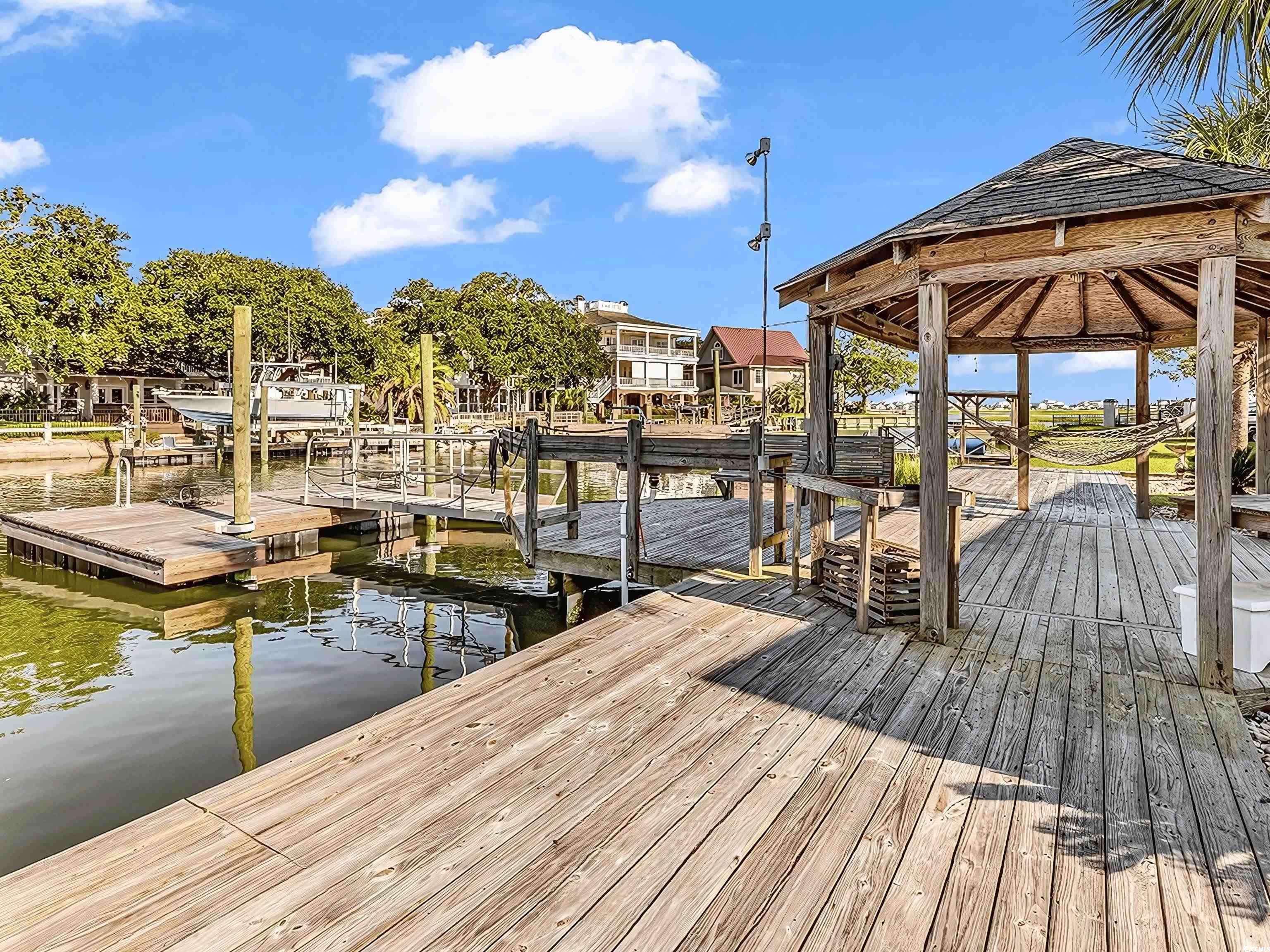 Escape to your own slice of waterfront paradise in beautiful Murrells Inlet! This stunning four-bedroom, four-bathroom home sits right on deep water with your very own private dock - perfect for those who love boating, fishing, or just watching the sunset with a cold drink in hand. Enter to discover a recently renovated downstairs featuring gorgeous luxury vinyl plank flooring that's both stylish and practical for coastal living. The heart of the home is the spacious open kitchen, complete with stainless steel appliances, white cabinetry, sleek quartz counter tops, and decorative tiled backsplash. Picture yourself hosting friends around the brick fireplace on cooler evenings, sharing stories and laughter. Outside, the fun really begins. Your very own covered stationary dock and private floating dock make boating and fishing adventures a breeze. New seawall installed in 2020. There's a detached storage shed for all your beach toys and gear, plus plenty of garage space for cars, boats or golf carts. The outdoor living areas are perfect for barbecues, morning coffee, or get togethers with family and friends. Best of all? No homeowners association means you can truly make this place your own. You're just minutes from the famous Murrells Inlet Marsh Walk, where fresh seafood and waterfront dining await. Crazy Sister Marina, local shops, grocery stores, and the public boat landing are all nearby, making daily life convenient while keeping that relaxed coastal vibe. This rare gem combines waterfront luxury with everyday comfort - a perfect retreat where every day feels like vacation.