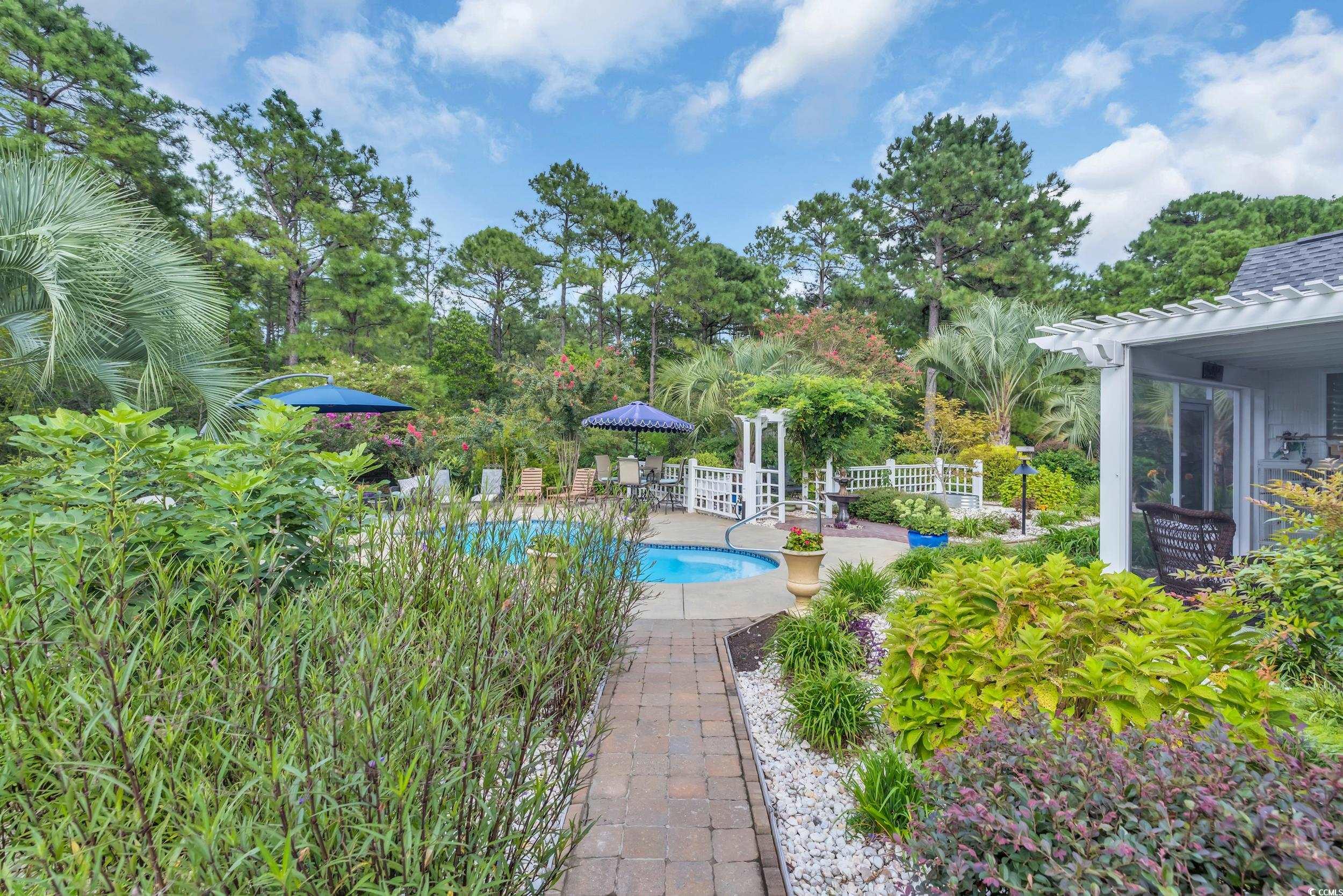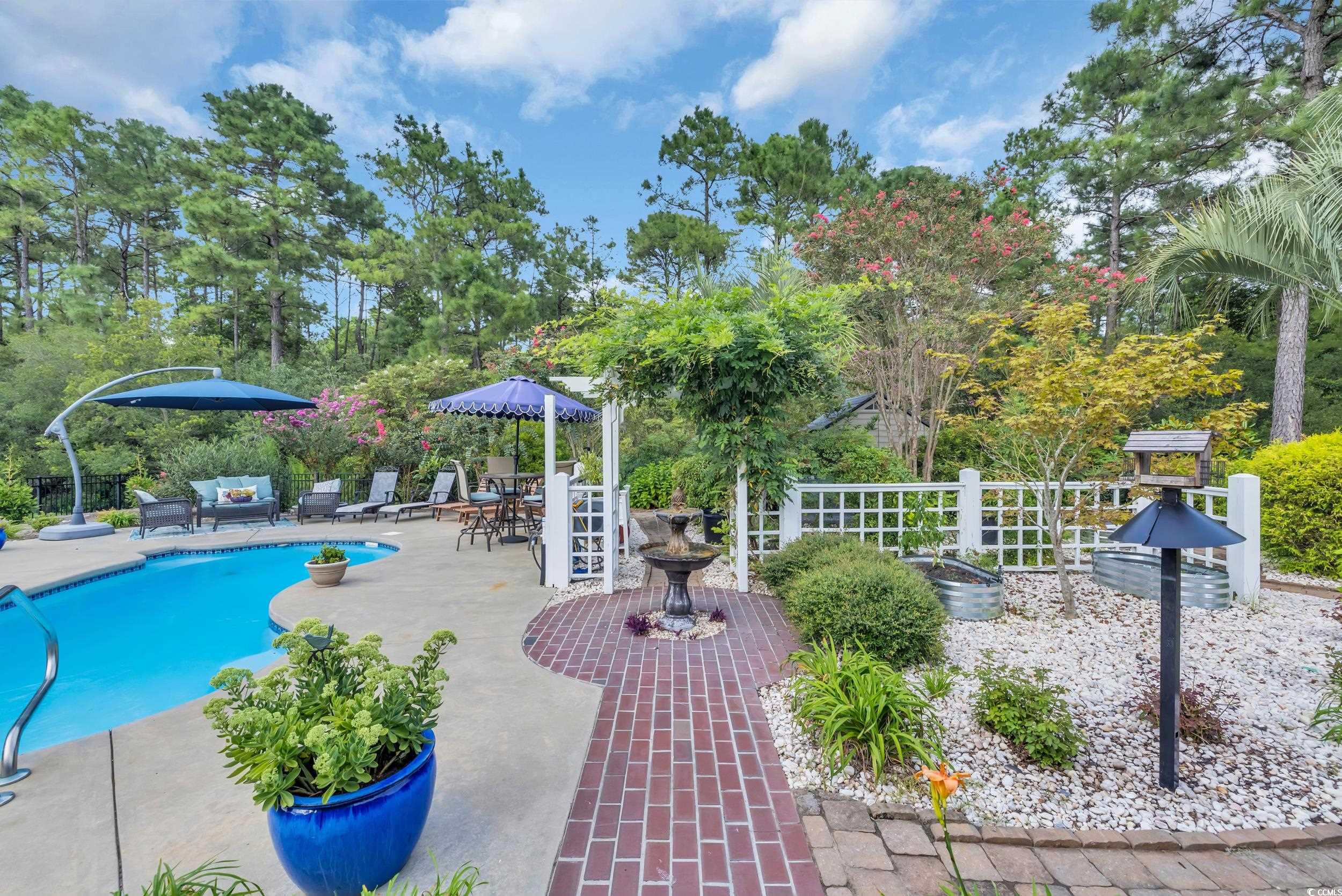 Back on the market- no fault to seller! INGROUND POOL & LUXURIOUS LANDSCAPING. This brick-front home features 4 bedrooms and 3 baths, surrounded by lush gardens and timeless charm. Thoughtful upgrades are evident throughout, blending elegance with comfort. From the moment you arrive, the extended driveway, enchanting greenery climbing up the brick facade along with the landscaped grounds create the feeling of stepping into the pages of ""Better Homes & Gardens."" Inside, youll find it to be carpet-free with tray and vaulted ceilings, wainscoting, plantation shutters throughout, and an updated kitchen with granite countertops and marble backsplash. The spacious master suite features a beautifully renovated bathroom with a walk-in shower, his/her separate sinks and your washer & dryer. The two additional bedrooms and bathroom include a pocket door for added privacy and a suite-like feeling. A cozy living room with fireplace (propane hookup) opens to a custom addition family room with built in bookshelves creating the perfect TV or gathering space. Upstairs, the large bonus room, used as a bedroom, has its own full bath and a Mr. Cool, mini-split A/C unit for year-round personal comfort. Access the backyard from either the primary bedroom or the screened-in lanai off the family room. Outdoors, the property is nothing short of breathtaking. A sparkling pool is framed by lush gardens, an iron gated fence, and mature landscaping. Relax in the screened-in patio or enjoy the privacy of your beautifully landscaped backyard, complete with a storage shed, irrigation system, and even some patio furniture that conveys. New exterior lights and ceiling fans throughout add to the many thoughtful details. In the gardens youll be greeted by emerald zoysia grass, azaleas galore, hydrangeas, a fig tree, Mexican petunias, butterfly bushes, crepe myrtles, Japanese maple, palm trees, daylilies, roses, cactus, loquat, a charming trellis draped with wisteria plus more. Located in Waterford Plantation, this home offers almost 2400 heated sq. ft. If youve been searching for a home that blends elegance, character, and natural beauty, this one-of-a-kind property is the epitome of refined living. This community offers true resort-style living with an outdoor pool, clubhouse, fitness center, basketball courts, tennis courts, and walking sidewalksplus community events for all ages. HVAC (2020), Roof (2021), Water Heater (2021), and a 6-zone irrigation system. Community Amenities: Pool, tennis courts, basketball courts, walking trails, and more. Conveniently located near top-rated Carolina Forest schools, shopping, dining, golf, hospitals, Myrtle Beach International Airport, and the world-famous beaches of the Grand Strand. All measurements and square footage are approximate and not guaranteed. Buyers are responsible for verification of all information, including HOA info.