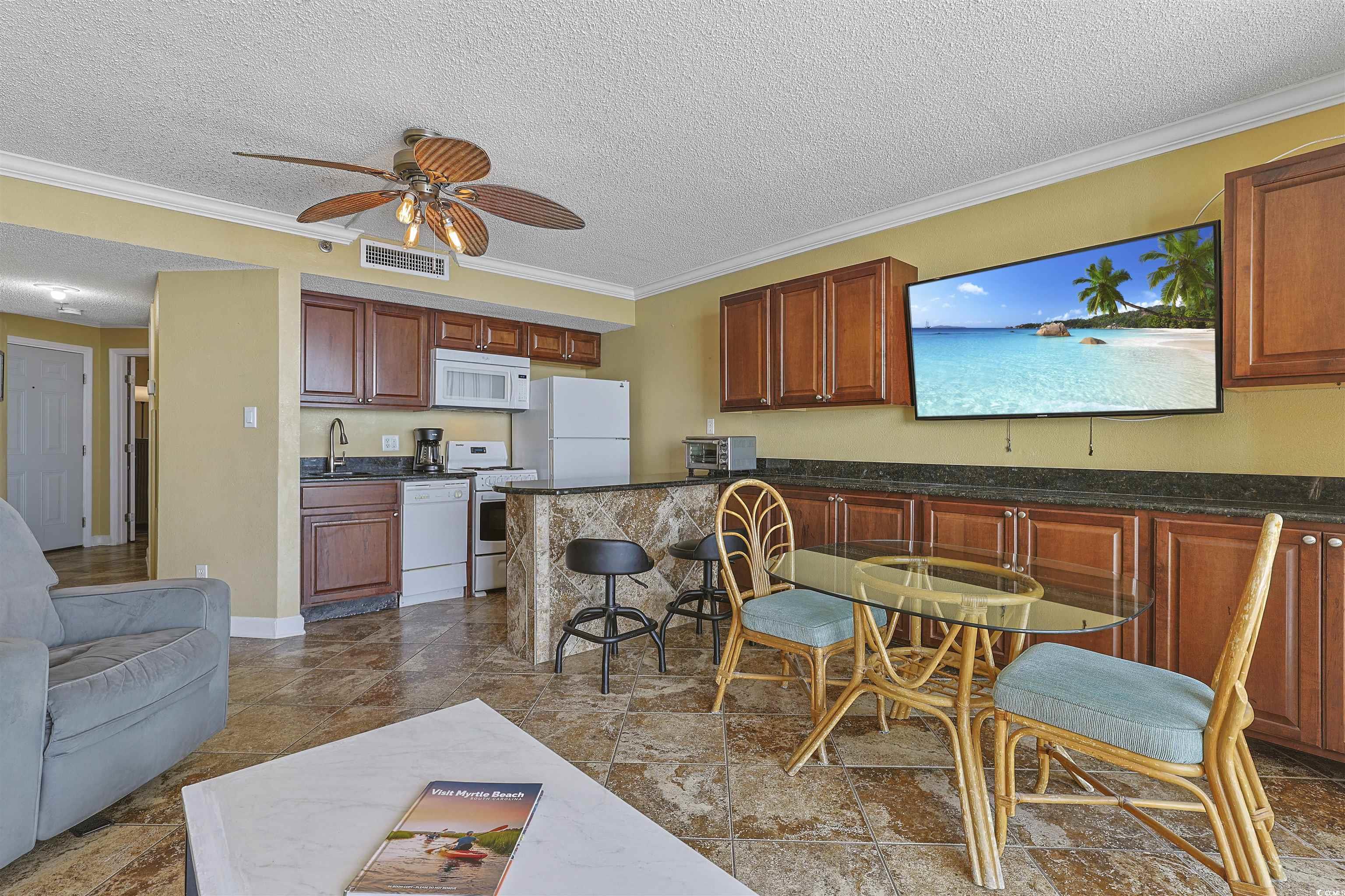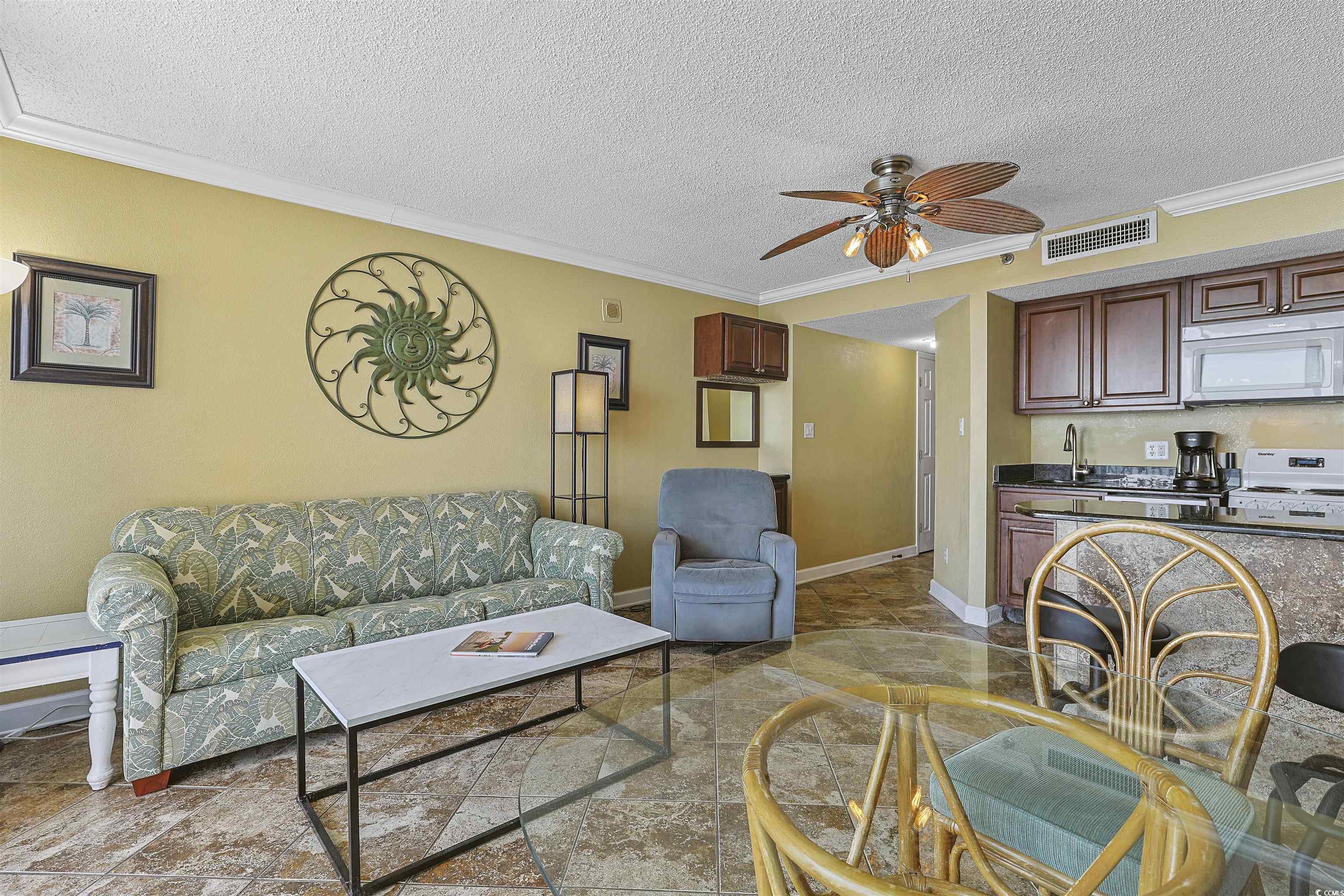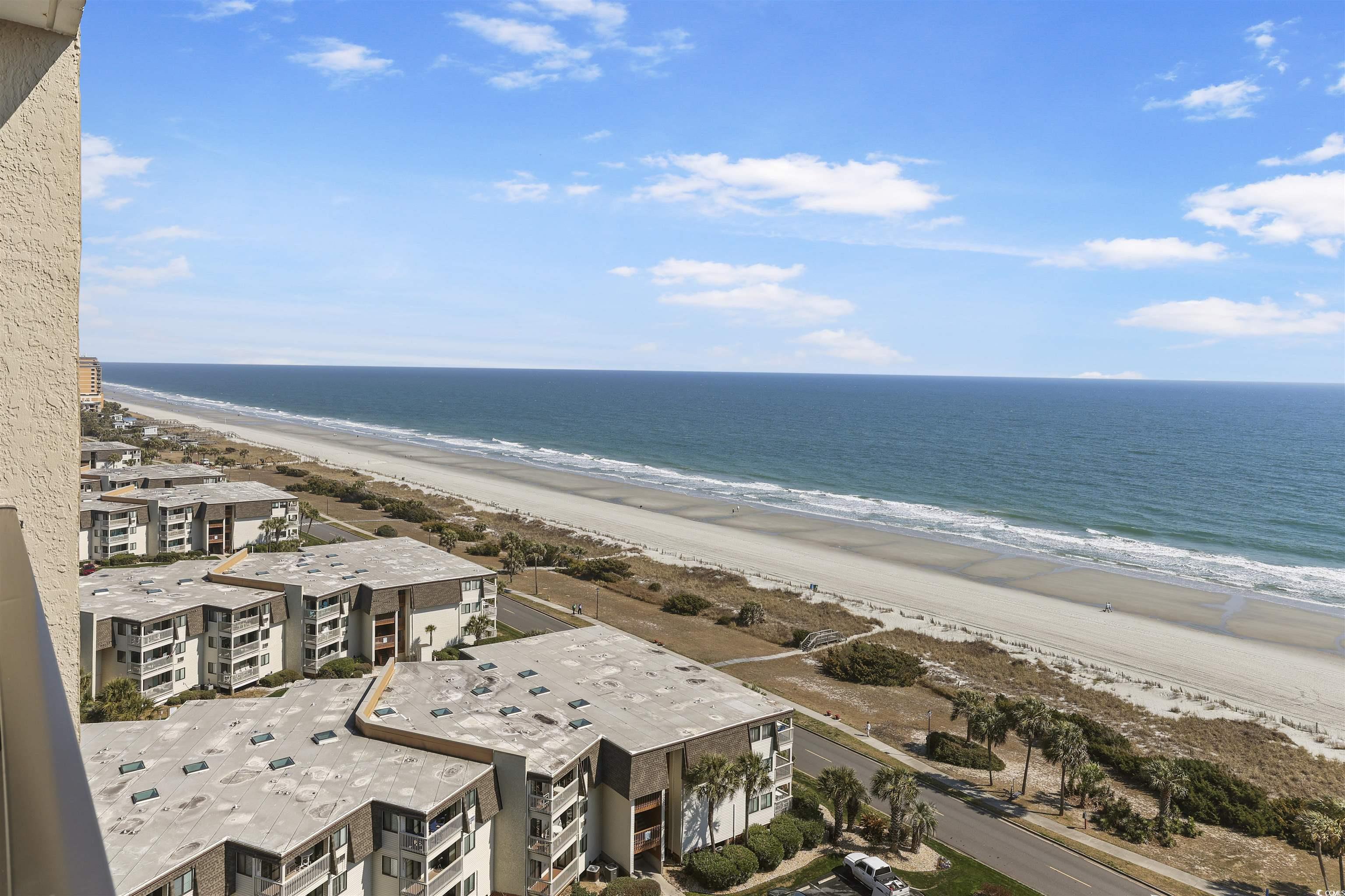 Introducing this spectacular 15th floor 1 bedroom 1 bath ocean front end unit condo located in the Ocean Forest Plaza complex. The WOW factor hits you as soon as you walk into the living room with a majestic view of the Atlantic Ocean. This piece of paradise comes tastefully furnished, along with tile flooring, crown moulding, classic living/dining room combo that showcases a sliding glass door that opens up to the balcony overlooking the white sandy beach. The fully equipped kitchen features a white on white appliance package, granite counter tops, and comes complete with an abundance of cabinet spaces. The cozy bedroom offers a mirror sliding door closet, a single sink vanity, and a private access entryway to the full bath. The bath includes a vanity with a single sink, a comfort station along with a timeless tub/shower combo. The Ocean Forest Plaza has wonderful amenities which include a sparkling outdoor pool, indoor pool, and hot tubs. This condo affords you easy access to the beach and golfing along with all of the other activities and happenings in Myrtle Beach including fun eateries, award winning off-Broadway shows, public fishing piers, and intriguing shopping adventures along the Grand Strand. Conveniently located to your everyday needs, including grocery stores, banks, post offices, medical centers, doctors offices, and pharmacies. Check out our state of the art 3-D Virtual Tour.