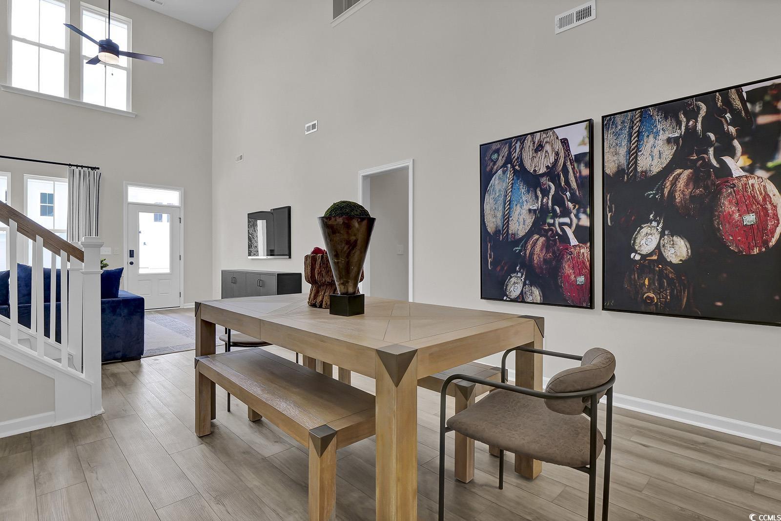 Welcome to the Hyacinth! This carefully crafted interior unit features three bedrooms, two-and-one-half baths, and a spacious loft. From the moment you step inside, the great roomwith its soaring two-story ceilingmakes an immediate and striking impression. Expansive windows across both levels fill the space with natural light, while luxury vinyl plank flooring, a wood staircase with decorative railing, and high-end finishes create a refined and pristine aesthetic. The kitchen is designed to impress with white soft-close cabinetry, quartz countertops, a tile backsplash, and a GE stainless steel electric appliance package. Just beyond, the primary bedroom includes a tray ceiling and ceiling fan. The en-suite bath showcases dual sinks with quartz countertops, a tiled shower with a glass enclosure, and a walk-in closet. Step outside to a covered porch overlooking a private tree linethe perfect spot to enjoy your morning coffee. Upstairs, youll find two additional bedrooms, a full bath, and a loft that overlooks the impressive two-story great room. A generous unfinished storage room provides space to keep seasonal items organized. A convenient laundry room and half bath at the garage entry complete this beautiful home. Live a laid-back lifestyle and enjoy all that Murrells Inlet has to offer, just minutes from this boutique new community, Bally Castle! Home is to-be-built. Homesite photo shows the designated lot that the townhome will be constructed. Additional photos are of a completed home for reference ONLY.
