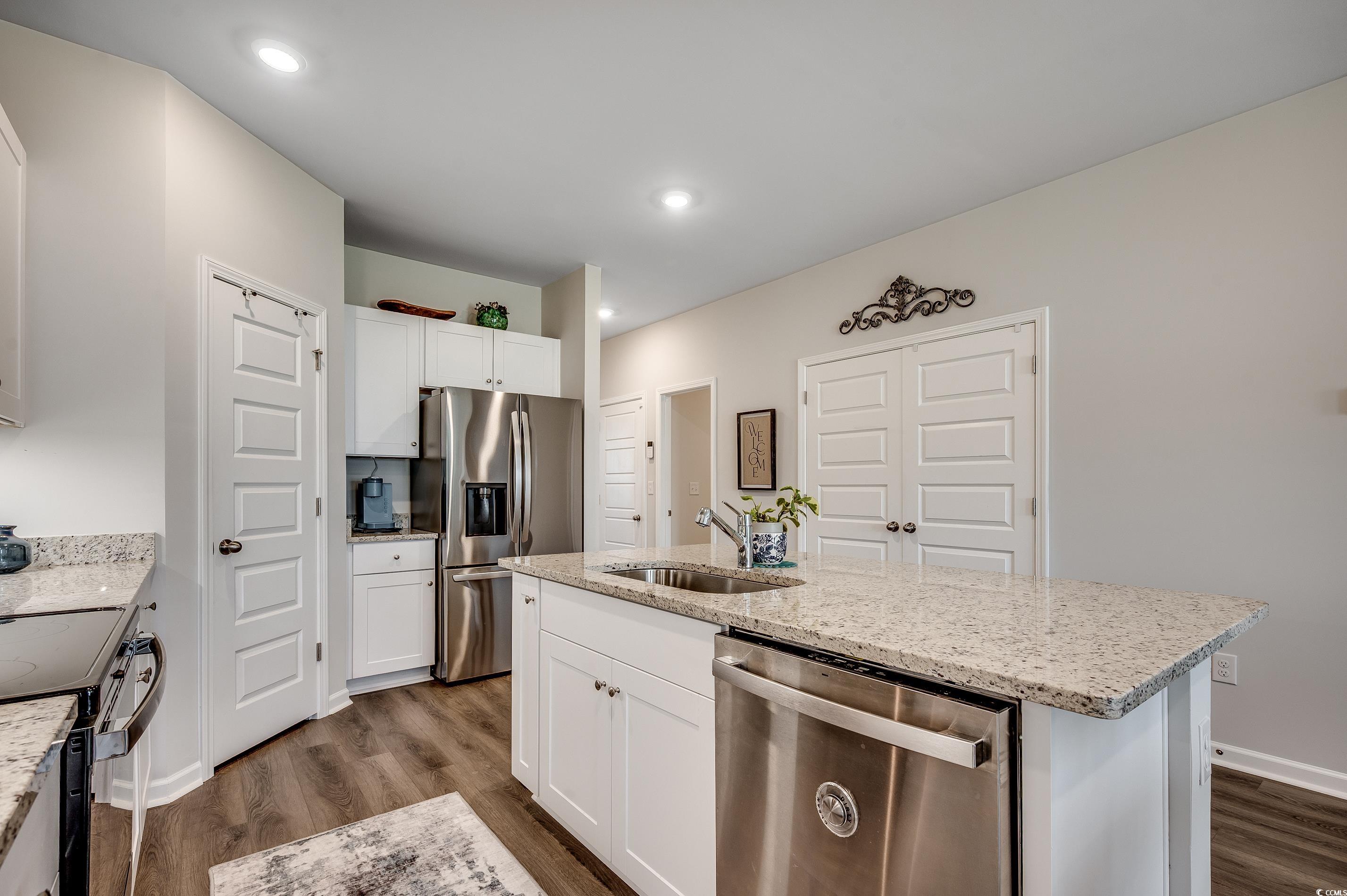 Lovely community of Cooper's Bluff offers this 3-bedroom and 3 full bath townhome with a garage. It's nicely laid out with a downstairs primary suite with a low-rise walk-in shower, an added shower slider, and a large closet. Another bedroom downstairs works great as a TV room or a nice home office. There's a 3rd bedroom suite upstairs, which also has a large storage room. Luxury vinyl wood-style floors dress the downstairs, and bedrooms are carpeted. There's a roomy backyard area with a privacy fence between units, and there is the option to fully fence the back area space. A nice-sized patio is on the back of the home as well. Low HOAs offer lawn care, a community pool, a community garden, and a playground area. This location is convenient to area schools, dining, shopping, and close to the Airport and hospitals. Hwy 544, 707, and 31 are very close in proximity to Cooper's Bluff