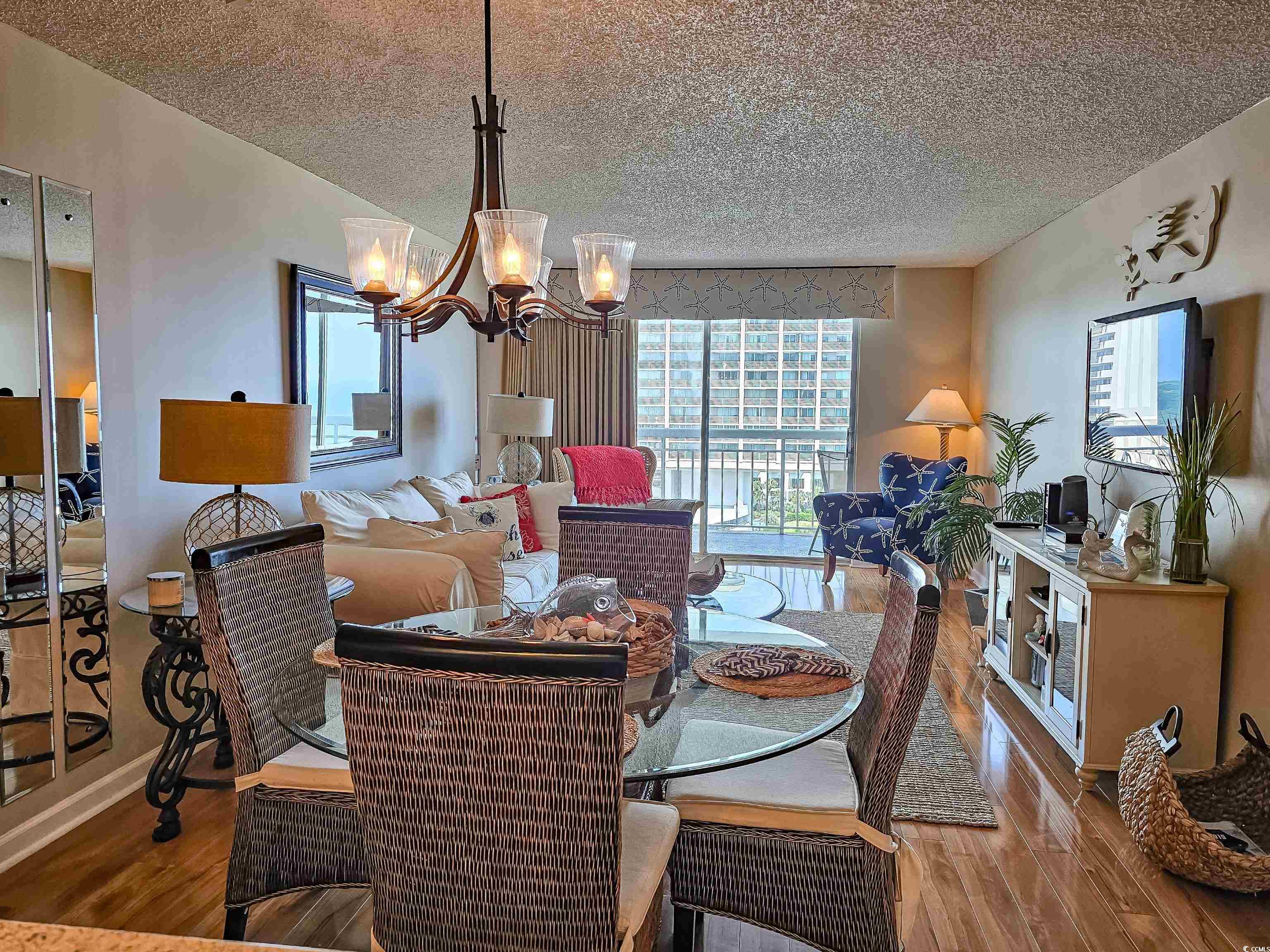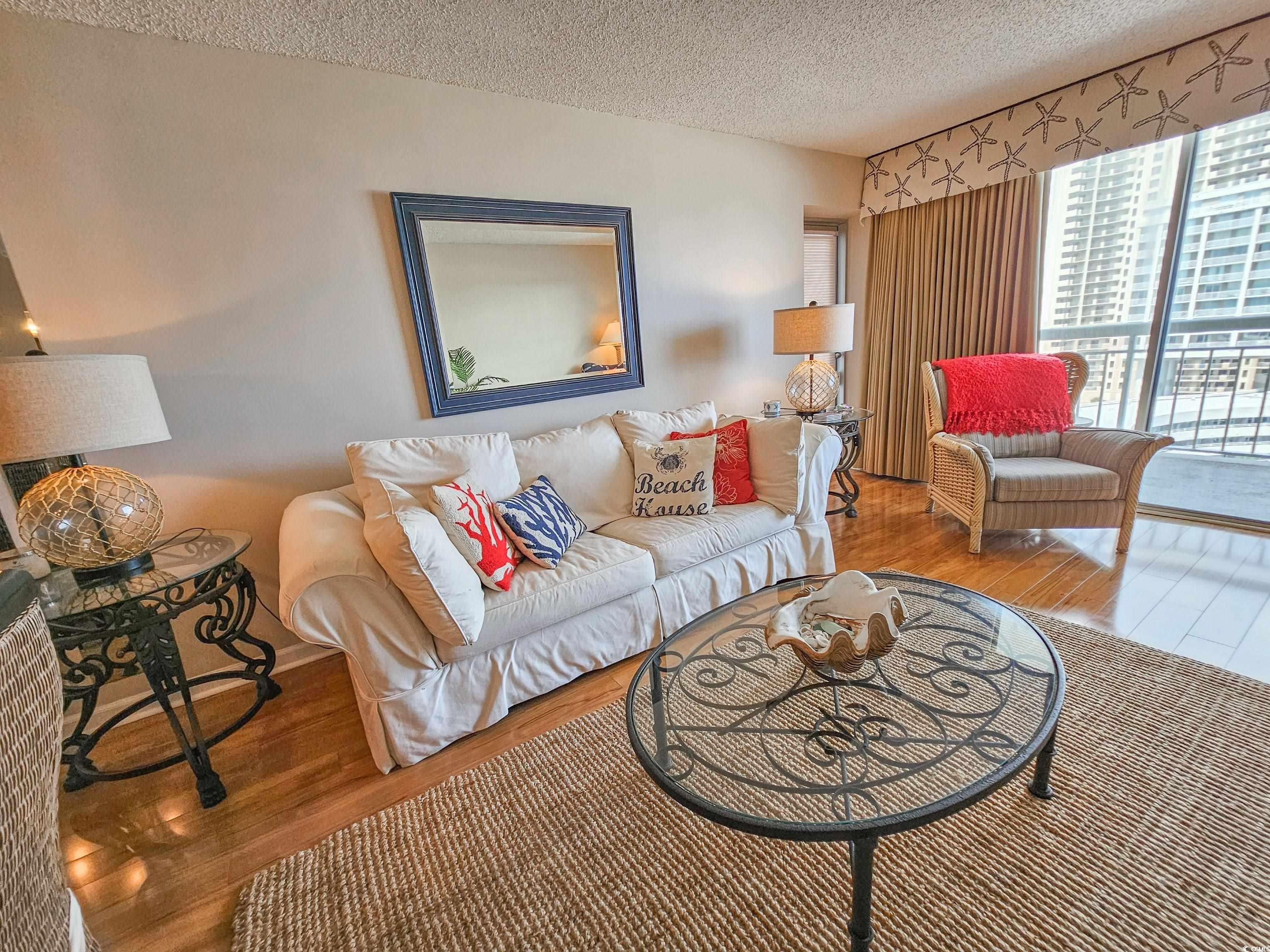Indulge in unparalleled views from this charming two-bedroom, two-bath residence. The kitchen has been remodeled with custom cabinets, track lighting, solid surface counter tops, beautiful LVP flooring, and tile in both baths. Large primary suite with sitting area. Sold fully furnished. You will have endless ocean views from one of the three balconies! Perfect for primary residence, second home, or rental options. Newly remodeled lobby in this oceanfront tower. The Kingston Resort has a Spa & Fitness center (additional cost) with pickle ball, tennis courts, indoor pool, golf simulator, putting green, restaurants, a gated community with 24-hour security, multiple swimming pools, a 12-acre fresh water lake and the list goes on! Some resort amenities are only available through the Hilton on-site rental program.