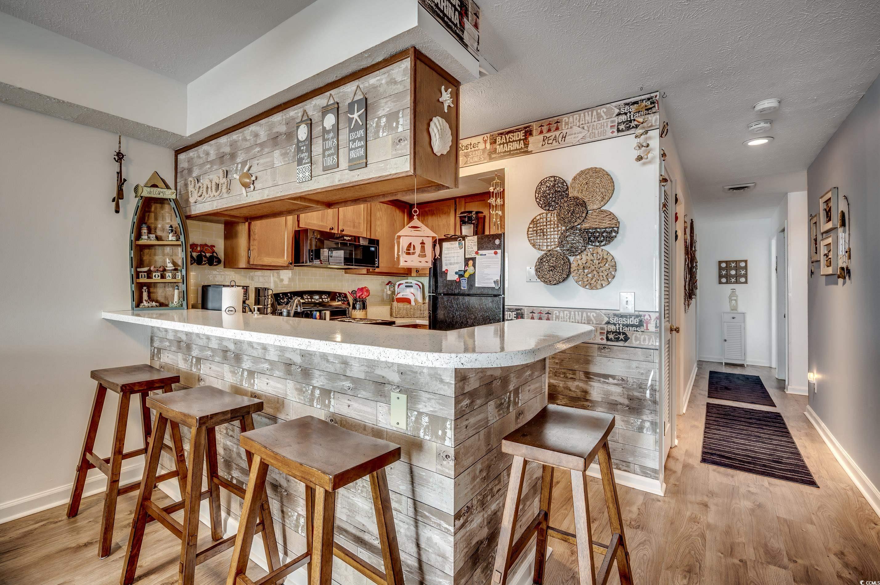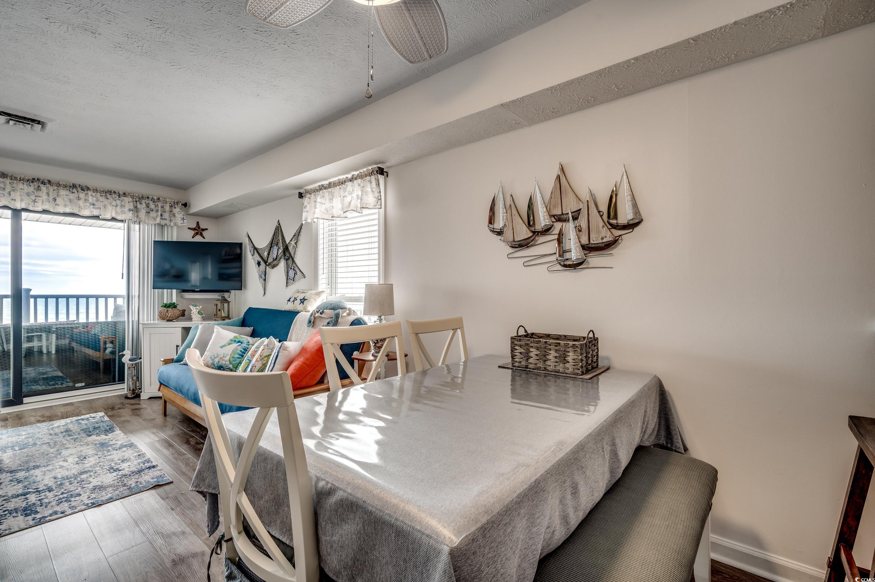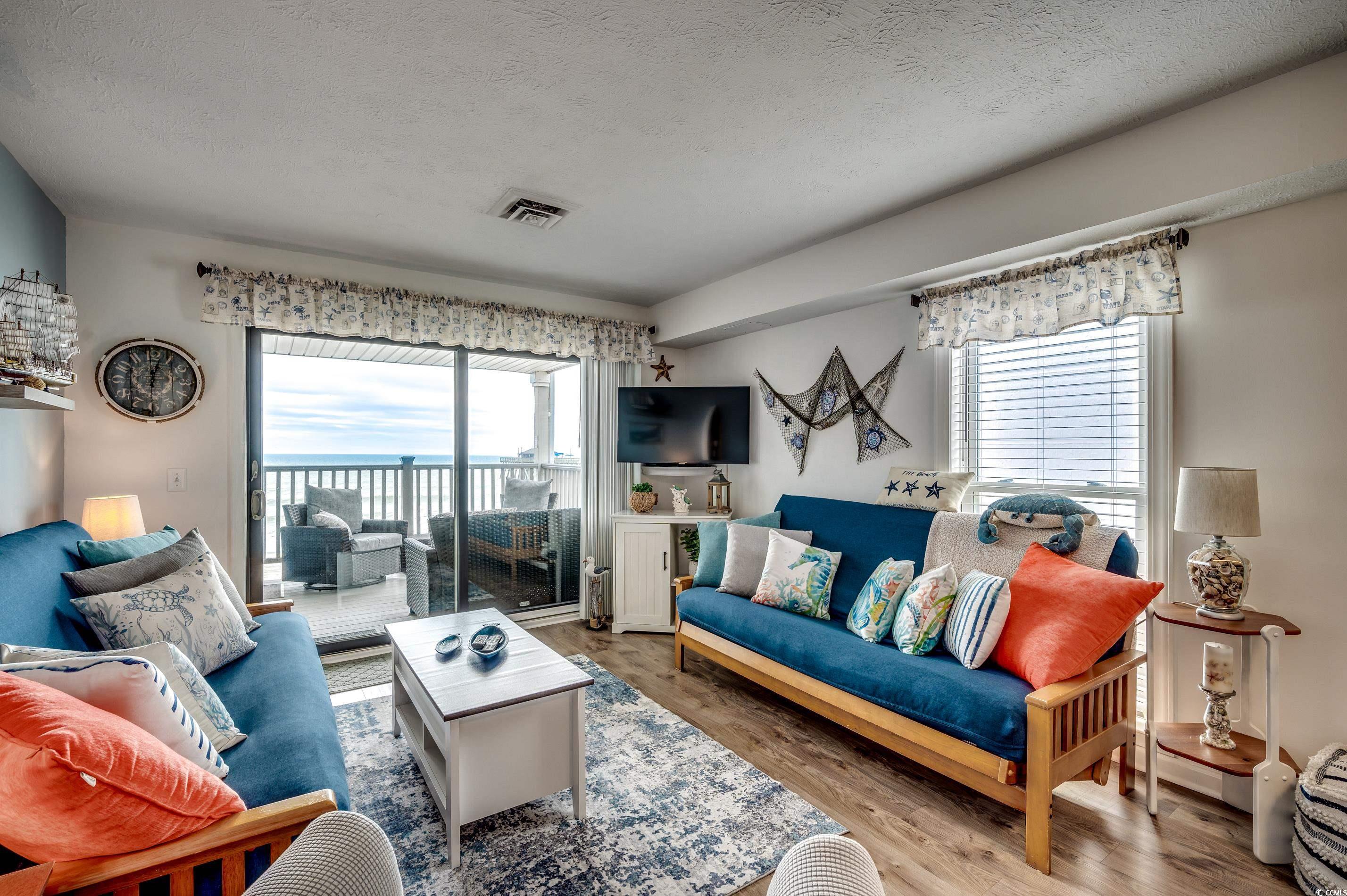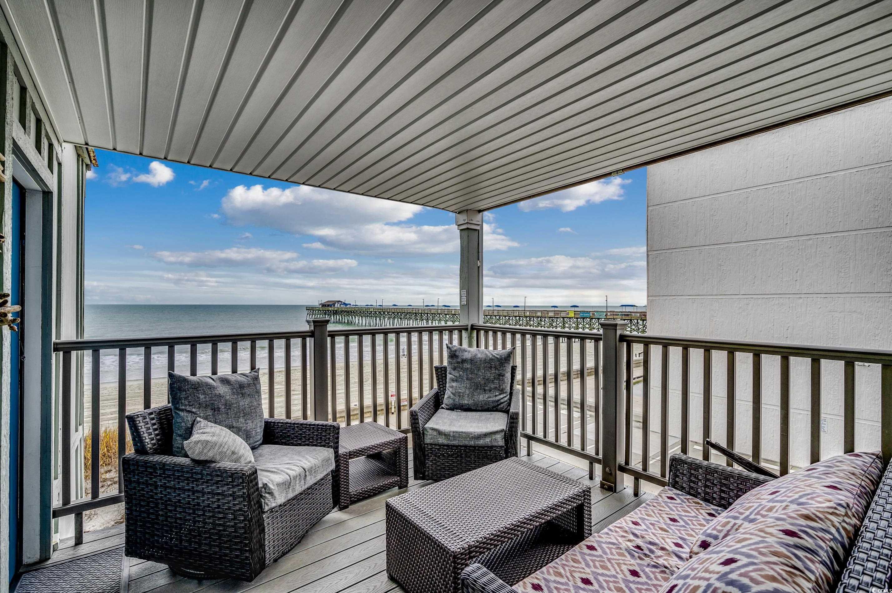 Experience coastal living in this end-unit oceanfront condo at 203 SandDollar. Located just north of the Garden City Pier, this fully furnished 2-bedroom, 2-bath retreat offers direct beach access, breathtaking views, and a perfect mix of comfort and convenience. Inside, the bright open floor plan features luxury vinyl plank flooring throughout. The kitchen has been refreshed with painted white cabinets, solid-surface countertops, a breakfast bar, and updated appliancesideal for casual dining or entertaining. The primary suite includes a ceiling fan and ensuite bath with a tub/shower combo, while the guest bedroom has easy access to a refreshed hall bath. Step out onto your private oceanfront balcony and take in stunning sunrise views of the pier and shoreline. Additional features include a foyer entry, in-unit washer/dryer, and private ground-level storage for all your beach gear. Community amenities include oceanfront pool access through the Kingfisher Inn, plus a spacious sundeck with picnic tables, loungers, and an outdoor shower for convenient beach cleanup. HOA dues cover water, sewer, trash, cable, internet, pest control, landscaping, common area maintenance, and pool service. Each unit has one designated parking space, plus seven shared spaces. The nine-unit complex is both golf cart and motorcycle friendly. Short- and long-term rentals are allowed, providing strong rental potential. This prime location is just steps from the Garden City Piers fishing, dining, arcade, and live music, and minutes to Murrells Inlets MarshWalk and Myrtle Beach attractions, golf, shopping, and the airport. Whether youre searching for a vacation home, rental investment, or full-time oceanfront escape, 203 SandDollar delivers. Explore the 3D Virtual Tour here: www.bit.ly/203SandDollar.