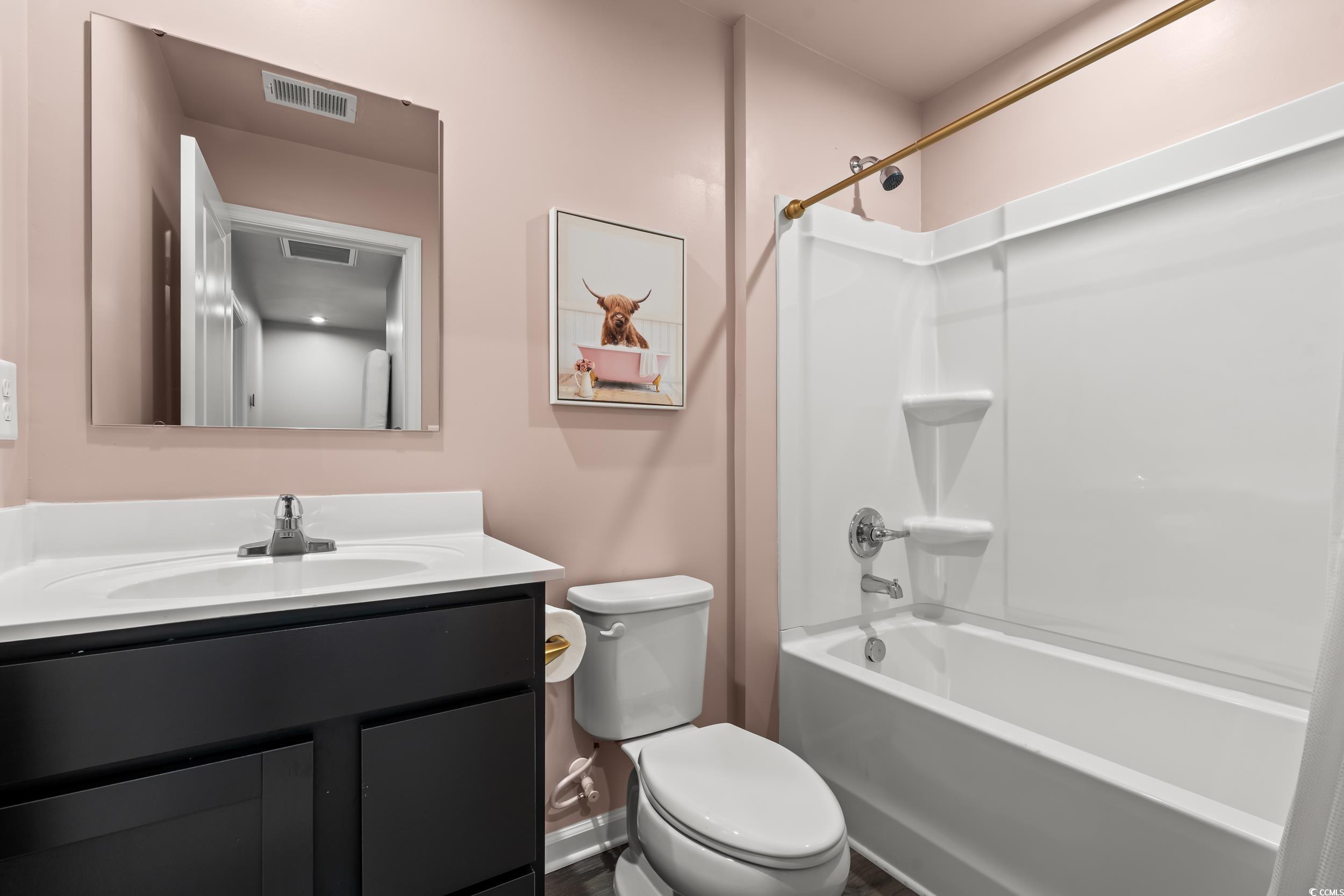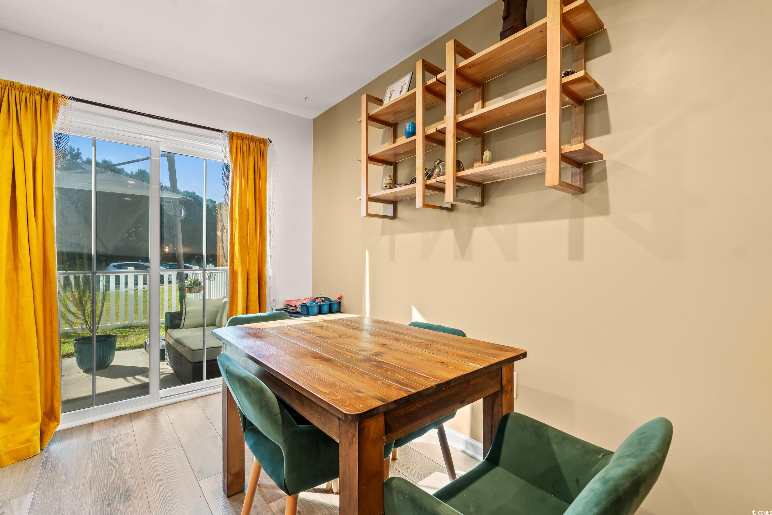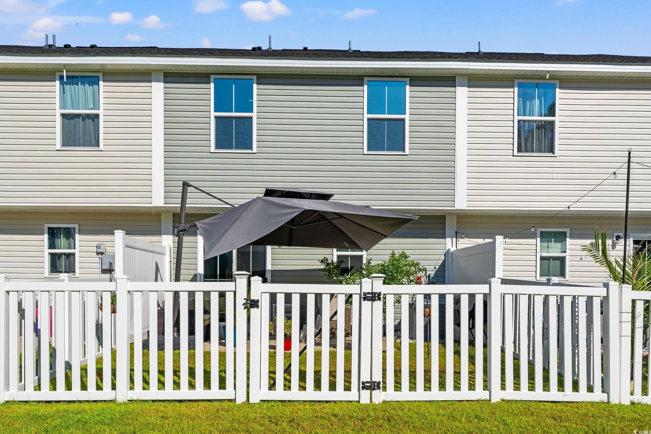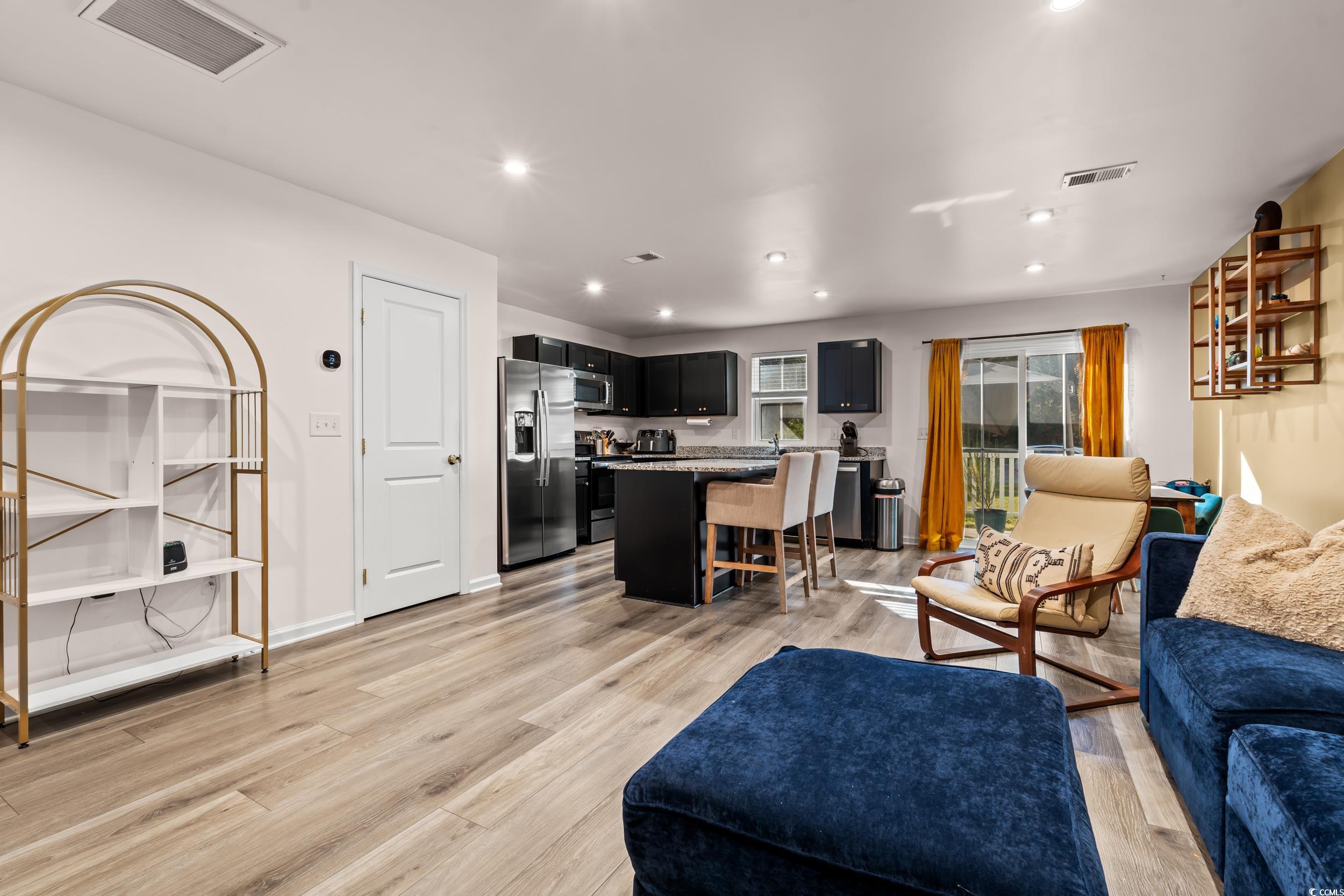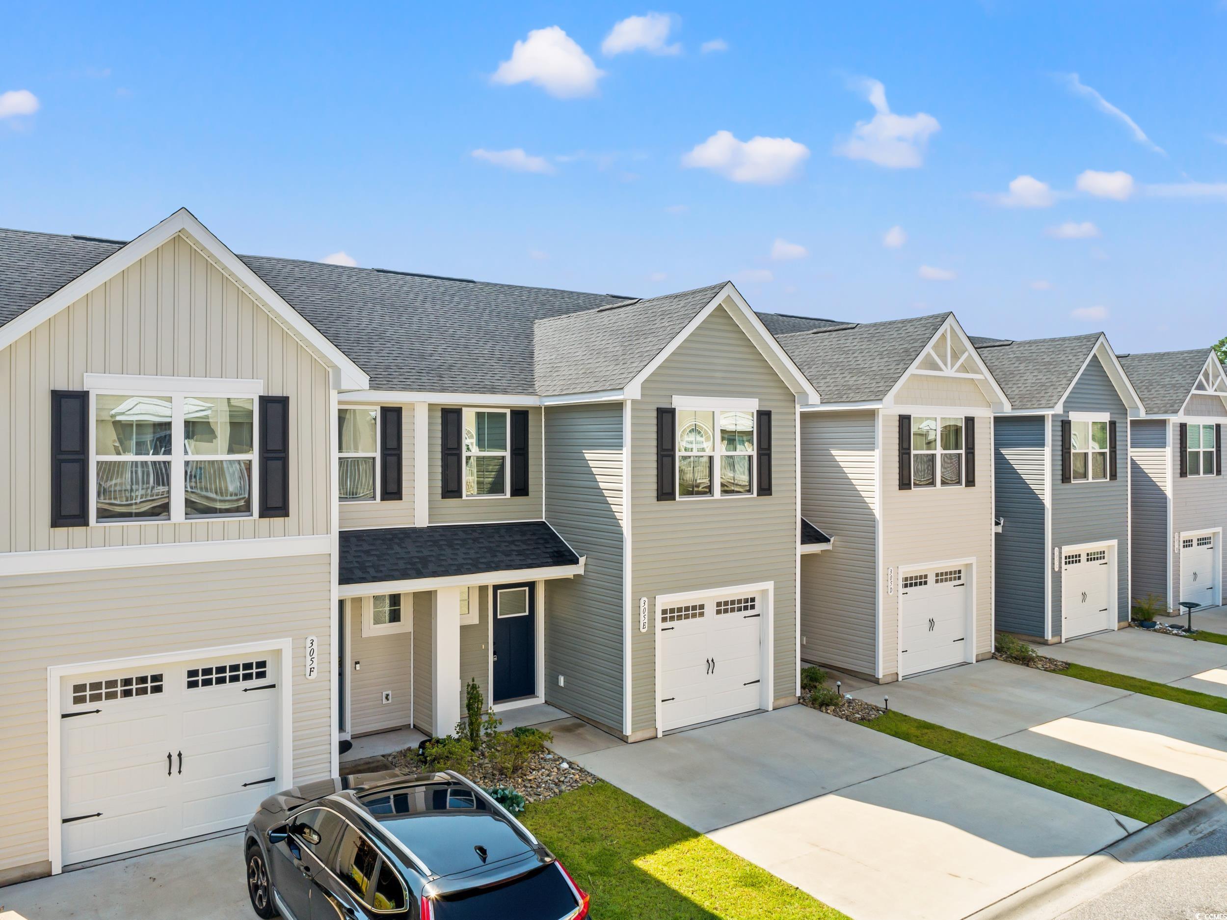 Welcome to this nearly new 3-bed, 2.5-bath townhome in Forestbrook Townhomes (2023 build) - a modern, low-maintenance home built for comfort and convenience. Located a short drive to Myrtle Beach, all of The Grand Strand's beaches, shopping, dining, golf, and major routes (Hwy 501 & Hwy 31). It's just over 1,400hsf of well-laid out design. The main level showcases an open-concept layout with luxury vinyl plank flooring, a bright foyer, and a spacious living/dining area ideal for everyday living and entertaining. The kitchen impresses with granite countertops, sleek black cabinetry with brushed-gold hardware, stainless steel appliances, and a center island with seating and easy access to the patio; the perfect space for a casual meal or hosting. A convenient powder room completes the first floor. Upstairs, the primary suite features a walk-in closet with custom built-ins including a desk area and window, plus a private bath with tub/shower, extended vanity, and linen storage. Two additional bedrooms (one with custom closet built-ins) share a full bath. The laundry room is upstairs for easy living; washer & dryer convey. Windows of the home are equipped with professionally installed window film enhancing privacy while also providing added protection during storms, a thoughtful upgrade for both comfort and peace of mind. Out back, a rare fenced yard with patio offers room to relax or grill; patio furniture & umbrella convey. Parking for three with a private 1-car garage + large driveway. Community perks include a dog park, playground, lawn care, and exterior maintenance & insurance covered by the HOA so you can spend more time enjoying the coastal lifestyle. Some photos have been virtually staged/edited. Well-priced home for this neighborhood and a motivated Seller. Schedule a tour today!