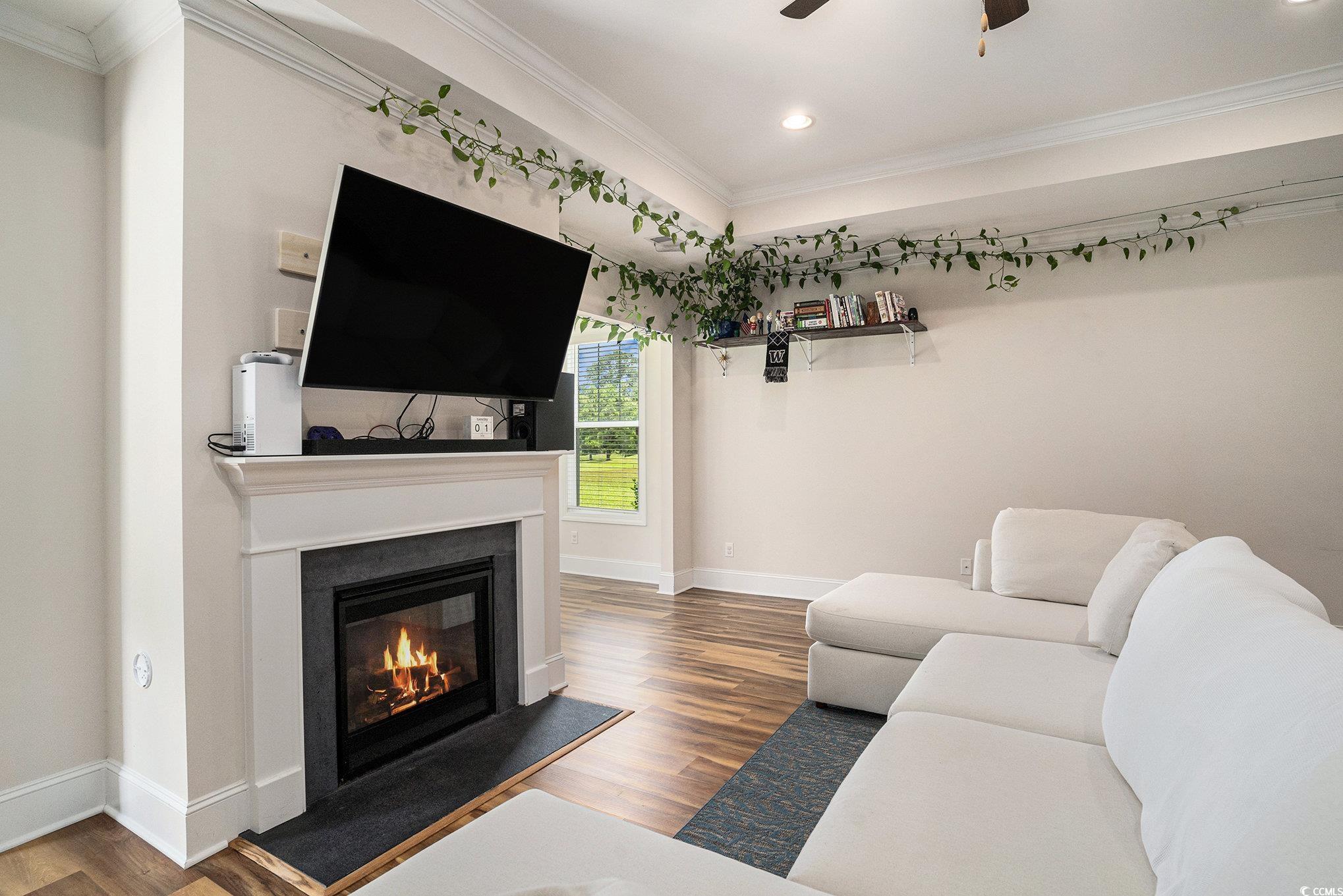 Stunning executive ranch-style home located on the Wild Wing golf course, situated on a quiet cul-de-sac lot. This home boasts 9 ft ceilings throughout, with elegant trey ceiling features in the dining room and primary bedroom. A highlight is the Carolina room, which has doors that open to a patio, perfect for enjoying the golf course views. The property also includes Green Smart Energy & Automation features, a tankless water heater, and Energy Star Stainless Appliances with a gas range. Additional refined interior touches include crown molding, glass French doors leading to a study, walk-in tiled shower, generous closet space and laundry with extra storage. Gas log fireplace with slate surround. Exterior features include fiber cement siding with stone accents, an oversized side-entry 2-car garage, and 30-year Architectural Shingles.