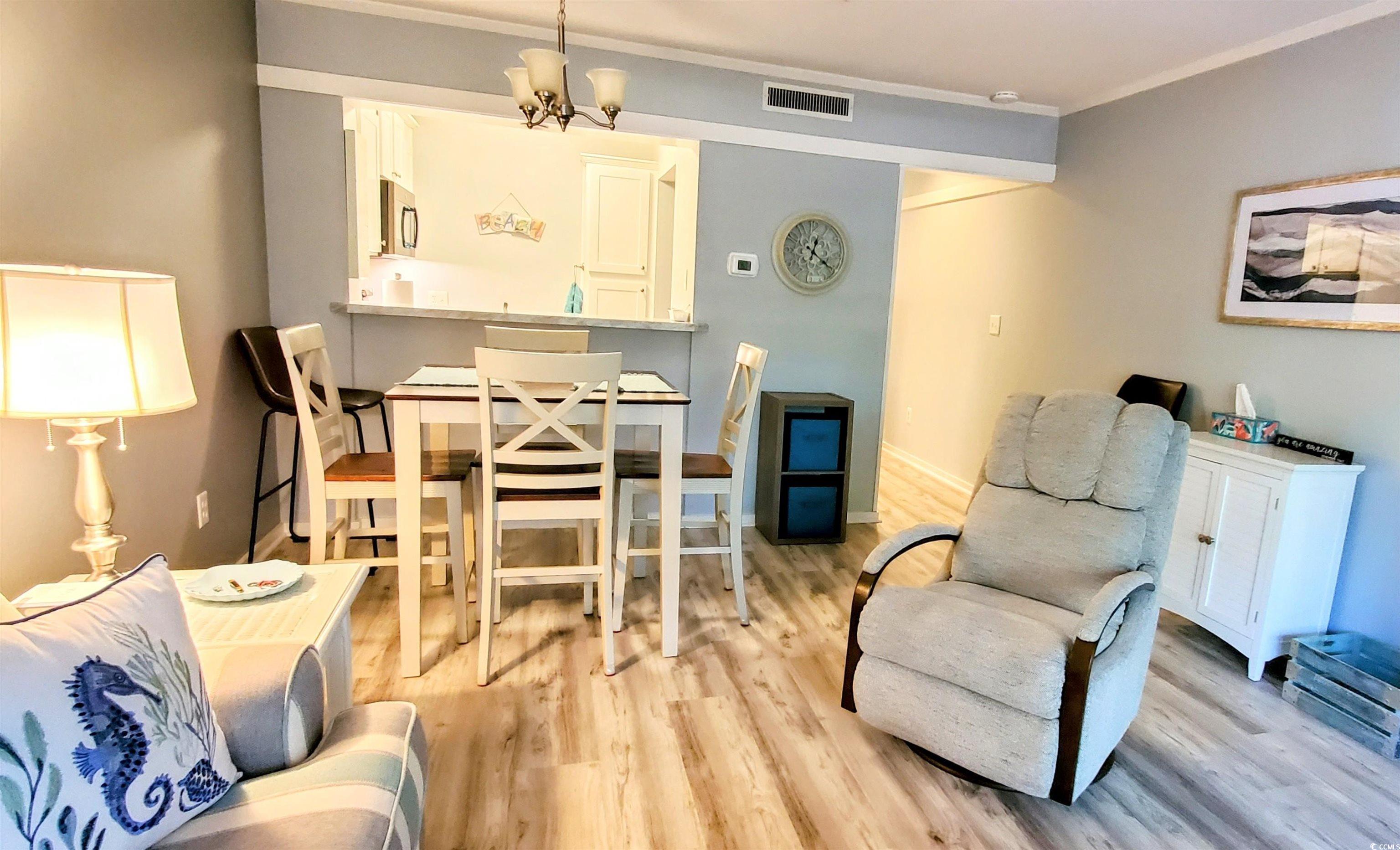 This lovely first floor condo has updated kitchen and baths and offers a beautiful large tiled shower, stainless appliances and stacked washer/dryer. It is a well cared for second home. The LVP flooring, water heater and washer/dryers were replaced withing the past tree years. It is being sold furnished. Great location; close to the beach, indoor pool and restaurant and there a good pool view from the porch. There are no rental obligations and is available for personal use or rental immediately after closing. Situated on 57-acres of park-like ground with stunning live oaks. Ocean Creek features 24 hour gated security, elevator access in each Lodge building, a tennis center, an onsite restaurant, putting green, and multiple outdoor pools and an indoor pool. The resort boasts a wonderful oceanfront Beach Club with a snack bar, sand volleyball court, playground, outdoor pool, storage lockers, and restrooms. Easy to view!