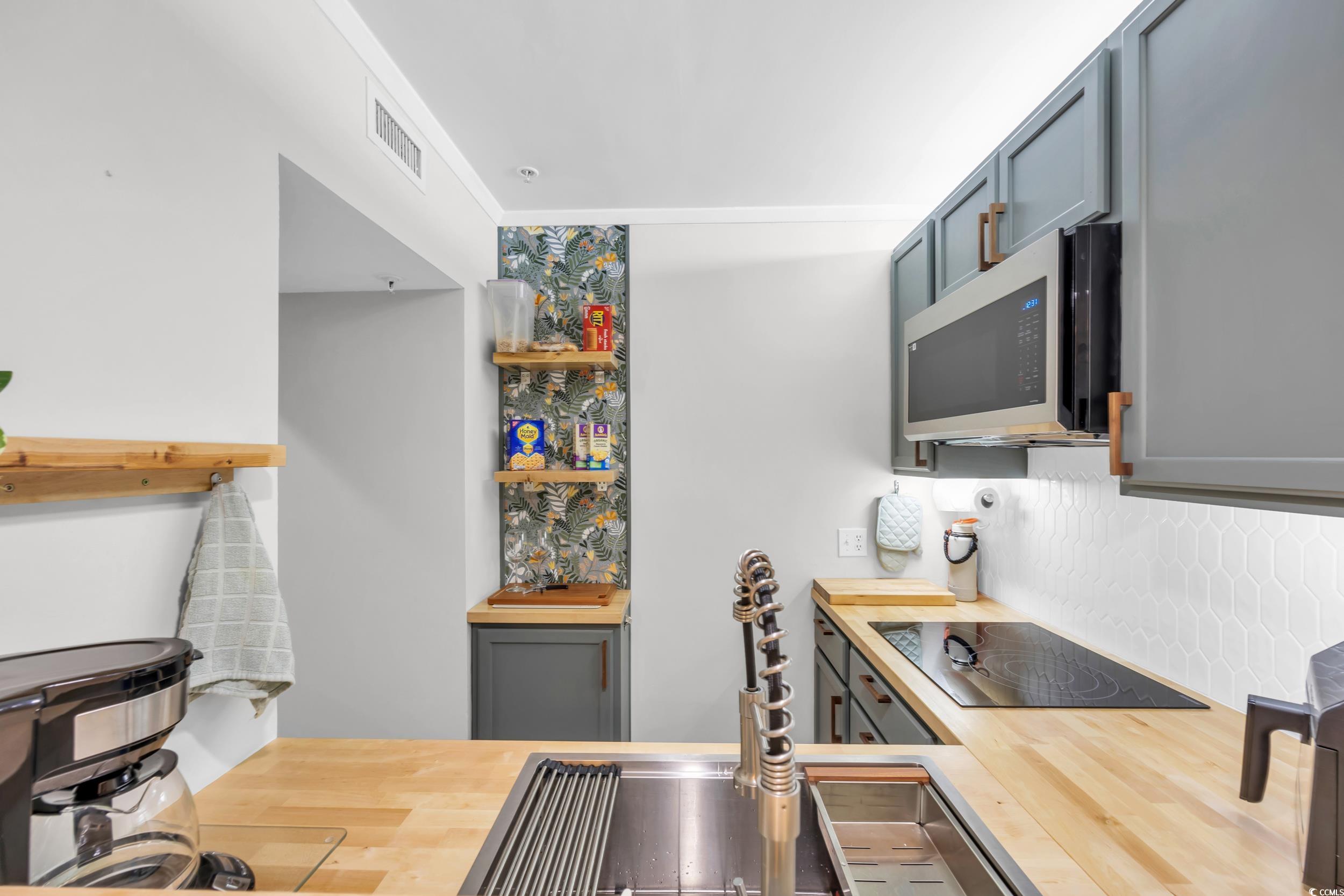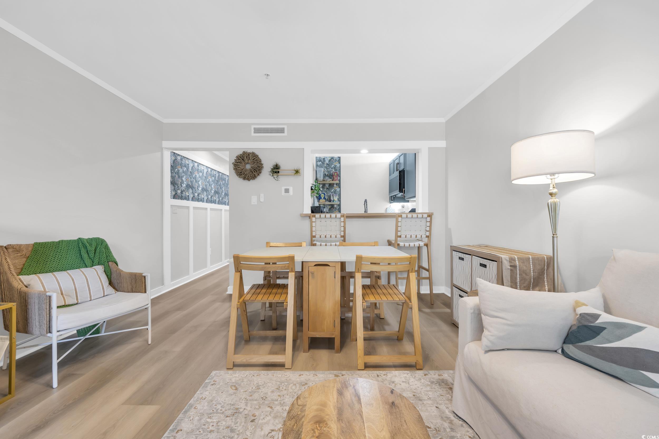 This fully renovated top floor in elevator building, charming one-bedroom 1 1/2 bathroom condo is nestled in the peaceful, wooded, oceanfront community of Ocean Creek. Inside, youll find a fully renovated California Coastal design completed in 2025. Everything is NEW, including the HVAC, water heater; kitchen cabinets, all new stainless-steel fridge, dishwasher, convection oven/microwave and electric cooktop, butcher block counters, a new sink and faucet. One and half baths, both newly remodeled, adds to the great features of this condo. Waterproof LVP flooring throughout the condo. The large main bedroom is beautifully decorated with a king bed and is big enough for an additional twin bed (stored in closet), if you so desire. Relax on the screened-in balcony with upgraded flooring and new seating while surrounded by nature for your morning coffee or an evening glass of wine. Living room includes a queen size Murphy bed , large slipcovered sofa with chaise lounge, rattan accent chairs a 65 LCD tv, and a store away table and chairs that seats 6, plus bar seating for 2. The Ocean Creek community spans 57 acres of meticulously manicured grounds with trails, a Four Seasons restaurant, bar lounge, outdoor pool, heated indoor pool, barbecue pavilion, tennis and pickleball courts, putting green, playground, and an oceanfront beach cluball just steps from this condo. A total of nine pools on the property. Outdoor pools are salt water. Short 6 minute walk to the sand or Shuttle service from May-October takes you throughout the resort. This condo is ready to move in or buy for an investment and rent right away. Conveniently located near the best of Myrtle Beach, including Barefoot Landing, Duplin Winery, Tanger Outlets, and Restaurant Row. Dont miss this incredible opportunity!