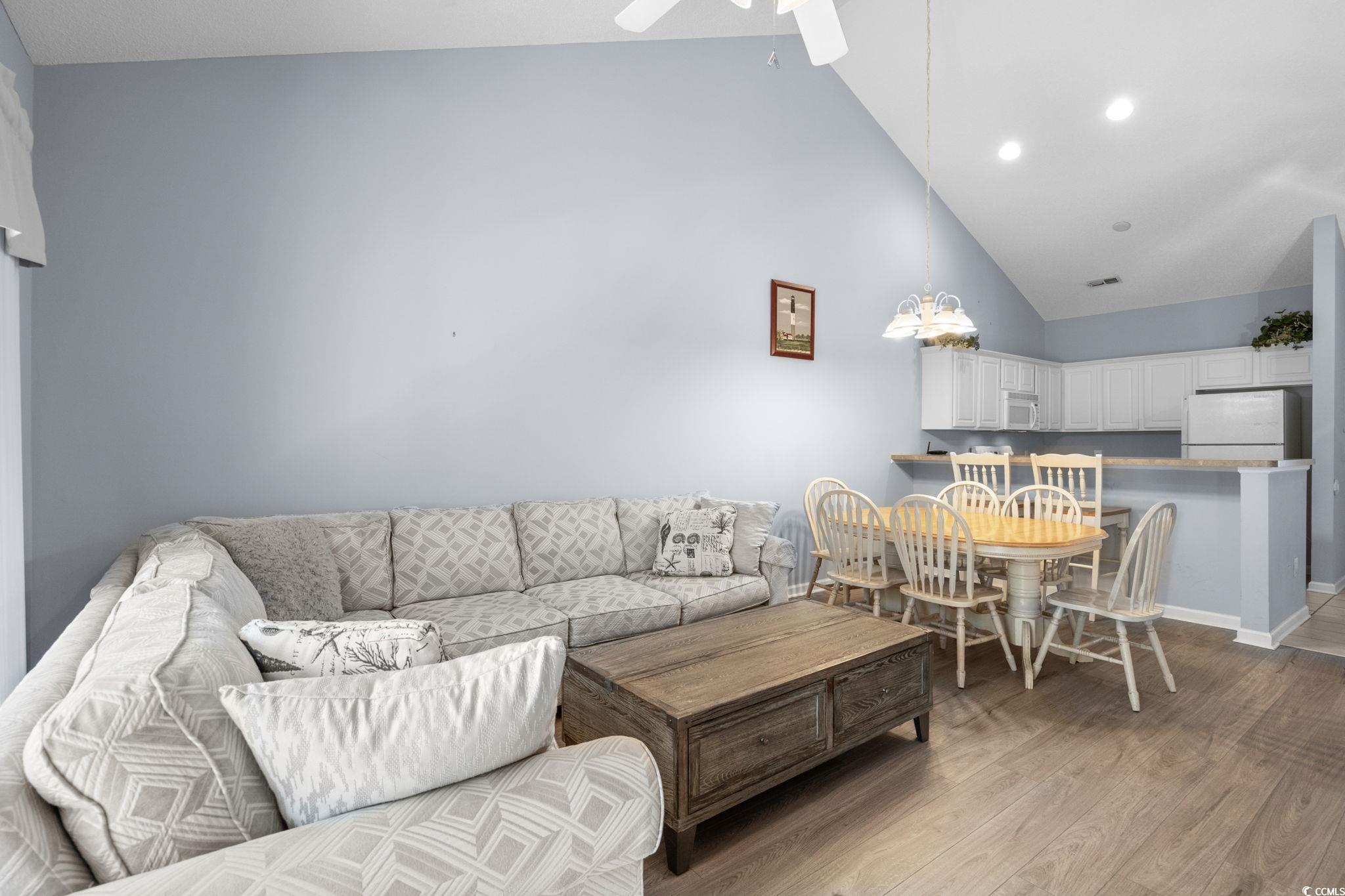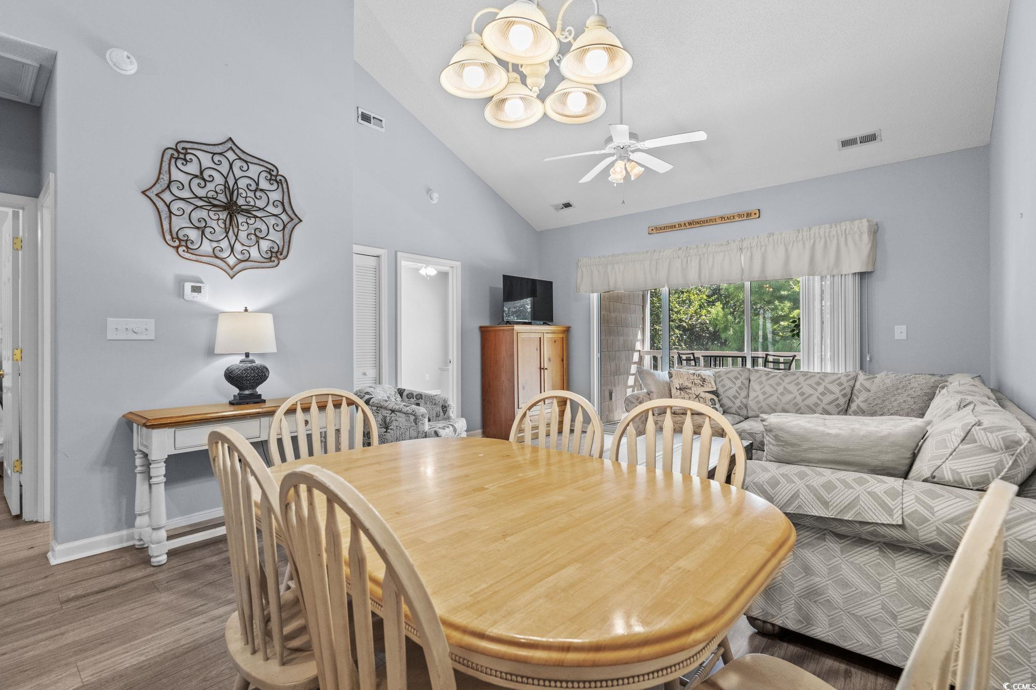 Welcome to Village at the Glens a golf-side community just minutes from Cherry Grove Beach and North Myrtle Beach. This 2-bedroom, 2-bath condo is furnished and move-in ready, offering an easy blend of comfort, convenience, and investment potential. Inside, vaulted ceilings and soft natural light create an open, airy feel, enhanced by Luxury Vinyl Plank and tile flooring throughout the home. The kitchen features full-size appliances and a breakfast bar that connects seamlessly to the dining and living spaces. Step out to the private screened balcony overlooking a quiet courtyard the perfect spot for morning coffee or evening relaxation. The primary suite includes dual closets, a ceiling fan, and an en-suite bath. A second bedroom and full bath provide plenty of space for family or guests. Additional highlights include an in-unit washer and dryer, an outside storage closet, and coordinated coastal dcor throughout. Residents of Village at the Glens enjoy a heated community pool open year-round, shaded lounge areas, and convenient parking. The HOA covers exterior maintenance, water/sewer, and cable/internet, making ownership care-free. The location offers quick access to world-class golf, Little River waterfront dining and festivals, Vereen Gardens, the Intracoastal Waterway, and the nightlife of Ocean Drive. Whether youre looking for a full-time residence, a vacation getaway, or a rental investment with both short- and long-term options available, this condo checks all the boxes.Dont miss the opportunity to own a slice of the coast schedule your showing today
