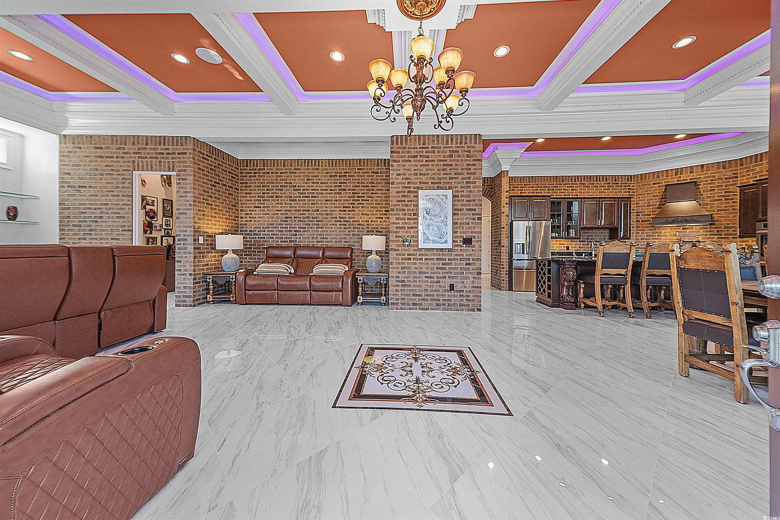 This custom built one of a kind two year old home is a marvelous mix of luxurious materials and well thought out design. Over 4,000 heated sq. ft. open floor plan design with 3BR/3BA's and also two separate rooms that could be used for office space or a study. This gorgeous home boasts over 150 tons of brick, including over 7,000 hand cut corner brick that goes from the floor to the 12 ft. trey ceilings in the main living area. The high ceilings are complimented by the most magnificent crown molding and trim and custom lighting throughout to give you an amazing chic and modern ambience. Every countertop in the home has designer granite, and also beautiful porcelain tile flooring throughout. The seller of this well thought out home, even had the foresight to have it elevator ready with a shaft from bottom to top if the new owner decided to do so. The exterior stairs have been designed and built on the left side of the house as to not obstruct any parking to leave it completely accessible to hold 5 cars inside and has no columns for ease of parking. You can easily pull in one side, and out the other. Also under the stairs, extra storage has been built. Both sides of the garage are slopped as well and provide retractable hoses with hot and cold water. And to top it off, the whole garage flooring has been epoxy coated. If you need an extra parking space for your special car, no problem, you can park it INSIDE in the back of the home. The downstairs in-home gym is second to none with state of the art equipment that comes furnished with it. This home comes completely furnished with high end furniture, accessories and the custom made Italian Cognac Leather seating in the living room has massage and heating. And you will also notice the hand carved imported Mexican dining room and kitchen chair and table furniture. Everything stays with the home even down to the dishes, pots, pans, glassware, etc. You will need nothing upon taking possession of this majestic home and can be sure there is nothing else like it anywhere. We would love to give you a private showing as this is truly a must see to get that WOW feeling as we did ourselves upon first viewing.