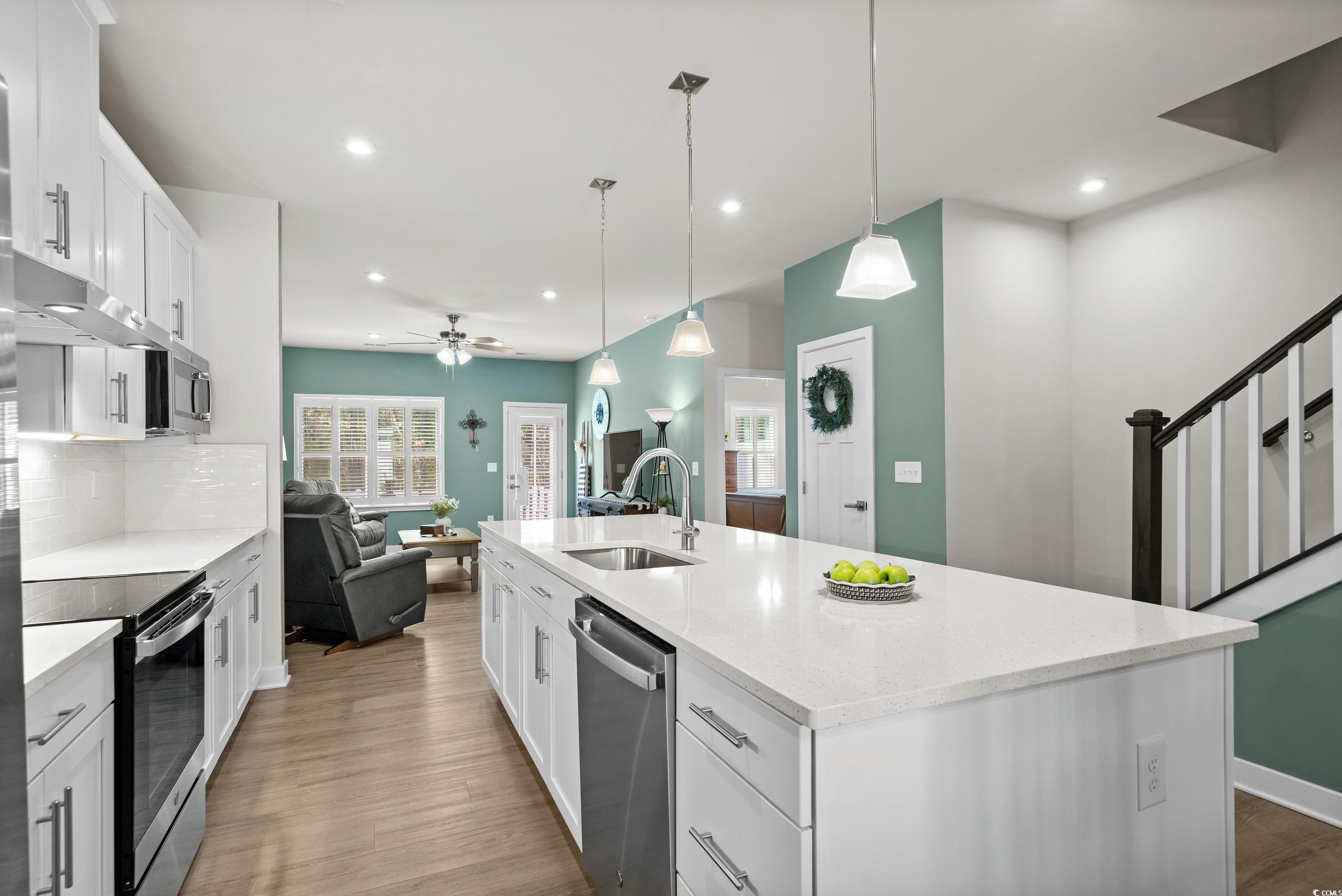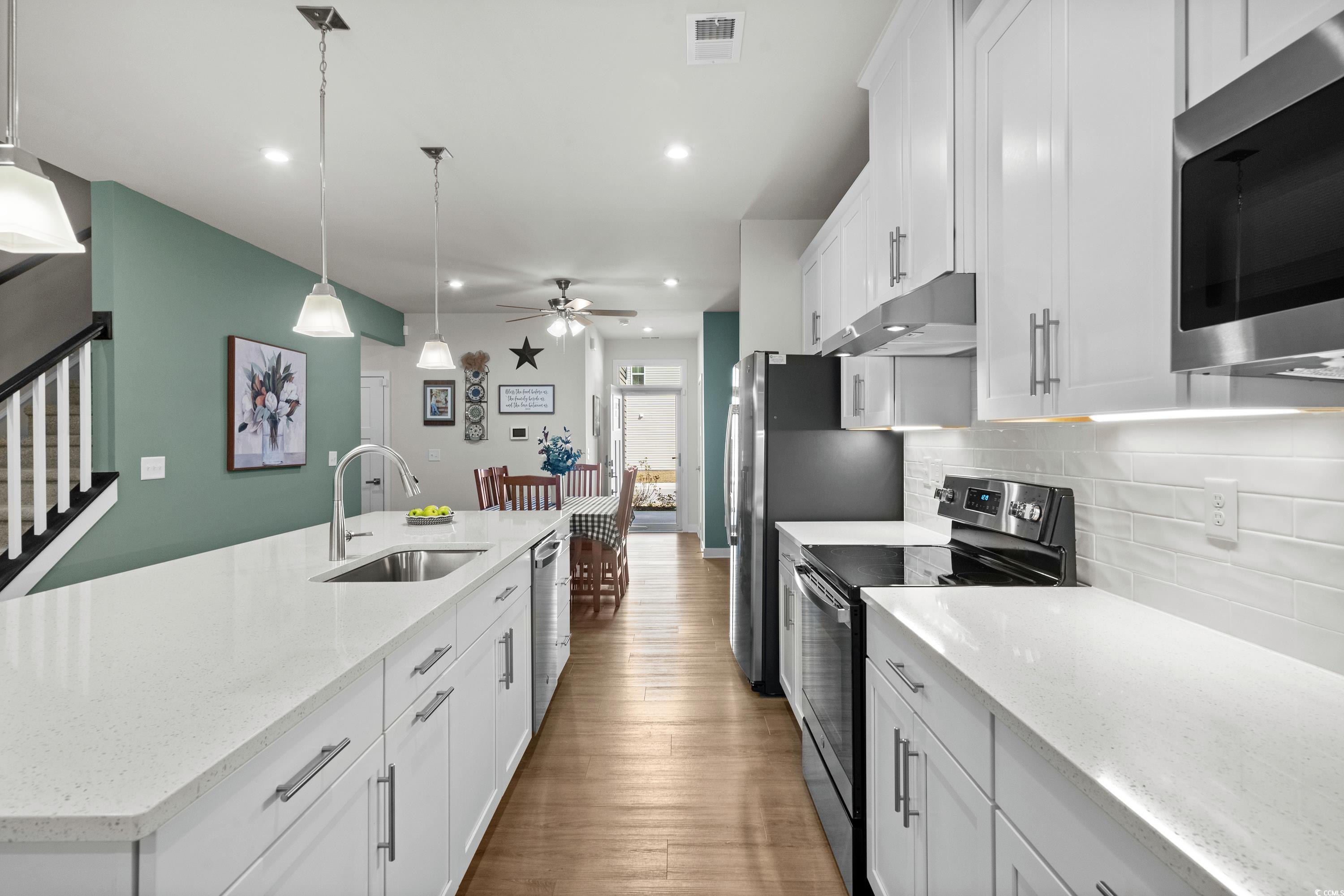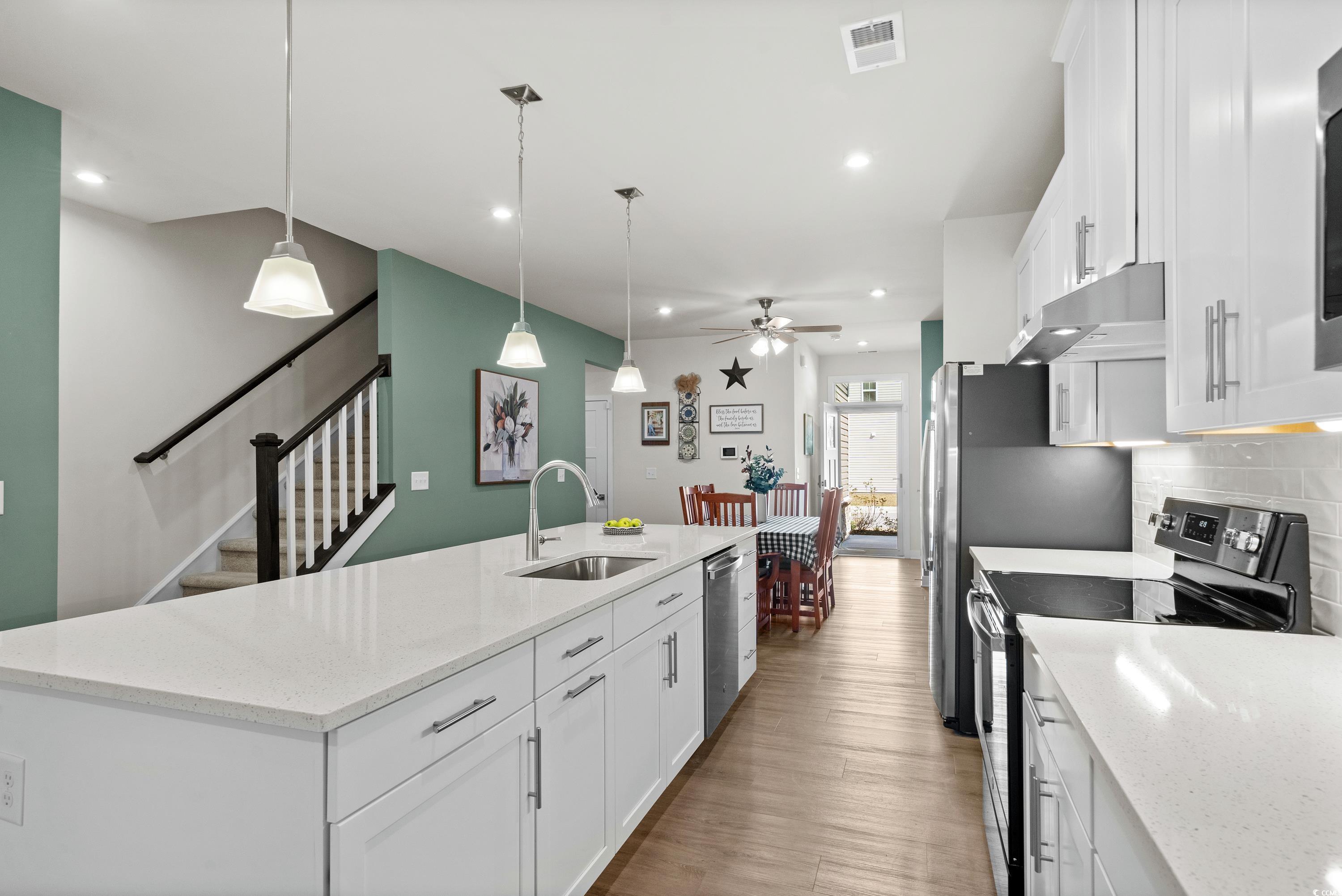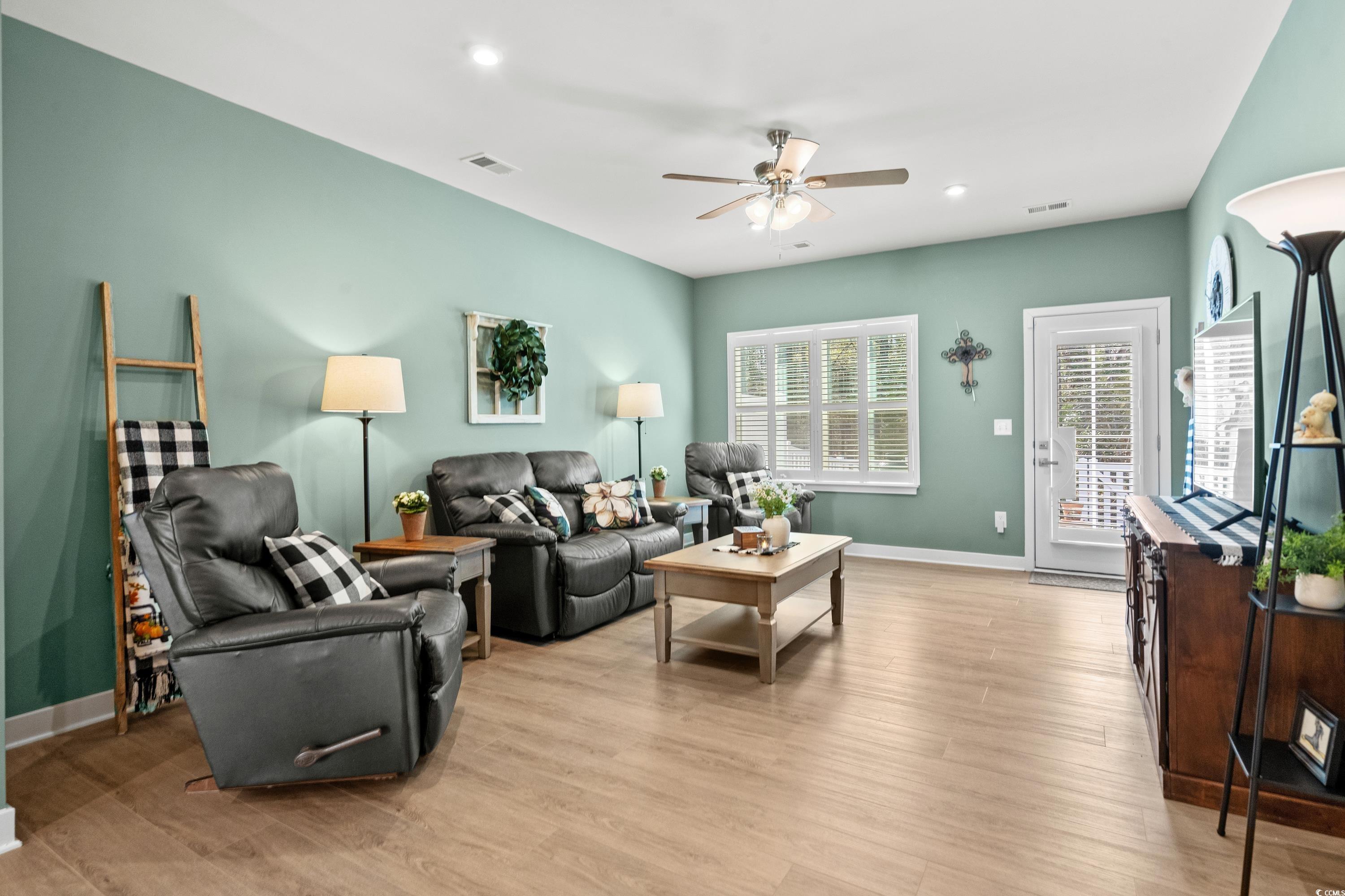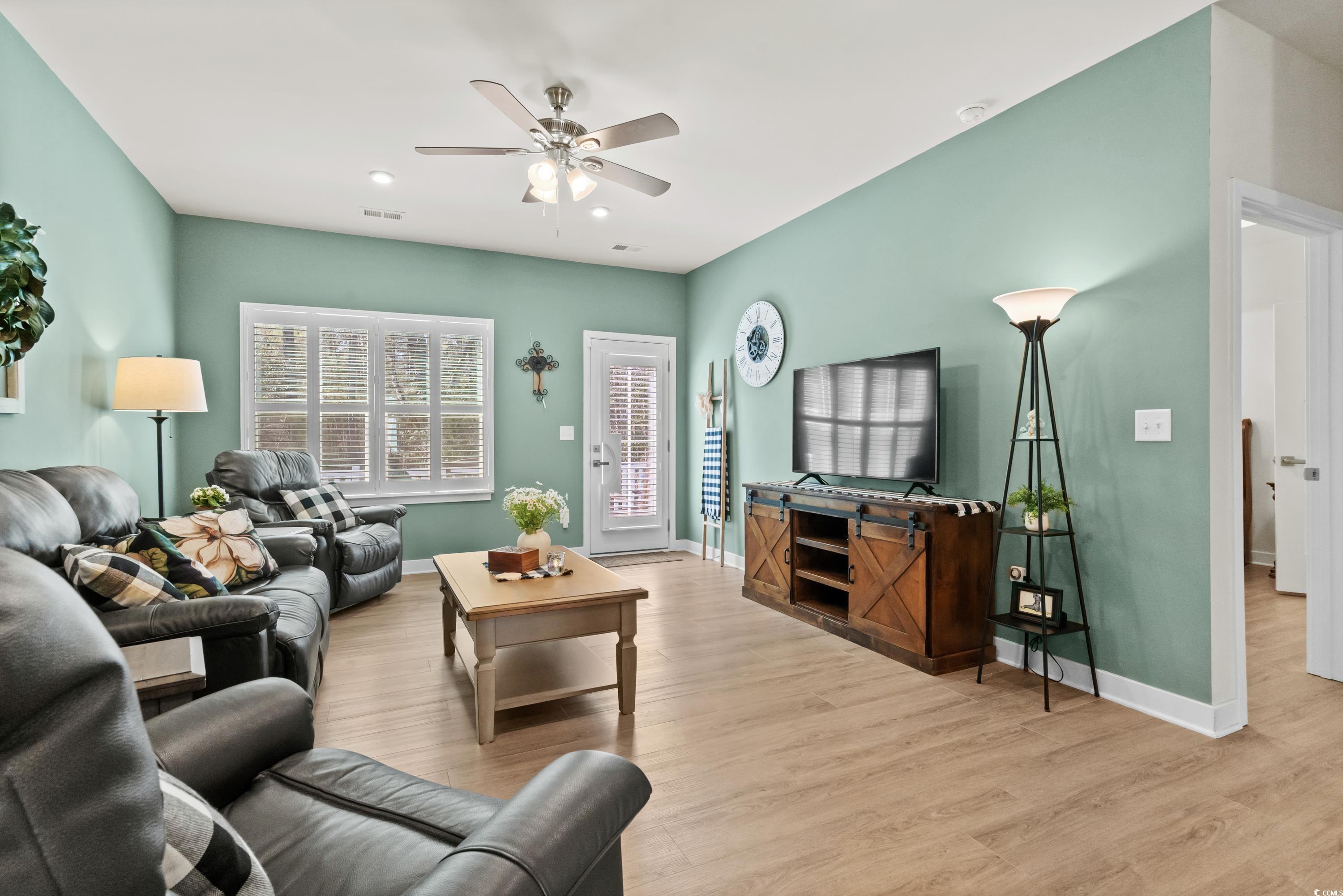 Loaded with upgrades, this 3BR, 2.5BA townhome-style condo offers nearly 2,000 sq ft plus a 2-car garage in the desirable Forest Pines community, just steps from Arrowhead Country Club. The sought-after Caroline floor plan is the only model in the neighborhood with a first-floor primary suite. Inside, youll find a stunning designer kitchen with quartz countertops, stainless steel appliances, tile backsplash, under-cabinet lighting, soft-close cabinets, and roll-out shelving. Plantation shutters, ceiling fans, custom paint, and luxury vinyl plank flooring flow throughout the open-concept main level, which also features a storm door entry, dining and living areas, a half bath, and a laundry room with washer and dryer included. The spacious primary suite boasts a tray ceiling, large walk-in closet, and double-sink bath with walk-in shower. Upstairs are two additional bedrooms, a full bath, and a versatile flex space. Step outside to your private, fenced backyard with patio and wooded viewperfect for entertaining or pets. Even the garage is upgraded with painted walls and professional epoxy flooring. Exterior maintenance is a breeze with vinyl siding, stone accents, gutters, and HOA coverage for upkeep and annual power washing. Builder warranties for plumbing, HVAC, electrical, and structure transfer at no cost, and hurricane window protectors are included. Forest Pines is a small community of just 84 homes with a pool, located in the Carolina Forest school district and minutes from the beach, shopping, and dining. This home is truly move-in ready and priced to sellschedule your showing today! ***ALL OFFERS CONSIDERED - OWNERS HAVE RELOCATED AND ARE ANXIOUS TO SELL***