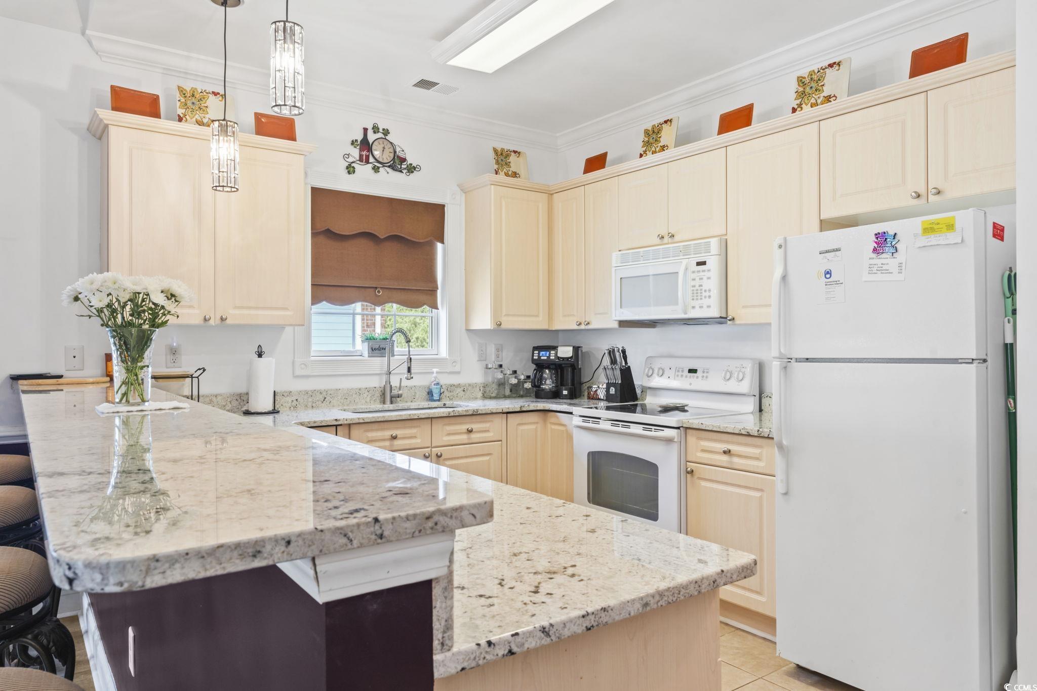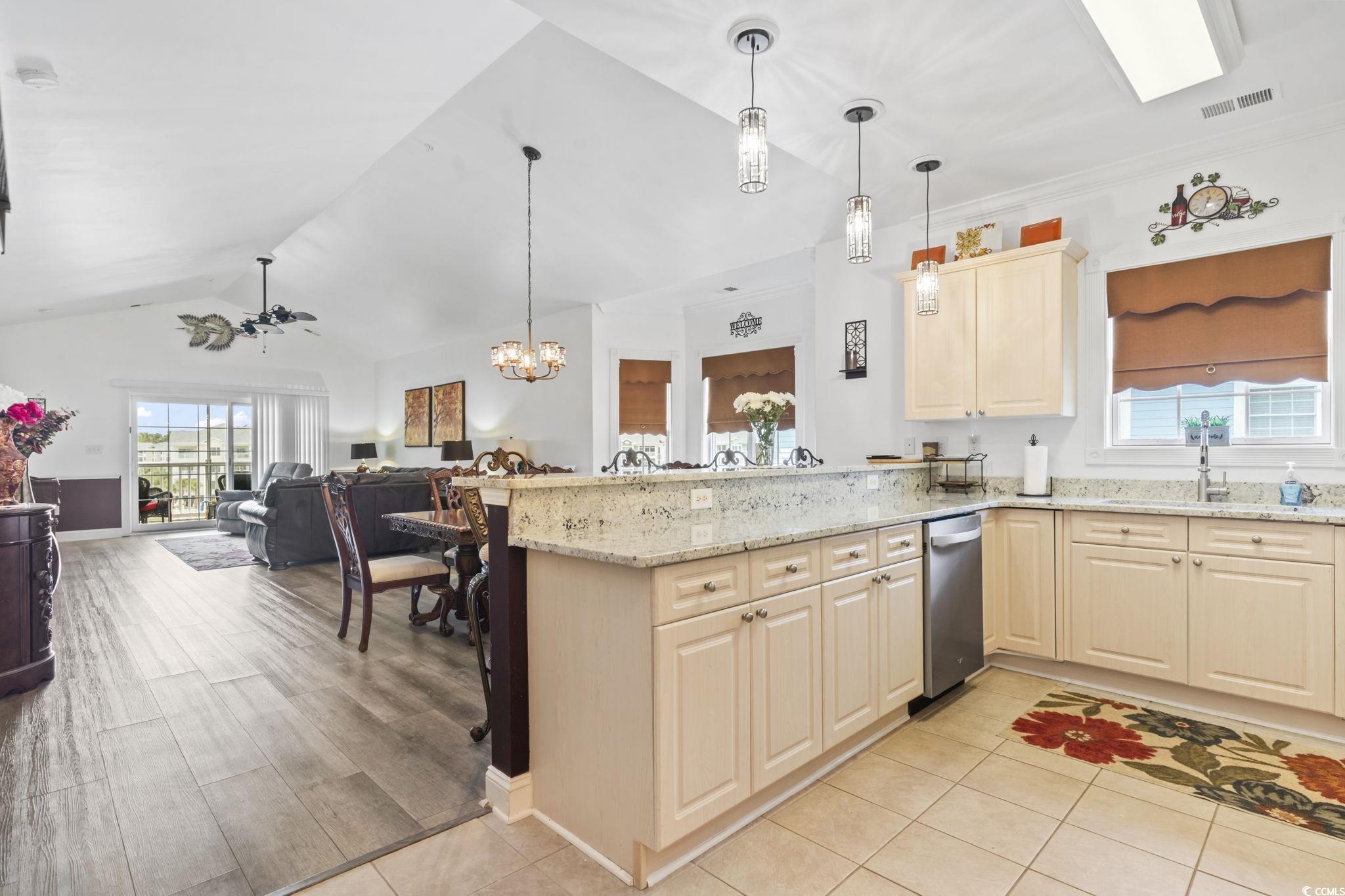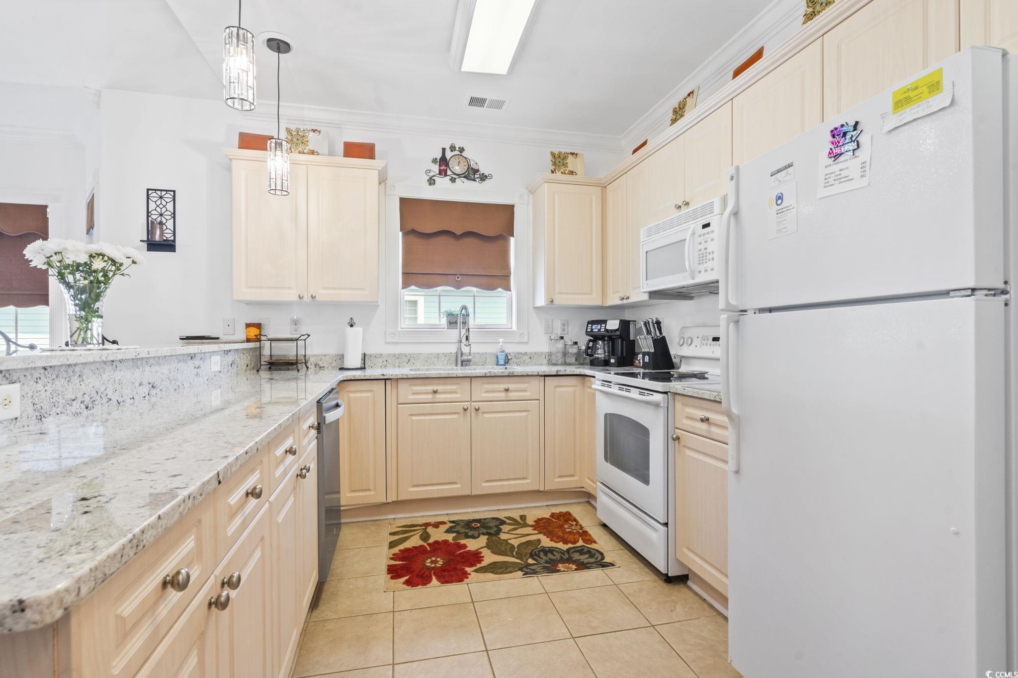 Discover this beautifully maintained 3-bedroom, 2-bath end unit condo located in the desirable Magnolia Pointe community at Myrtlewood Golf Course. This top-floor residence offers vaulted ceilings, abundant natural light, and a spacious open-concept design. Recent updates include a new roof, fresh interior paint, granite countertops, and luxury vinyl plank flooring. The kitchen overlooks the dining and living areas, creating an ideal space for entertaining. The primary suite features a walk-in closet and ensuite bath, while two additional bedrooms provide flexibility for family, guests, or a home office. Step outside to your screened-in patio with pull-down shades and take in the serene pond viewsa peaceful setting just minutes from the beach. Additional updates include a 15-month-old air conditioning system for comfort and efficiency. This condo is being sold fully furnished, offering a turnkey opportunity for a primary residence, second home, or investment property. Magnolia Pointe is recognized as a Blue Ribbon community, offering beautifully landscaped grounds, multiple swimming pools, walking trails, and easy access to Myrtle Beachs premier golf, shopping, dining, and attractions. Schedule your private showing today and experience all that this move-in ready condo has to offer.