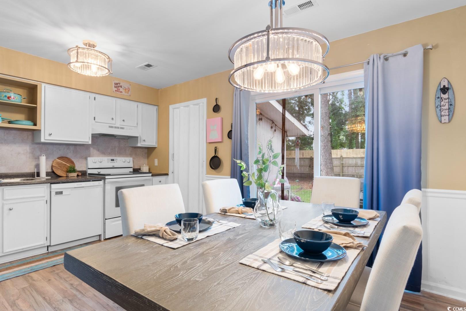 Discover this beautifully remodeled 3-bedroom, 2-bath brick ranch tucked away in the quiet Bridge Creek neighborhood with NO HOA, yet just minutes from all the shopping, dining, and entertainment Myrtle Beach has to offer. You can even walk or take the golf cart to nearby restaurants, banks, and other conveniences. Upgraded with durable LVP flooring throughout, freshly painted throughout, newer appliances, and updated windows, this home combines comfort with style. The roof and HVAC were both replaced in 2018 for added peace of mind. The inviting floor plan includes a spacious living area, a one-car garage, and a generously sized fenced backyard perfect for outdoor gatherings, pets, or a private garden. Enjoy the shade of mature trees and the security of being located outside a flood zone. Whether you are looking for a primary residence, vacation retreat, or investment property, this move-in ready gem checks all the boxes without the burden of a HOA fee.
