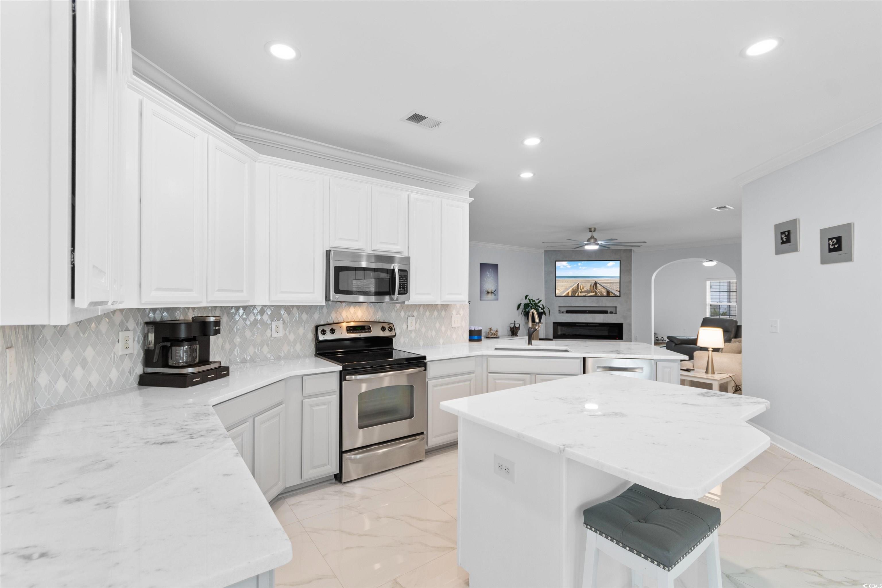 This stunning one-level, 3-bedroom, 2.5-bath home sits beautifully on a corner lot with a 2-car garage, blending timeless charm with modern updates. Elegant archways, crown moulding, and new tile flooring with an anti-fracture membrane flow through the main living areas, creating a bright and inviting atmosphere. The living room is a welcoming centerpiece with a cozy corner fireplace and a striking propeller-style ceiling fan that adds contemporary flair. The formal dining room, detailed with classic wainscoting, is perfect for intimate dinners or festive gatherings. The brand-new kitchen is a chefs dream, featuring two-tone cabinetry in soft neutral tones, a coordinating backsplash, new countertops, new flooring, and a center island. A breakfast nook, built-in desk, and large walk-in pantry provide both functionality and style, while stainless steel appliances make everyday cooking a breeze. A dedicated laundry room with a reverse osmosis water system adds convenience and efficiency to daily routines. The primary suite is a serene retreat, complete with a tray ceiling, LVT flooring, dual walk-in closets, and a spa-like en suite with dual sinks and a walk-in shower. Bedrooms two and three also feature LVT flooring, and the fully updated hall bath offers comfort-height countertops and a walk-in shower, perfectly designed for ease and comfortno carpet throughout the home. A peaceful Carolina room, currently used as a yoga and meditation space, invites relaxation and can easily serve as a bonus room, office, or quiet retreat. The screened-in porch provides an additional space to enjoy morning coffee or evening sunsets, making indoor-outdoor living effortless. Additional highlights include hurricane shutters, mature landscaping with curbscape edging, and a security system. Clear Pond residents enjoy resort-style amenities, including multiple pools, a clubhouse, fitness center, and playgroundsmaking this move-in ready home the perfect combination of comfort, style, and lifestyle.