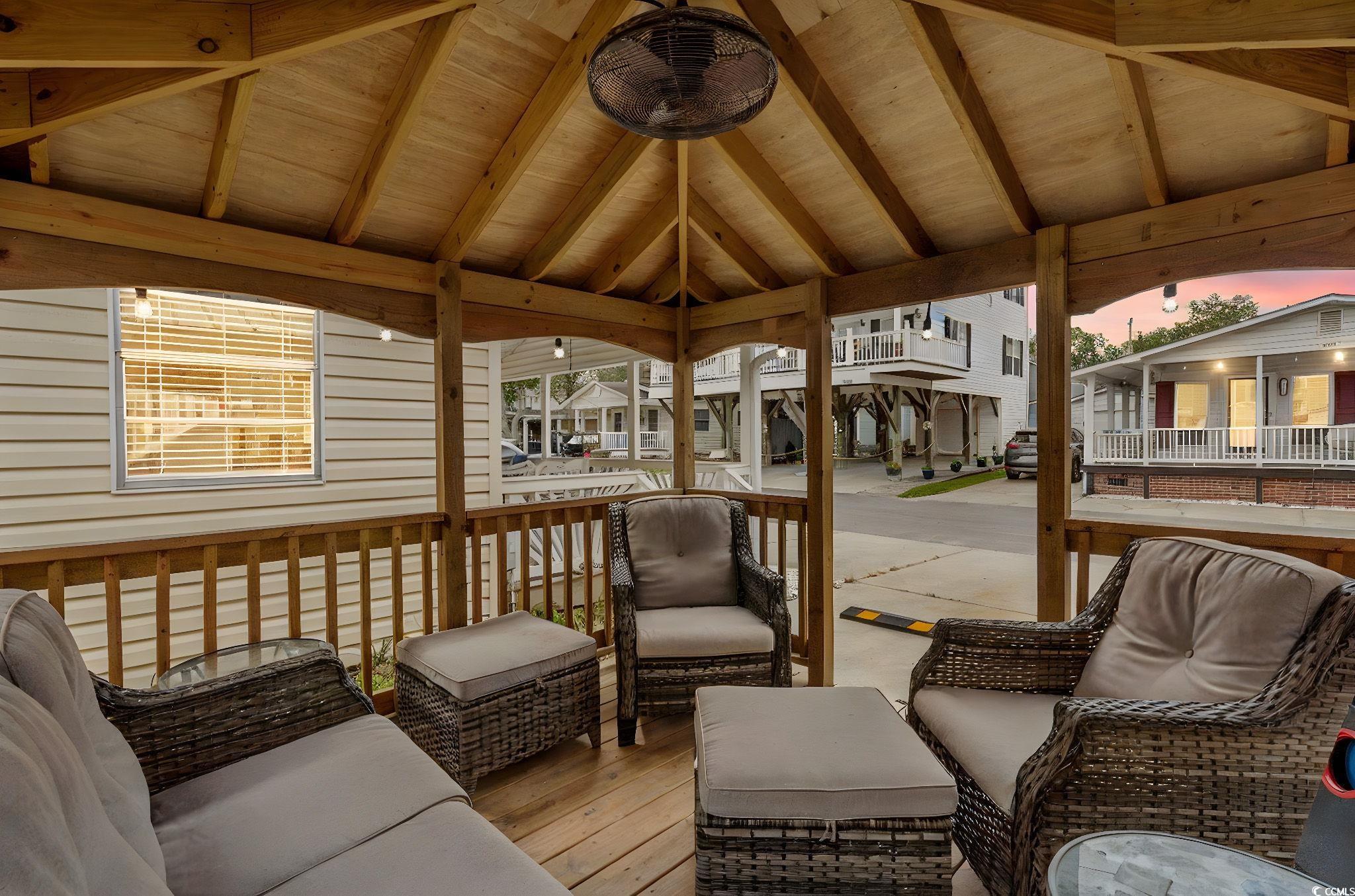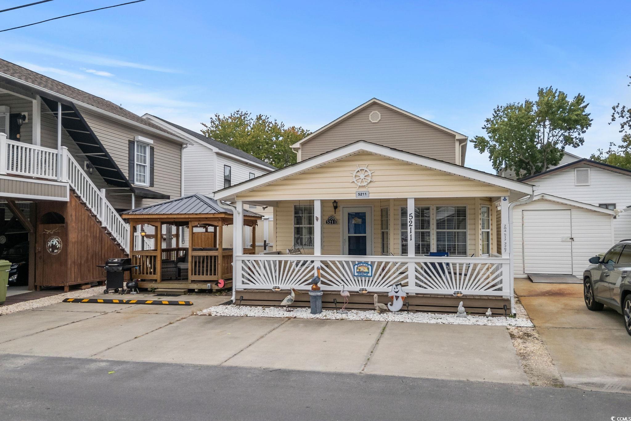 Welcome to 5211, this 2-bedroom 2 bath home has tons of outdoor entertaining space! Enjoy the gazebo with ceiling fan or the large covered front porch with ceiling fan and porch swing. Home is being sold fully furnished, washer/dryer is located inside the home. Entering inside 5211 you have a living room with ceiling fan, to the right is the dining area and kitchen with solid surface counters and tile backsplash. Bedroom #1 has ceiling fan and attached full bath #1 with walk-in shower. Bathroom #2 is off the kitchen, tiled walk-in shower along with washer/dryer. Bedroom #2 with bunks is located through full bath #2 in the rear of the home. Centrally located in the 5000 section of Ocean Lakes and close to all amenities.