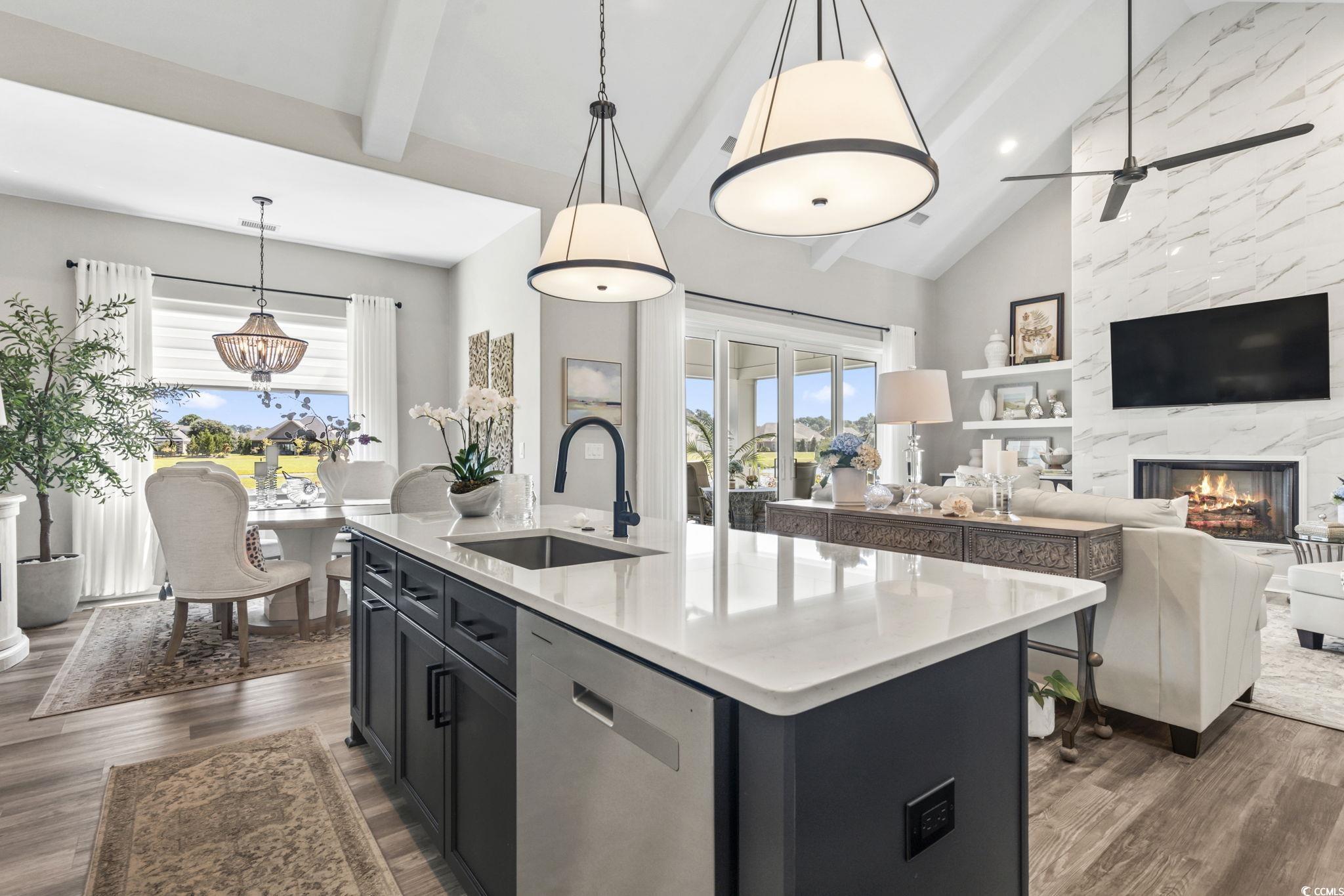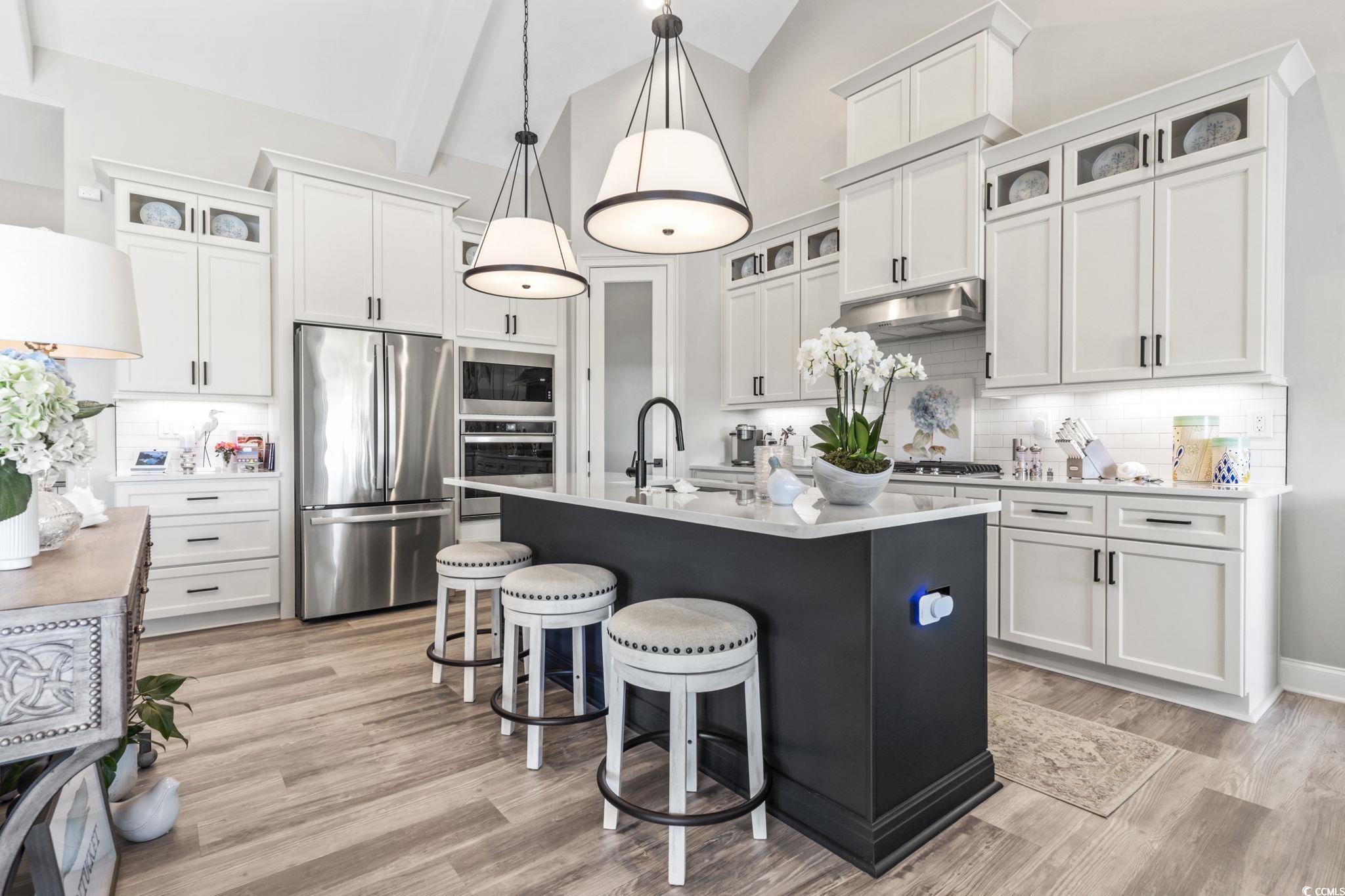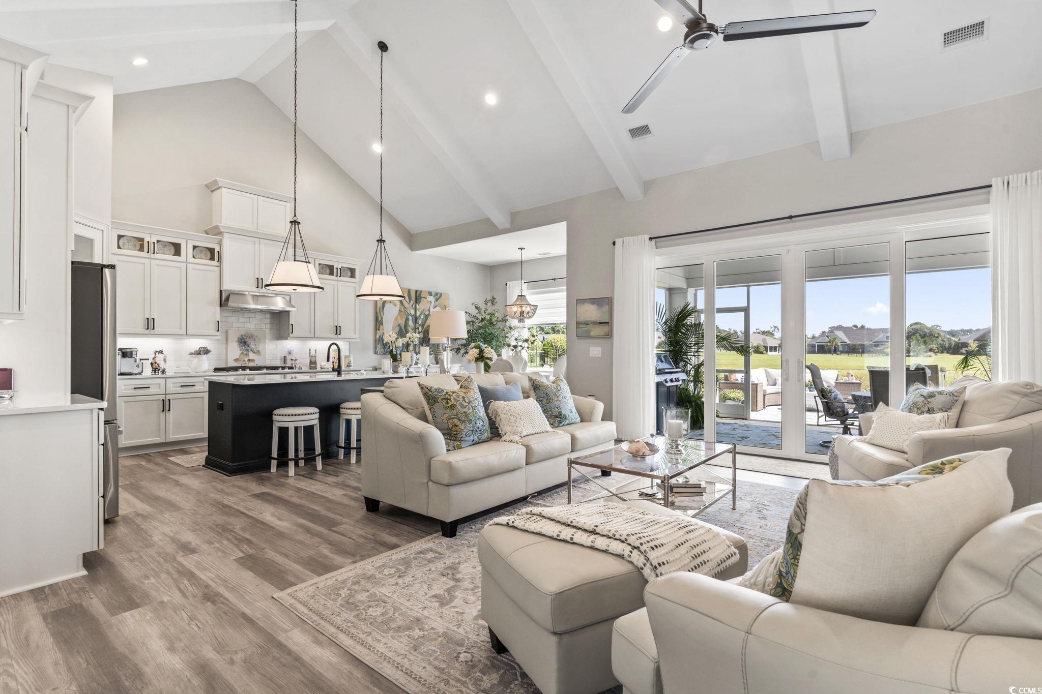 BACK ON THE MARKET AT NO FAULT OF THE SELLER!! Perfectly positioned, impeccably maintained, and upgraded, in the golf course community of Wild Wing Plantation. Open the front door to this home that combines a bright, open, and spacious design with tremendous attention to detail. From the foyer, the flow leads into a dining area and a vaulted great room highlighted by beamed ceilings, floating cabinetry, and a gas fireplace with a floor-to-ceiling porcelain tile accent wall. The kitchen sits just steps away, featuring quartz countertops, upgraded cabinetry, stainless steel appliances, and a walk-in pantry with a frosted glass door and custom shelving. A screened back porch with TV hookup extends the living space outdoors, leading to an expanded patio and custom landscaping that includes marble stone gardens, underground drainage, fresh shrubbery, and a rose garden. The owner's suite offers a tray ceiling, barn door entry, tremendous walk-in custom closets with upgraded melamine shelving. A spa-style bath with dual vanities, walk-in shower with bench, linen closet and private water closet. Two additional bedrooms are located on the main level - one with its own private bath and another with convenient access to a full hall bath. Upstairs, a large bonus suite with full bath provides flexibility for guests, hobbies, or office space. Added features include custom lighting, custom window treatments, plush carpet in bedrooms and office, a Brita whole-house water filtration system, a hybrid 70-gallon water heater, full home security system, and a garage refrigerator. Furnishings are negotiable, please ask your agent for further details. Residents of Wild Wing Plantation enjoy resort-style amenities: three pools, water slide, tennis and basketball courts, fitness center, clubhouse, playground, and community day docks with boat ramp and parking. The neighborhood is close to Highway 501, Coastal Carolina University, Horry Georgetown Technical College, Conway Medical Center, shopping, dining, and Myrtle Beach attractions. Square footage is approximate and not guaranteed. Buyer responsible for verification.