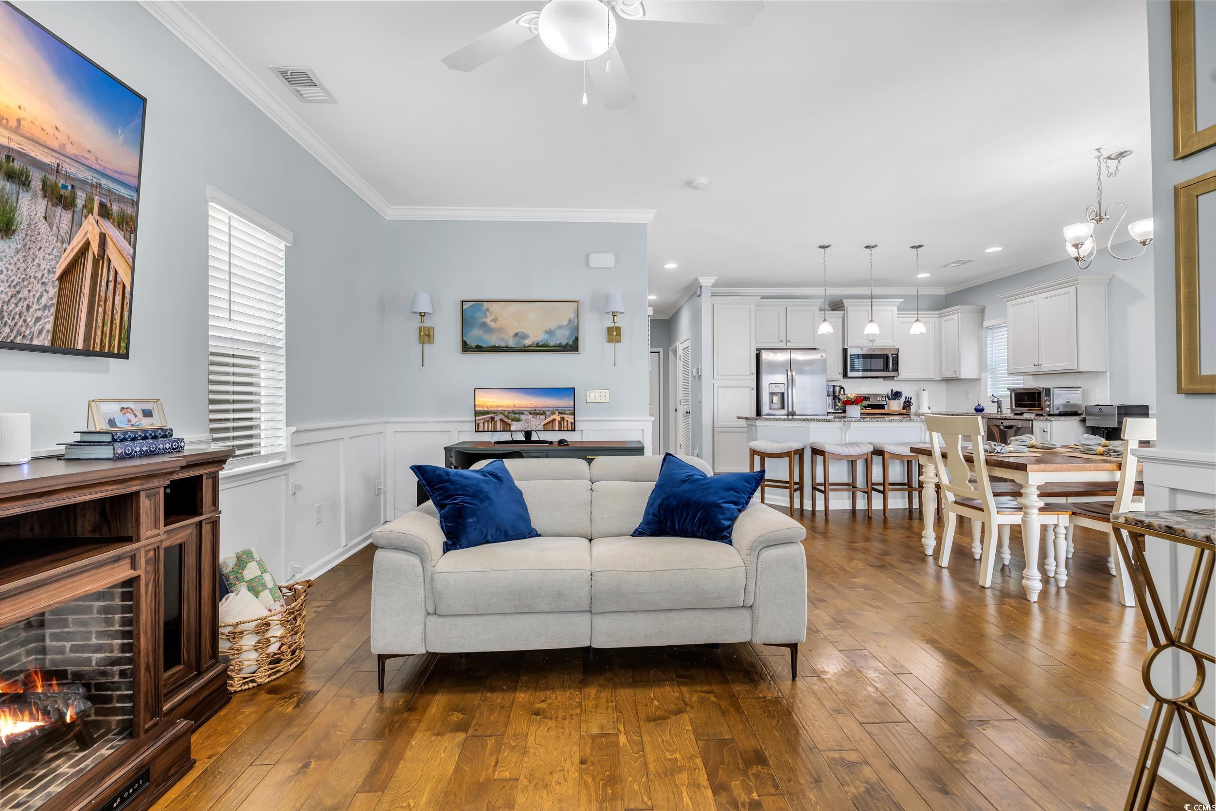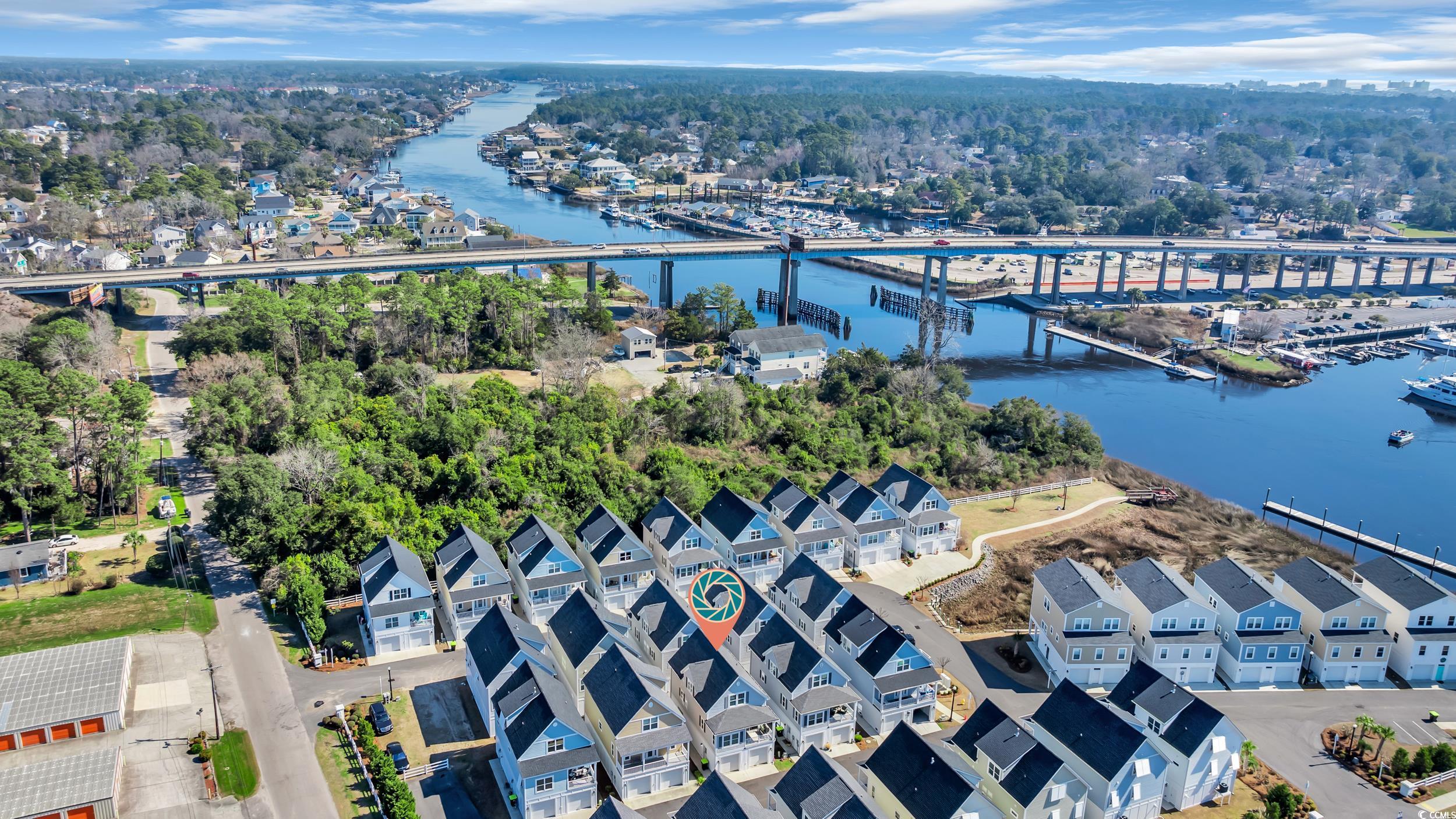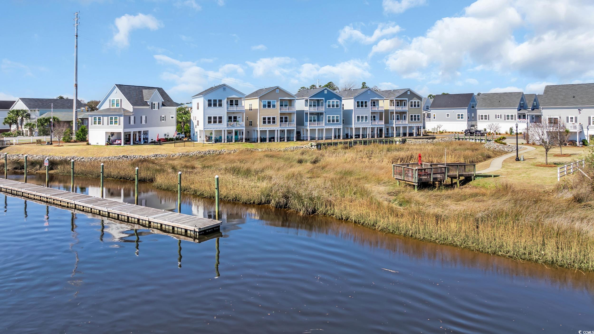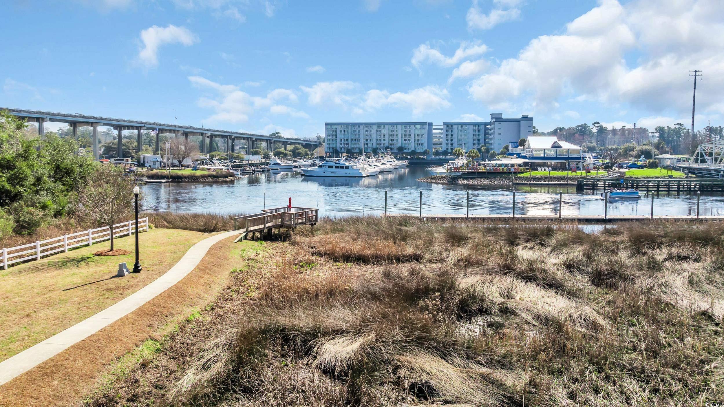 Charming, raised cottage style, 3BR-2.5BA home in the Cottages at Marker 350 in Little River. Enjoy a waterway life at Cottages at Marker 350! For your convenience, the community's boat dock allows temporary boat docking for your days on the waterway. This home's open & airy floor plan has plenty of natural light. You will immediately notice how beautifully this home is decorated in a Cape Cod style! You will also notice the enhanced wood flooring in the living areas and crown molding in the living & dining room, kitchen & master bedroom. The kitchen features upgraded cabinetry, granite countertops & work island/breakfast bar & tiled backsplash. The master bedroom is located on the first level & the updated master bath has spacious custom tile shower & a lovely vanity with double sinks. Two additional bedrooms with a Jack & Jill bath are on the upper level. Enjoy the waterway views & activity from the community's private dock and pier. You are minutes from the beaches at Cherry Grove & North Myrtle Beach, many marvelous restaurants, waterway activities, shopping & acclaimed golf courses. 2023: new gutters installed & entire house/sidewalks pressure washed. CPI Smart Home system in place & can be transferred to new owner. System allows the owner to control everything in the house by phone, security, thermostat, video doorbell, garage door openers, cameras, etc. HOA INCLUDES: dock, irrigation, landscaping, common area maintenance, electric common and trash removal.