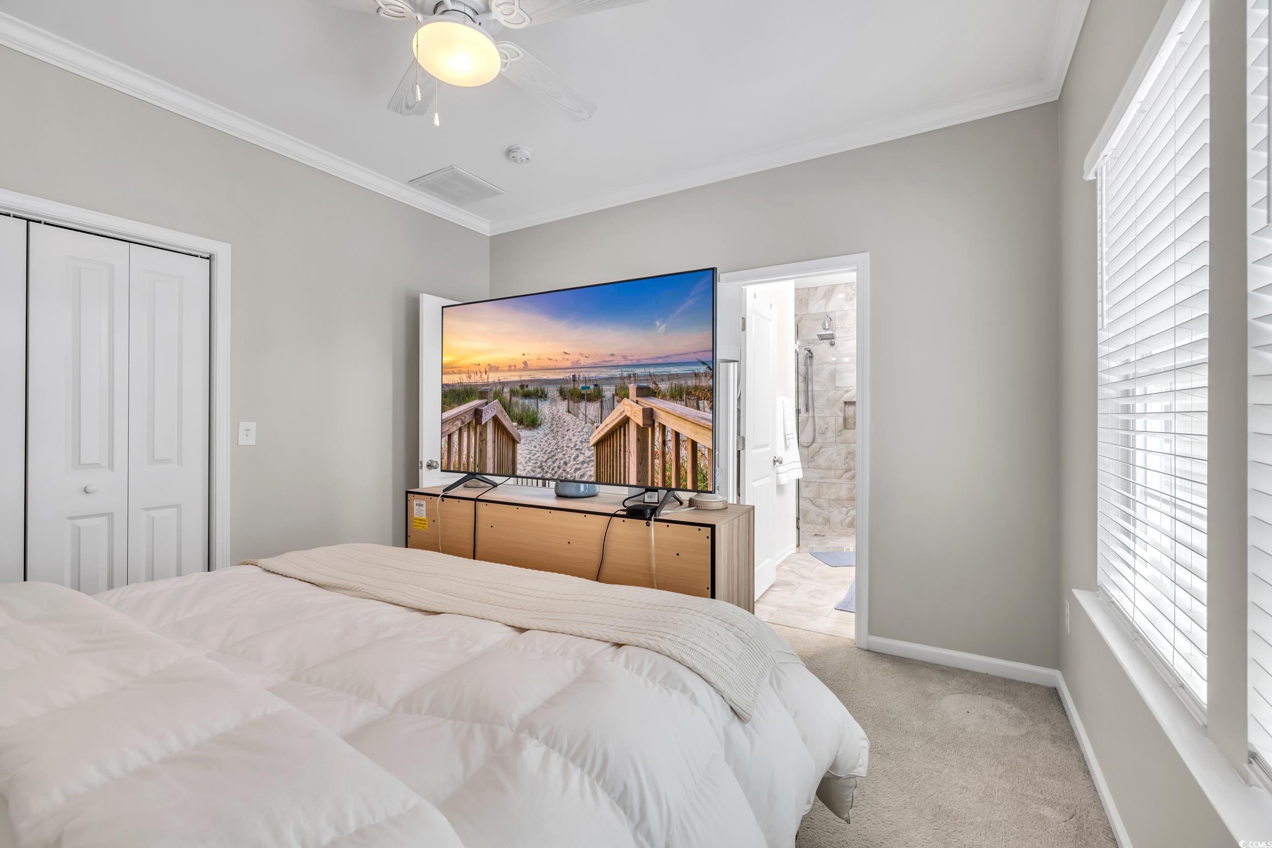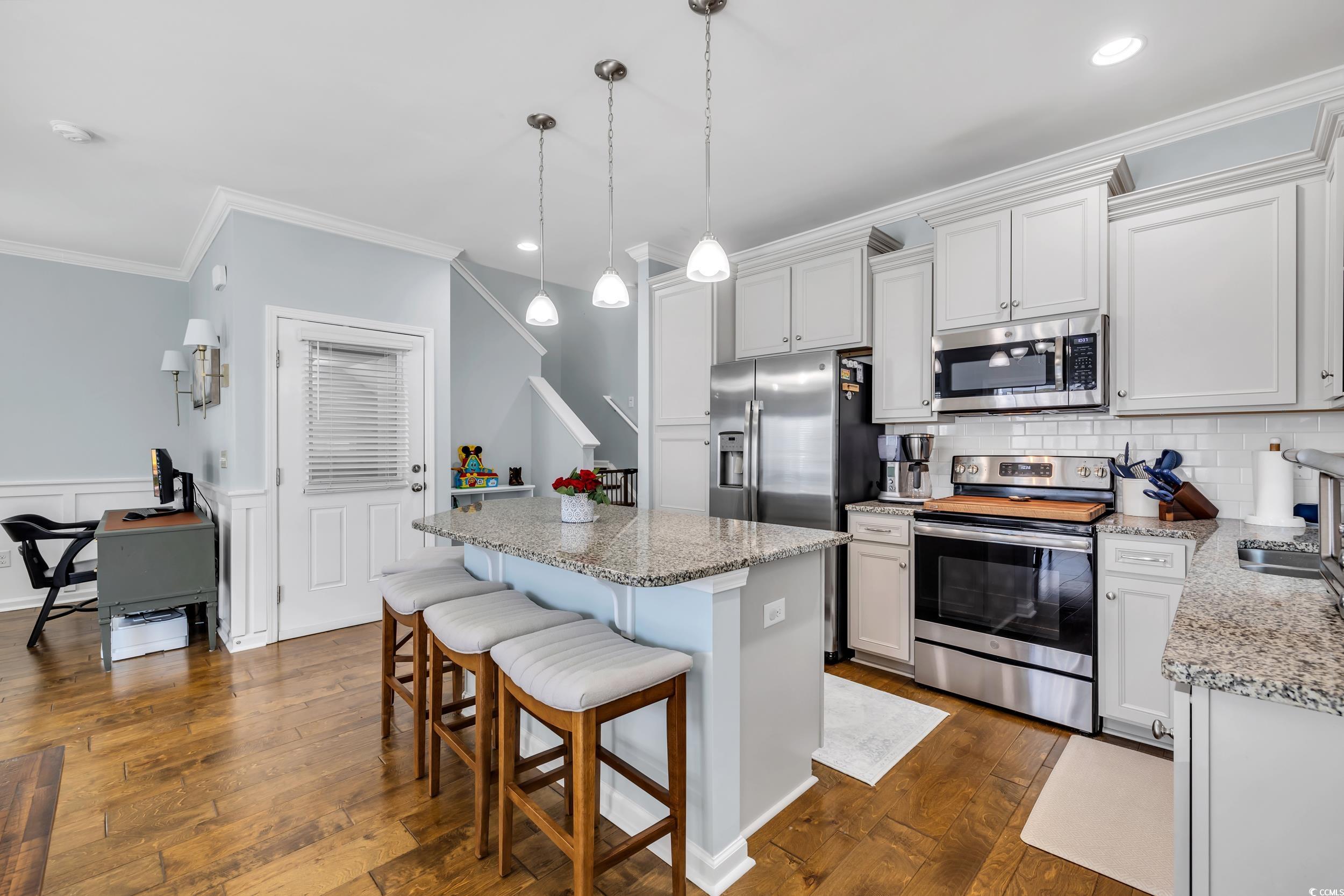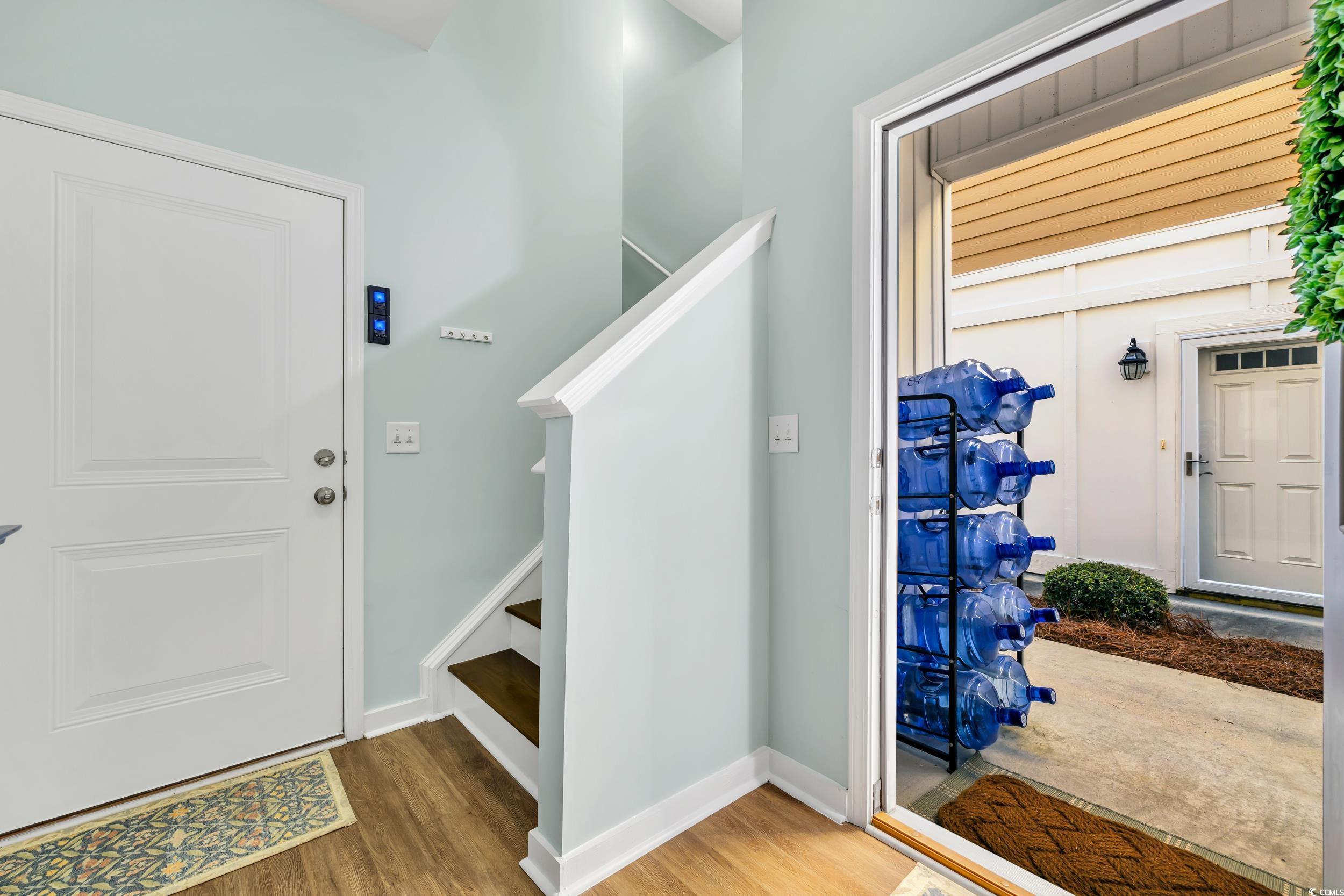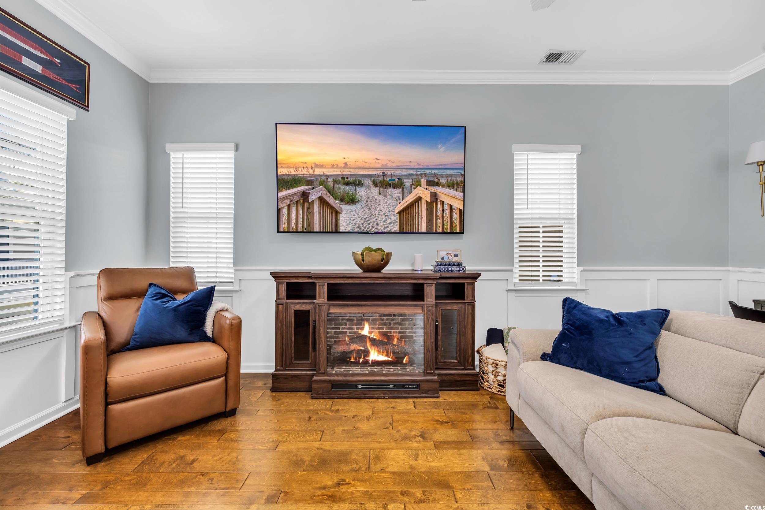 Charming, raised cottage style, 3BR-2.5BA home in the Cottages at Marker 350 in Little River. Enjoy a waterway life at Cottages at Marker 350! For your convenience, the community's boat dock allows temporary boat docking for your days on the waterway. This home's open & airy floor plan has plenty of natural light. You will immediately notice how beautifully this home is decorated in a Cape Cod style! You will also notice the enhanced wood flooring in the living areas and crown molding in the living & dining room, kitchen & master bedroom. The kitchen features upgraded cabinetry, granite countertops & work island/breakfast bar & tiled backsplash. The master bedroom is located on the first level & the updated master bath has spacious custom tile shower & a lovely vanity with double sinks. Two additional bedrooms with a Jack & Jill bath are on the upper level. Enjoy the waterway views & activity from the community's private dock and pier. You are minutes from the beaches at Cherry Grove & North Myrtle Beach, many marvelous restaurants, waterway activities, shopping & acclaimed golf courses. 2023: new gutters installed & entire house/sidewalks pressure washed. CPI Smart Home system in place & can be transferred to new owner. System allows the owner to control everything in the house by phone, security, thermostat, video doorbell, garage door openers, cameras, etc. HOA INCLUDES: dock, irrigation, landscaping, common area maintenance, electric common and trash removal.