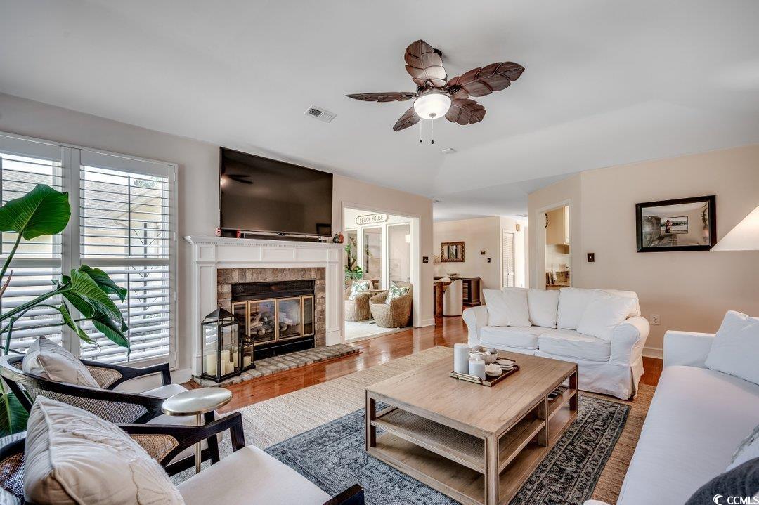 Seller is being relocated. All reasonable offers will be considered. Located in the highly sought-after and peaceful Antigua neighborhood, this beautifully maintained 3-bedroom, 2-bath home is the perfect find. The spacious great room welcomes you with smooth ceilings, hardwood floors, a cozy fireplace, and expansive windows that frame views of the large private backyard. Situated on one of the largest lots in the neighborhood, the property also features a walled in back yard and a long circular driveway for ample parking. The well-designed kitchen offers stainless steel appliances, custom cabinetry, a built-in desk and work area, granite countertops, and a stylish custom backsplash. The owners suite includes a renovated bathroom with dual vanities and a walk-in shower. Recent updates include the master bath renovation, new Velux skylights, a fresh coat of neutral interior paint, repaved back and side porches, a replaced hot water heater, and updated sliders and windows. Youll love the added convenience of storage, including a versatile attic thats ideal for holiday dcor and luggage. Outside, a dedicated storage unit gives you easy access to everyday essentials like gardening tools, sports equipment, or beach supplieskeeping everything neatly organized and within reach.This charming single-level home offers HOA-maintained lawn care and is perfectly located close to the beach, grocery stores, restaurants, shopping, entertainment, and the hospital. You can walk to Starbucks or take a quick golf cart ride/walk to the beachcoastal living at its best! Measurements and information are deemed to be correct but buyer is responsible to verify.